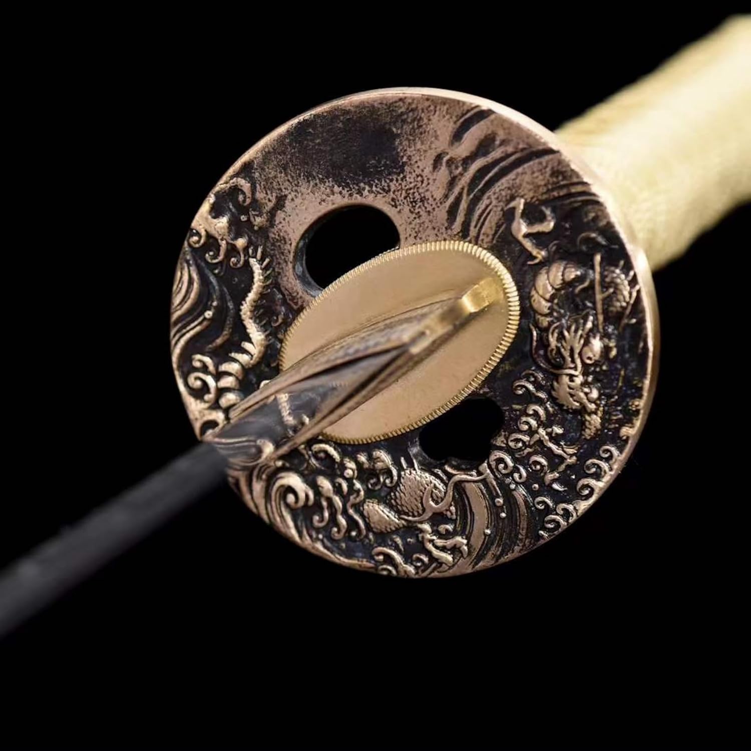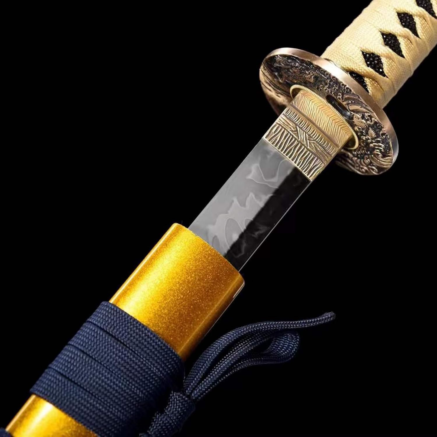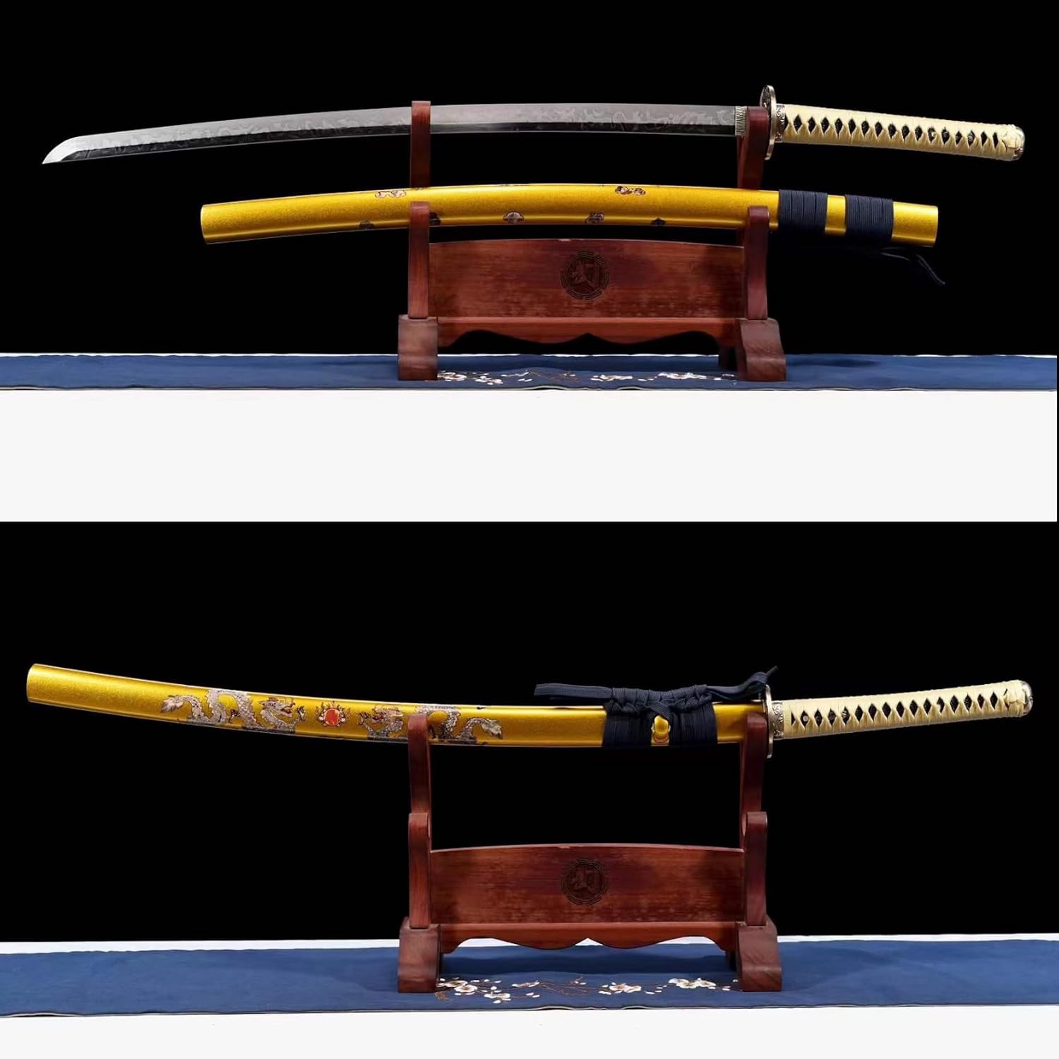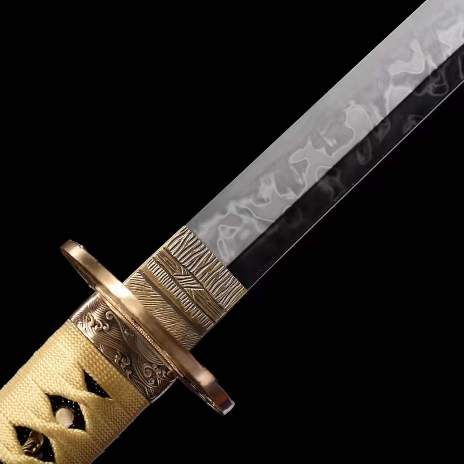 【Materiale superiore】: la lama è realizzata in acciaio T10, che è stato piegato e forgiato molte volte per garantire la perfetta combinazione di durezza e tenacità. È cotto a mano con motivi speciali utilizzando metodi antichi, il che è davvero unico e bello. Il paramano è realizzato in materiale di rame puro di alta qualità ed è inciso con motivi esclusivi. Il lussuoso fodero con motivo a drago mostra il temperamento regale della spada da samurai. 【Artigianato squisito】: questa spada da samurai si basa rigorosamente su metodi antichi, dalla selezione dei materiali alla forgiatura, dalla macinazione alla tempra. Ogni passaggio è stato accuratamente lucidato dagli artigiani assicurando che ogni coltello sia un'opera d'arte unica. Questo non è solo un coltello ma porta anche l'essenza dell'artigianato tradizionale. 【Dimensioni perfette】: lunghezza totale 103 cm, lunghezza lama 71 cm, lunghezza impugnatura 27 cm, larghezza lama 3,2 cm, peso circa 1,4 kg. Perfetta combinazione di eleganza e potenza, questa katana è stata progettata pensando all'equilibrio e alla funzionalità. Il suo design ergonomico offre una presa comoda e sicura per un controllo facile e fluido. 【Prestazioni potenti】: il bellissimo aspetto della Katana nasconde prestazioni eccellenti! La lama ha elevata durezza e tenacità. La lama può essere piegata di 90 gradi e può essere raddrizzata rapidamente. Inoltre, ha una forte resistenza alla corrosione, quindi mantiene la sua qualità e lucentezza originali sia se usato quotidianamente che se conservato per lungo tempo. 【Ampiamente usato】: questo coltello non è solo un'arma pratica, ma anche una bellissima opera d'arte perfetta da esporre. Molto adatto per regali, giochi di ruolo, Kendo, allenamento Iaido, esercizi di arti marziali, autodifesa, collezionismo, decorazioni per la casa, mostre, regali di Natale, Halloween, feste in costume, oggetti di scena, ecc.
