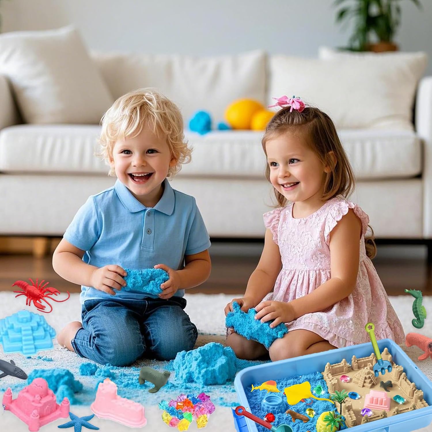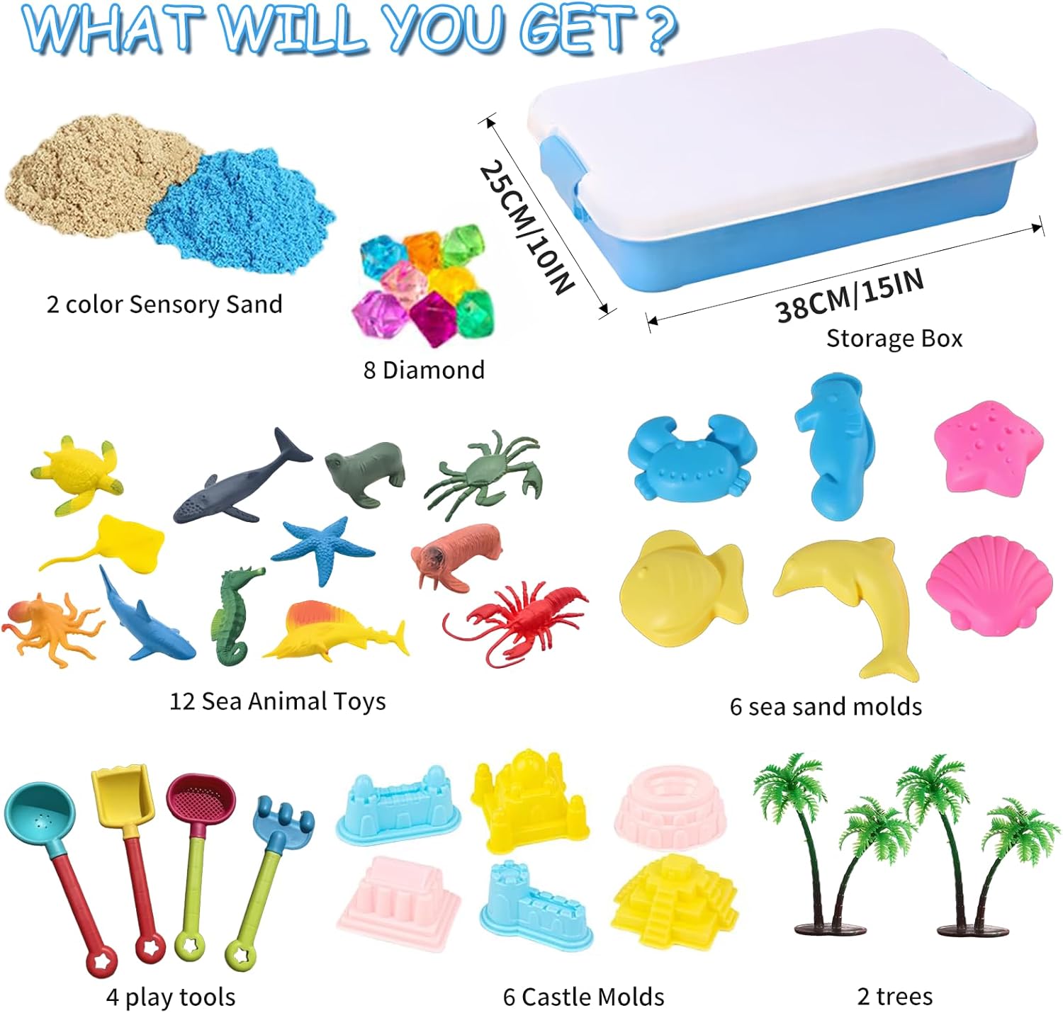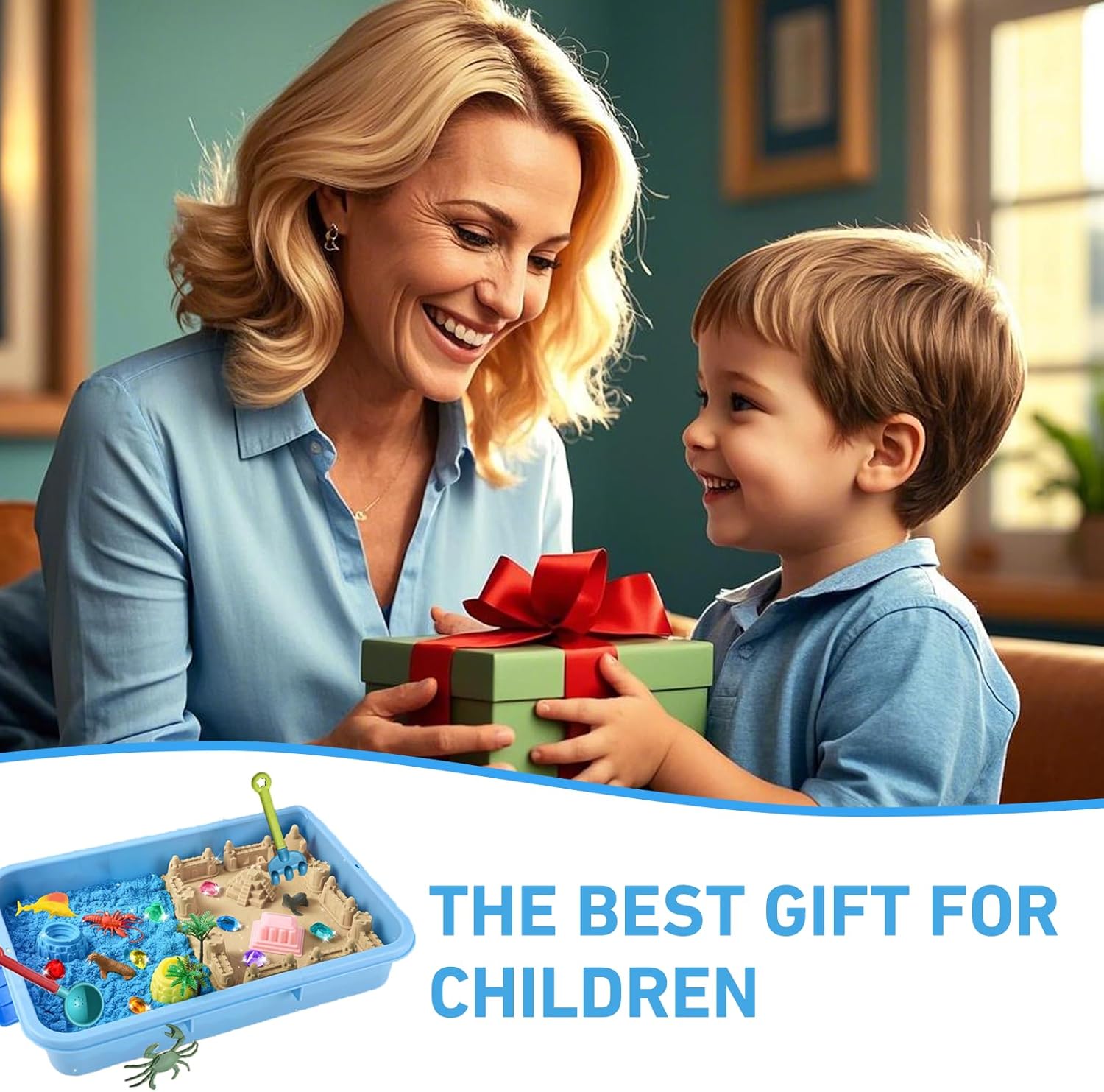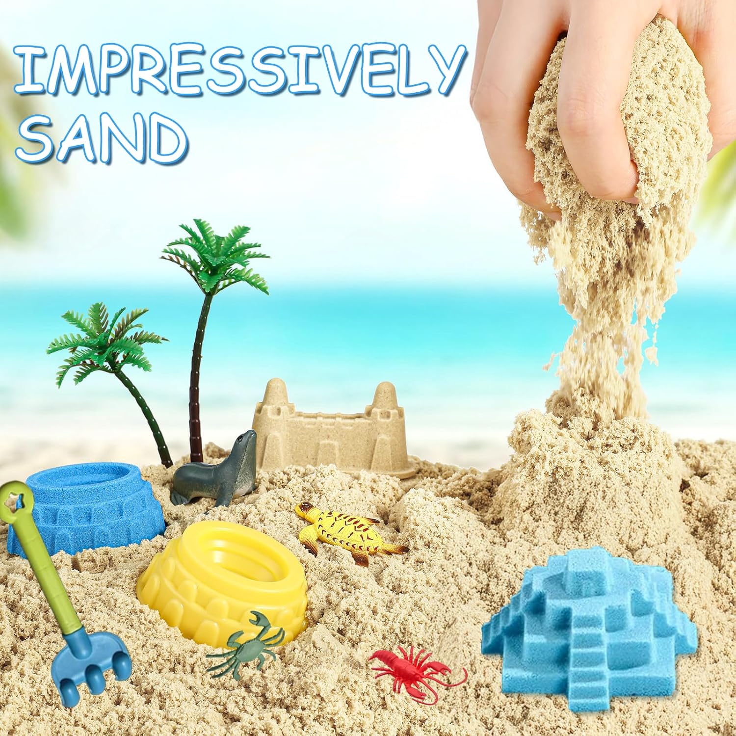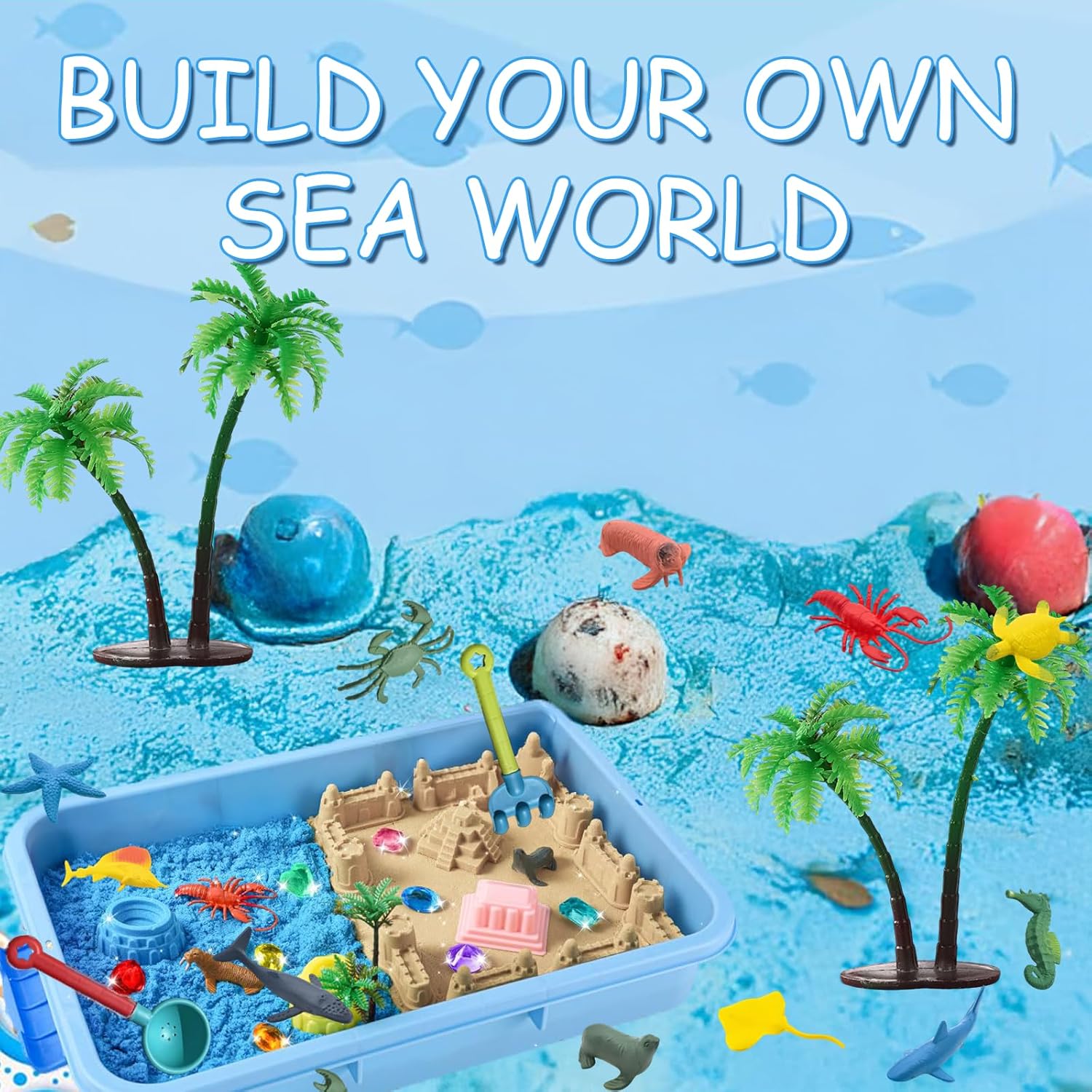 Enorme divertimento con motivi marini – Il nostro set di sabbia da gioco offre tutto il necessario per giocare fantasioso: sabbia colorata, 12 simpatici animali marini, 10 forme creative, strumenti, cristalli, alberi e una pratica sabbiera con coperchio, perfetta per i piccoli esploratori Sabbia da gioco modellabile e morbida: la sabbia Magic Sand di alta qualità rimane sempre morbida e si può modellare facilmente, senza incollare o asciugare. I bambini possono costruire castelli, creare personaggi e creare il proprio mondo sottomarino colorato – ore di divertimento garantito. Imparare giocando: con questo giocattolo educativo sensoriale, i bambini promuovono giocosamente le loro capacità motorie, immaginazione e concentrazione. Attraverso i colorati animali marini imparano anche a conoscere gli animali e sviluppano la loro creatività in modo naturale. Conservazione ordinata e pratica: grazie alla robusta sabbiera (38,5 x 25 x 8,5 cm) con coperchio abbinato, l'area di gioco rimane pulita, sia all'interno che all'esterno. Dopo aver giocato, tutte le parti possono essere riposte in modo ordinato, ideale per i viaggi o per una rapida pulizia. Idea regalo perfetta a partire dai 3 anni: questo fantastico set di sabbia da gioco entusiasma bambini e genitori. Che si tratti di compleanno, Natale o semplicemente di tanto in tanto, regala ai bambini un divertimento creativo lontano dagli schermi.