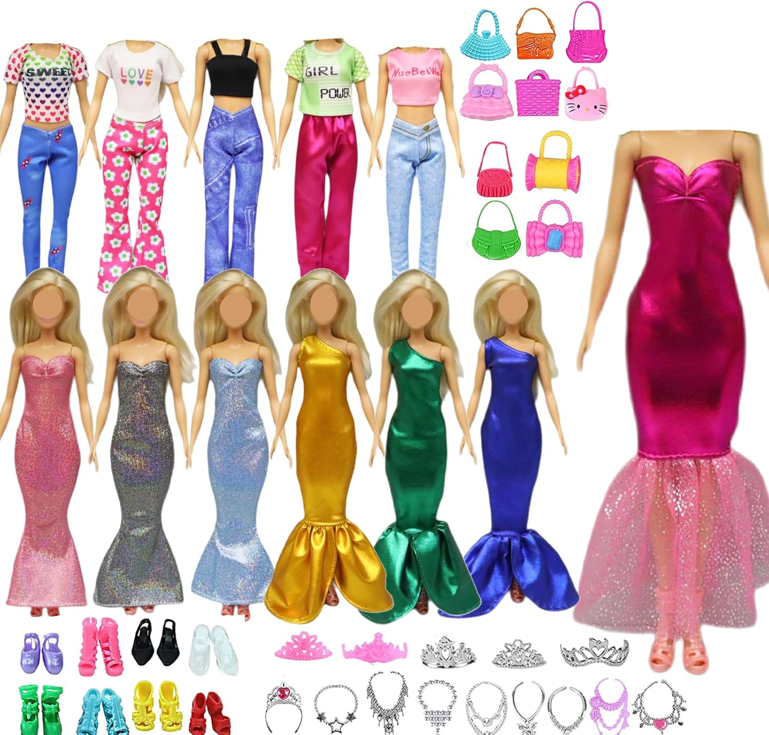 Il nostro set comprende 3 abiti alla moda, 3 top, 3 pantaloni, 10 paia di scarpe, 15 accessori, per un totale di 34 pezzi (esclusi i polsini)