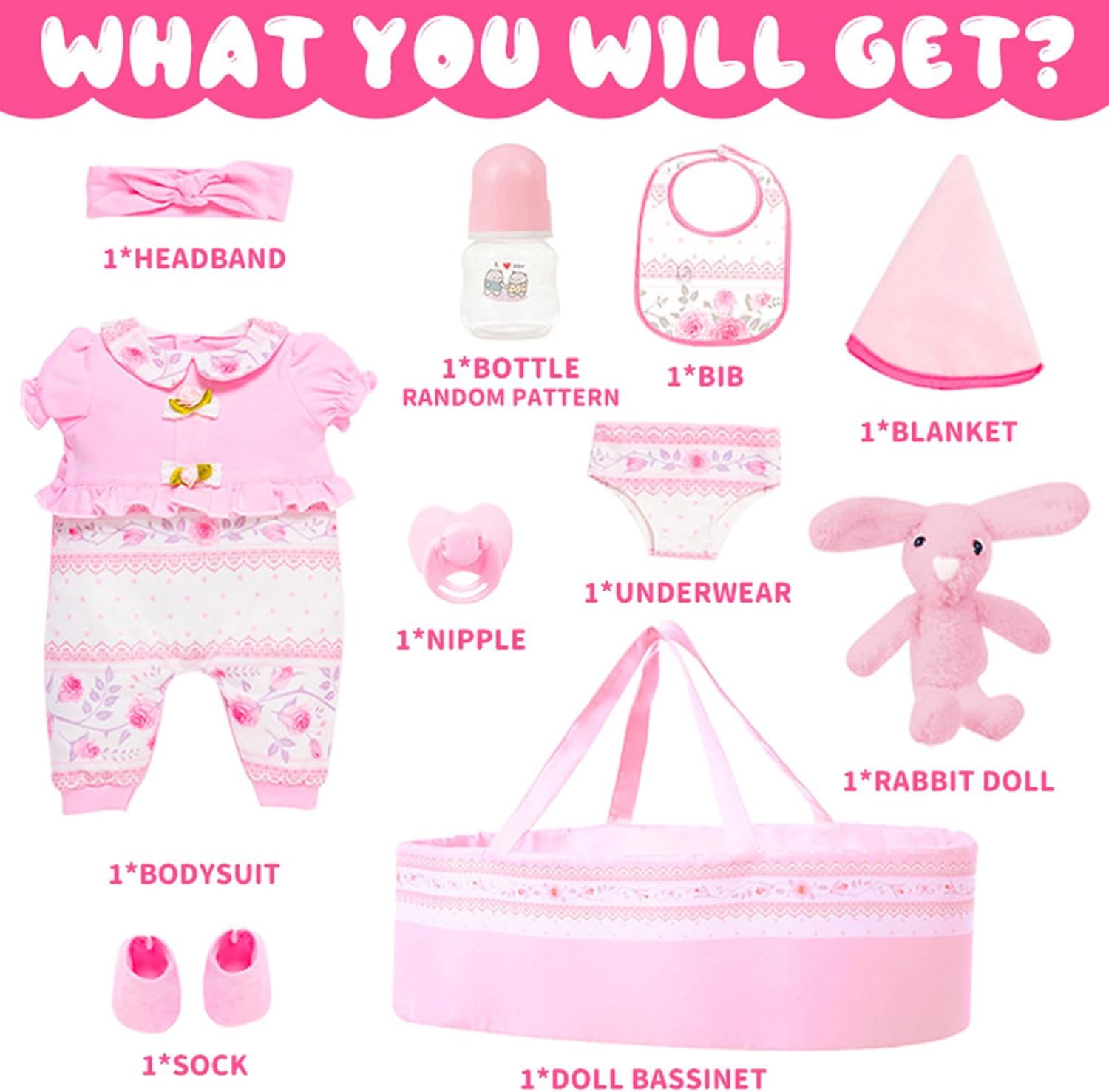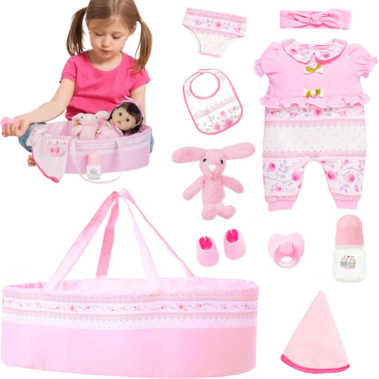 Perfetto per il gioco di finzione: ideale per i bambini piccoli che amano il gioco di finzione, questo set migliora i tempi di gioco interattivi..L'adorabile culla funge da spazio accogliente per le bambole, migliorando l'esperienza realistica. Ottima opzione: questo delizioso set è perfetto per compleanni, vacanze o occasioni speciali..È un'idea premurosa per i più piccoli, che incoraggia ore di divertimento e di narrazione fantasiosa attraverso il gioco. Materiali morbidi e sicuri: realizzati con tessuti atossici e di qualità, questi vestiti e accessori per bambole sono sicuri per i bambini di tutte le età, garantendo un gioco senza preoccupazioni con texture morbide e delicate al tatto. Set completo da gioco per bambole: il set di vestiti e accessori per bambole da 18 pollici include tutto ciò di cui il tuo bambino ha bisogno per un gioco fantasioso, con una graziosa culla e morbidi abiti di stoffa per bambole (senza bambola). Incoraggia l'immaginazione: questo set da gioco ispira la creatività e il gioco di ruolo..I bambini possono impegnarsi in scenari educativi, promuovendo abilità sociali mentre prendono cura delle loro bambole in vari contesti fantasiosi.