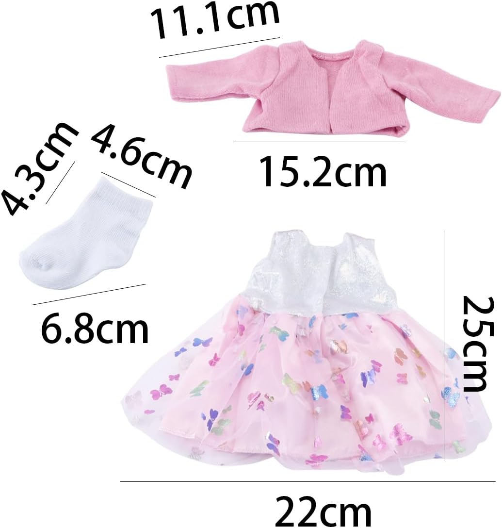 Riceverai: vestiti per le bambole, inclusa una giacca viola, una gonna di lana, un paio di calzini e una fascia per capelli con fiocco (senza bambola). Il vestito della bambola è rosa e bianco, con un motivo a farfalle che si adatta perfettamente all'atmosfera festosa. È trendy, dinamico ed elegante. Tessuto sicuro: questo set di vestiti per bambole è realizzato in tessuto morbido e di qualità, con cuciture strette e tagli netti, nessun danno alla pelle. Lascia che i più piccoli giochino liberamente e con piacere. Facile da indossare: i vestiti per bambole sono autoadesivi appositamente progettati per i più piccoli, così potranno indossarli e toglierli facilmente e scoprire il divertimento di abbinare vestiti e vestire le bambole. Regalo dei desideri: con il loro design adorabile, gli accessori per bambole sono particolarmente adatti come regali per le ragazze in occasione di compleanni, feste come Natale, Ringraziamento e celebrazioni e soddisfano l'idea dei giovani di vestire la bambola come una principessa. Misura bambola adatta: questi vestiti sono adatti per bambole da 45 cm. La loro elasticità consente loro di adattarsi a bambole di diversi tipi di corporatura.