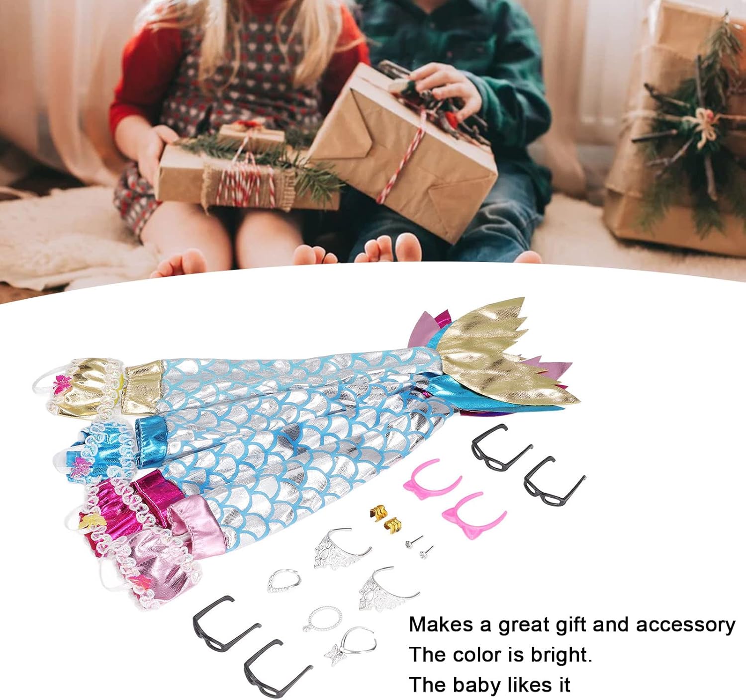 Divertente e pedagogico: questo set di vestiti per bambole aiuta i bambini a sviluppare il loro senso di abbigliamento e ad allenare le dita. Aspetto brillante: questo abito da principessa sirena è molto brillante e accattivante, con una splendida lucentezza alla luce del sole che dà vita alla principessa sirena. Migliore: questo set di vestaglie per bambole è sicuramente il miglior giocattolo da regalare ai bambini. Il bellissimo aspetto può sicuramente farti piacere. Splendido set: questo set include 4 set di splendidi abiti da sirena principessa, 2 paia di orecchini e 2 paia di corone con cui è possibile creare una bella principessa sirena. Rapporto applicabile: 1:12. Questo vestito da principessa sirena brillante per la casa delle bambole è un accessorio perfetto per la tua casa dei giocattoli.