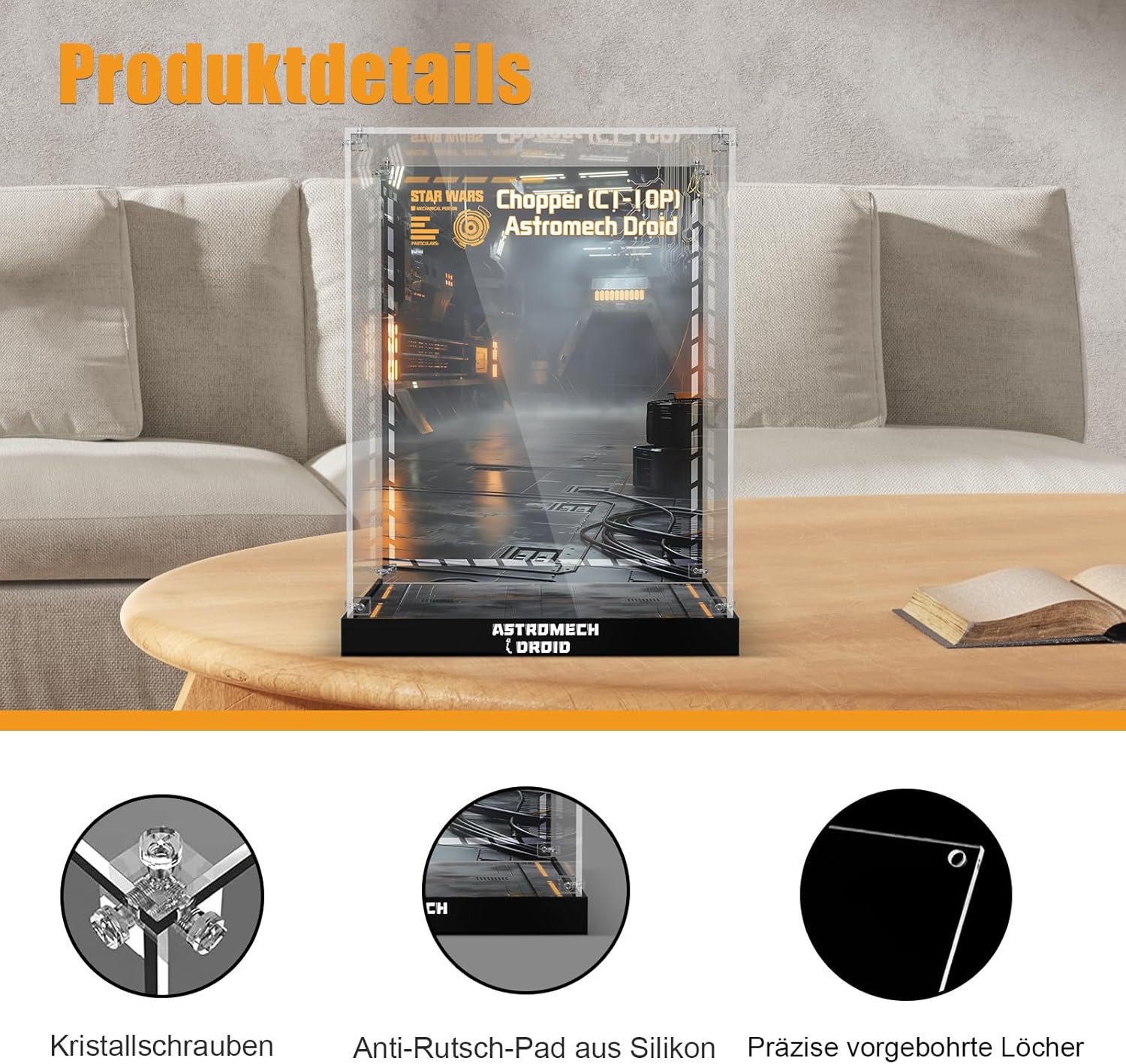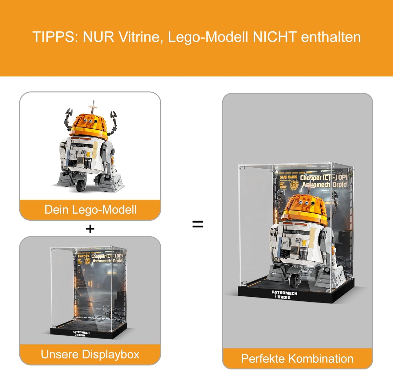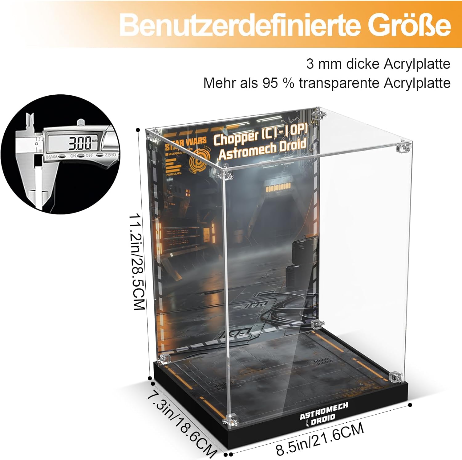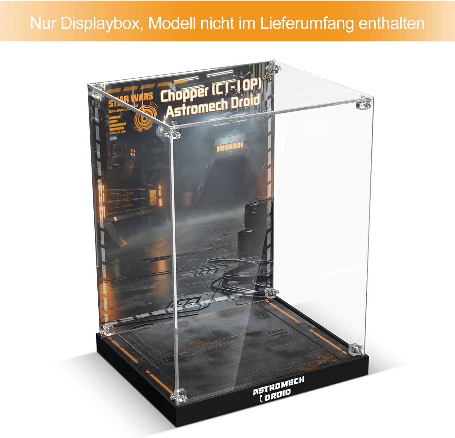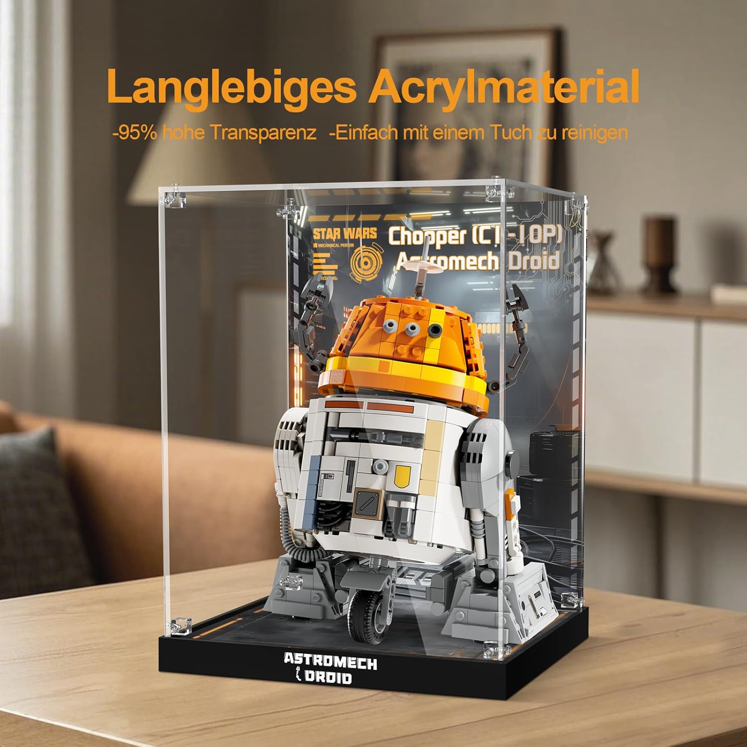 Appositamente progettata per 75416: con pannello posteriore stampato in HD e dimensioni personalizzate, la nostra vetrina in acrilico si abbina perfettamente al tema del tuo amato modello 75416 Chopper (C1-10P) Astromech Droid. Il design elegante e minimalista e l'aspetto trasparente creano uno straordinario effetto visivo che si integra perfettamente in qualsiasi ambiente. PROTEZIONE E ANTIPOLVERE: questa scatola espositiva protegge i tuoi elementi costitutivi da polvere, umidità e danni mantenendo l'integrità e garantendo la perfetta presentazione dei modelli 75416. Non ingiallisce facilmente ed è molto facile da pulire. Materiale di alta qualità: dotata di pannelli acrilici di alta qualità spessi 3 mm, base spessa 2 cm e viti in cristallo con dadi, la vetrina ha trasparenza ad alta definizione ed eccellente resistenza agli urti, che rende la visione più realistica e garantisce anche un'eccellente durata e stabilità. MULTIUSO - Questa vetrina acrilica è perfetta per raccogliere, conservare ed esporre i blocchi Droid Astromeccanico 75416 Chopper (C1-10P) e altri modelli di blocchi simili o di dimensioni più piccole. Anche un ottimo regalo per i collezionisti di modellini di costruzioni e una bella decorazione per la casa, l'ufficio o dove preferisci. SOLO LA VETRINA: Tieni presente che è in vendita solo la vetrina in acrilico. Il modello e gli elementi costitutivi non sono inclusi. Tutti i modelli di elementi costitutivi nelle immagini sono di riferimento. Ci impegniamo a fornire ai nostri clienti prodotti eccezionali e un servizio di qualità. Se avete domande, non esitate a contattarci.