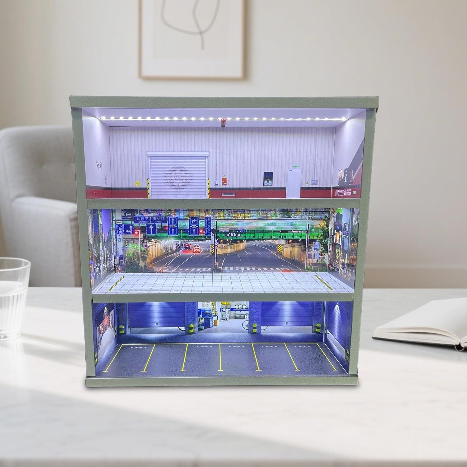 Vetrina per Modellini di Auto Organizzatore Diorama Garage Scatola di Stoccaggio Espositore per Collezioni con Luce LED Adatto per Decorazione Domesti, Style D
