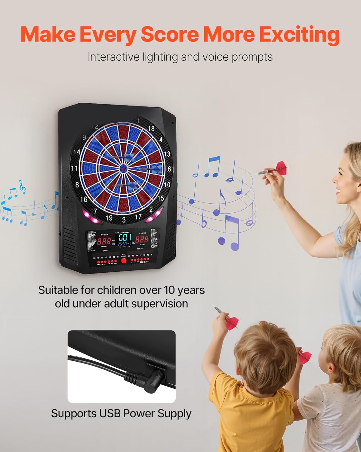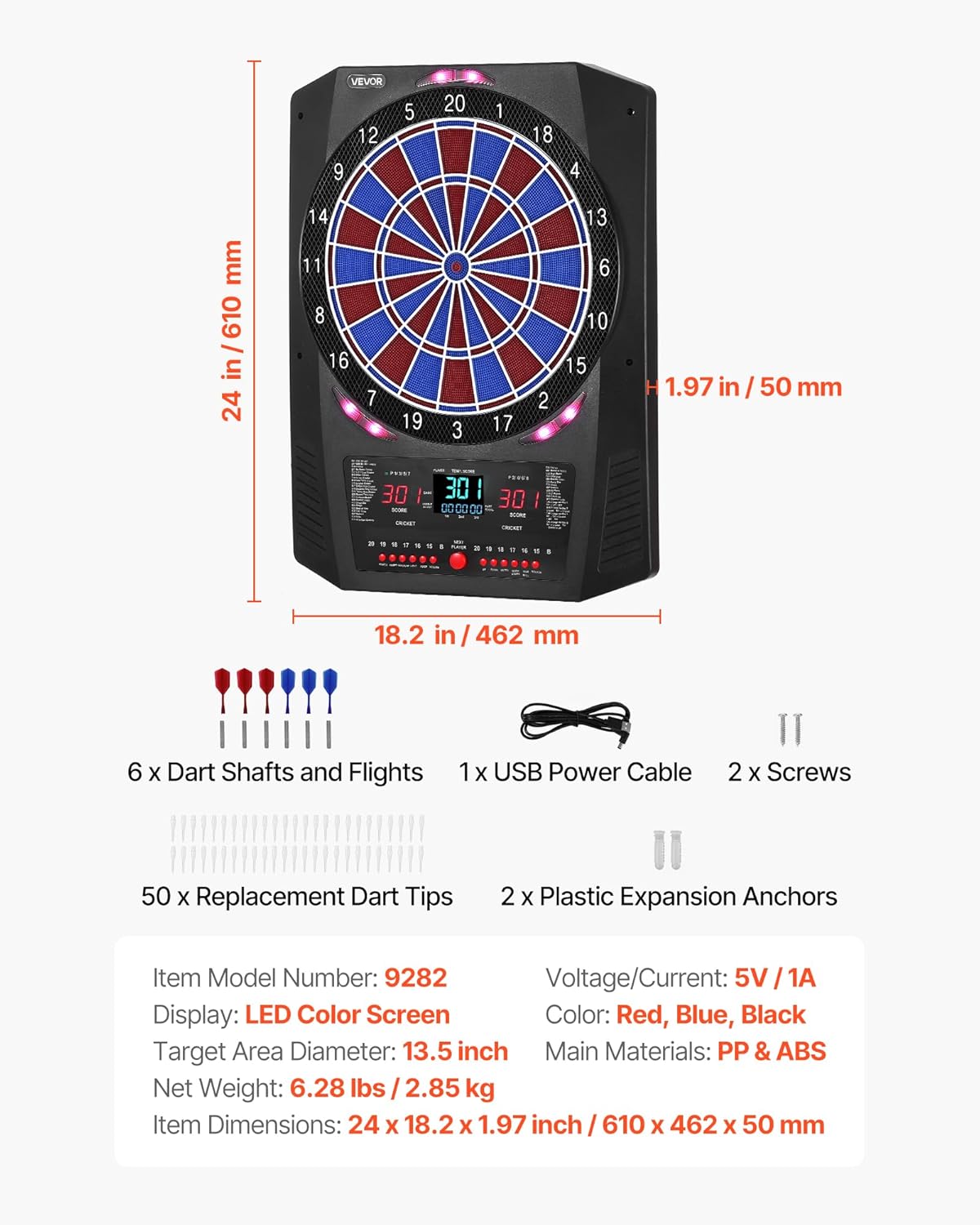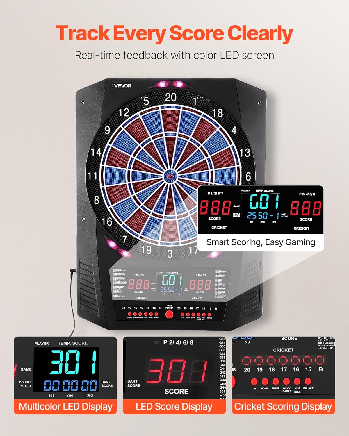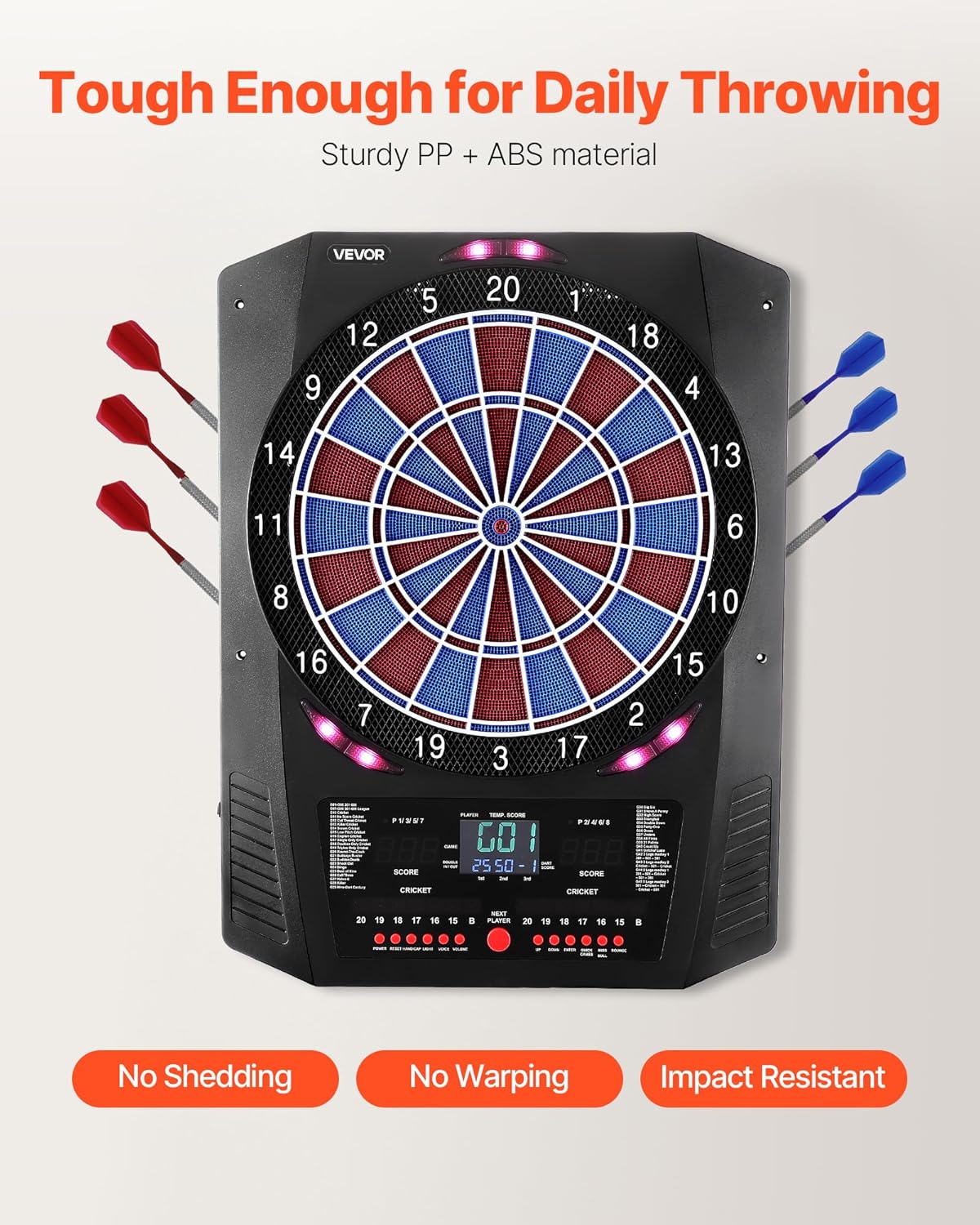 Divertimento senza fine: goditi il gioco al massimo con questo bersaglio elettronico, precaricato con 45 modalità di gioco, che offre fino a 474 combinazioni di gioco. Supporta fino a 8 giocatori, per riunioni di famiglia, intrattenimento in ufficio Rimbalzo ridotto: il bersaglio elettronico per freccette presenta un design a nido d'ape con bordi finemente suddivisi per migliorare la percentuale di colpi e ridurre al minimo il rimbalzo. In combinazione, consente un gioco sicuro Tieni traccia di ogni punteggio in modo chiaro: dotato di più display LED per il punteggio su entrambi i lati e due tabelloni segnapunti XO per il cricket. Le funzionalità integrate includono effetti di illuminazione interattivi, opzione bullseye 25/50 o 50/50 Facile da usare e da installare: include 6 aste e alette per freccette, 50 punte di ricambio per freccette, 1 cavo di alimentazione USB, 2 tasselli di espansione in plastica, 2 viti e un manuale utente. Nessuna configurazione complicata Durevole da usare: con dimensioni di 610 x 462 mm e un'area bersaglio di 336 mm, questo bersaglio elettronico è realizzato in plastica PP + ABS ad alta resistenza. Offre una superficie stabile che resiste all'usura, per l'allenamento quotidiano
