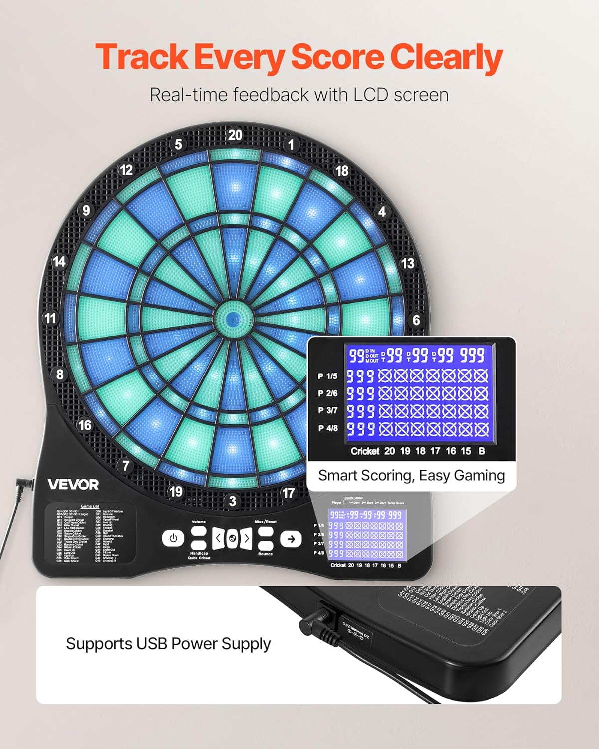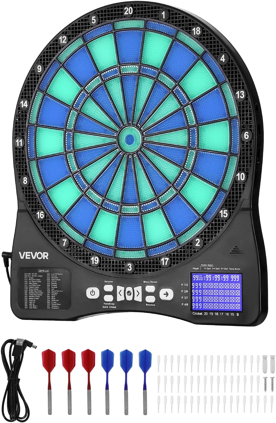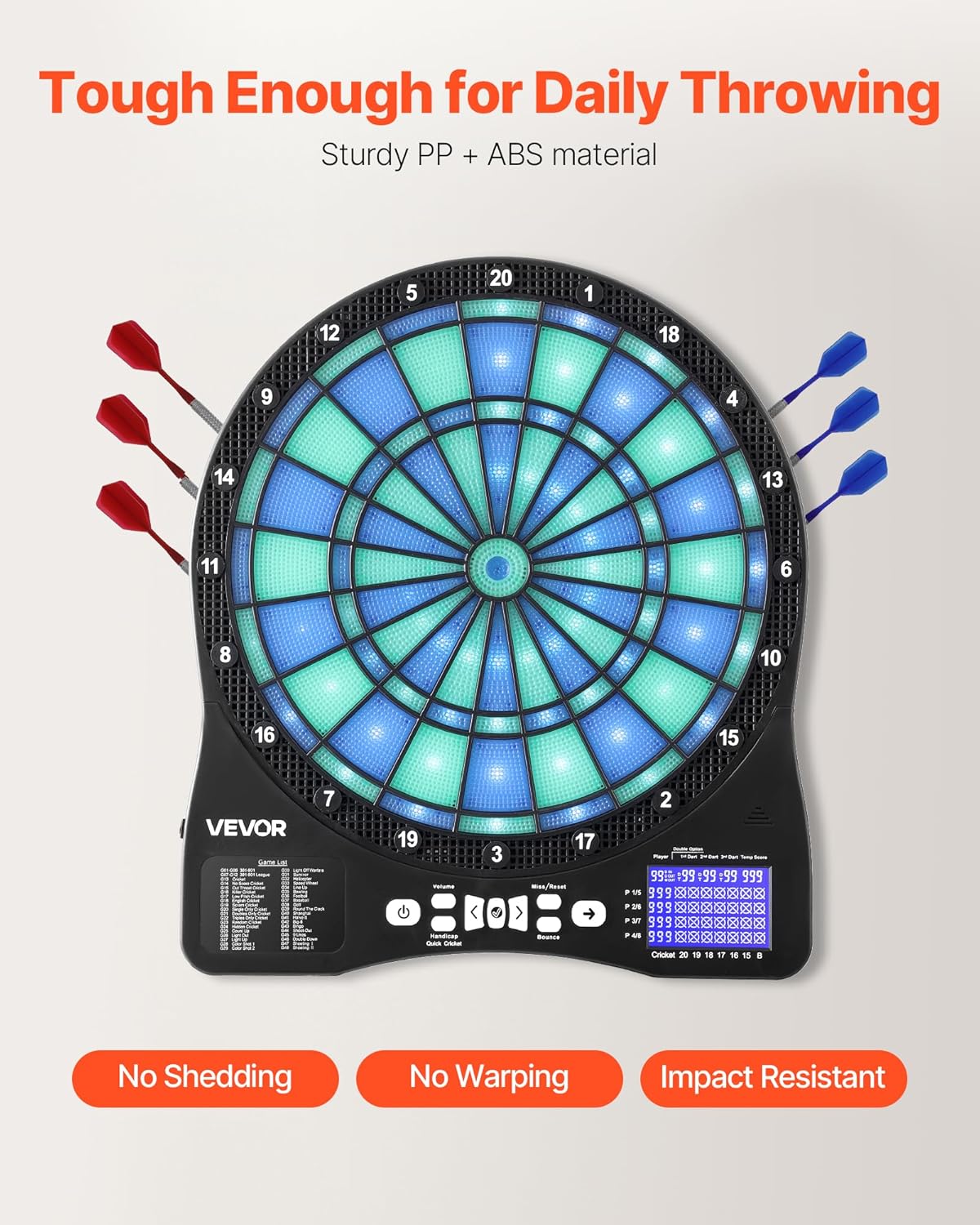 Gameplay versatile: goditi il gioco al massimo con questo bersaglio elettronico, precaricato con 48 modalità di gioco come Cricket e Count-Up, che offre oltre 500 combinazioni di gioco. Supporta fino a 8 giocatori, per riunioni di famiglia, intrattenimento Rimbalzo ridotto: il nostro bersaglio elettronico per freccette presenta un design a nido d'ape con bordi finemente suddivisi per migliorare la percentuale di colpi e ridurre al minimo il rimbalzo Tieni traccia di ogni punteggio in modo chiaro: questa superficie bersaglio è dotata di illuminazione a LED integrata per una mira precisa anche in condizioni di scarsa illuminazione. Lo schermo LCD mostra i punteggi in tempo reale Facile da usare: include 6 aste e alette per freccette, 50 punte di ricambio per freccette, 1 cavo di alimentazione USB, 2 tasselli di espansione in plastica, 2 viti e un manuale utente. Nessuna configurazione complicata: basta montarlo e giocare Durevole da usare: con dimensioni di 450 x 397 mm e un'area bersaglio di 340 mm, questo bersaglio elettronico è realizzato in plastica PP + ABS ad alta resistenza. Offre una superficie stabile che resiste all'usura, per l'allenamento quotidiano