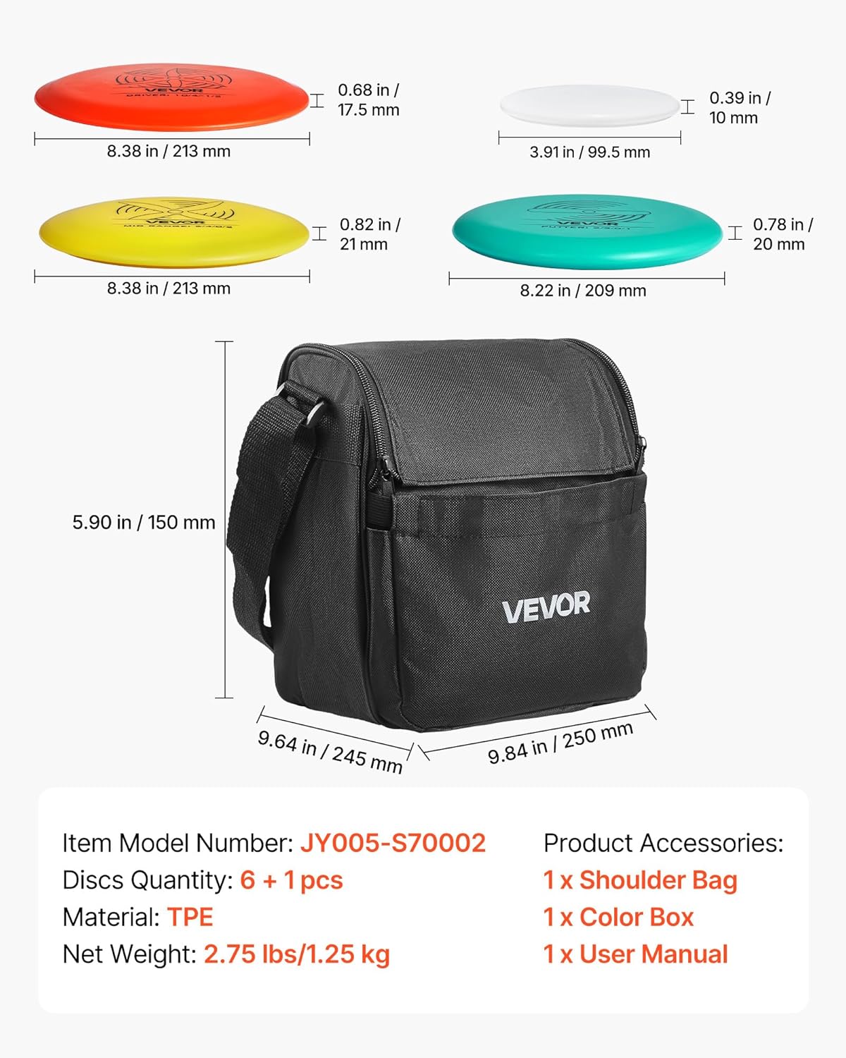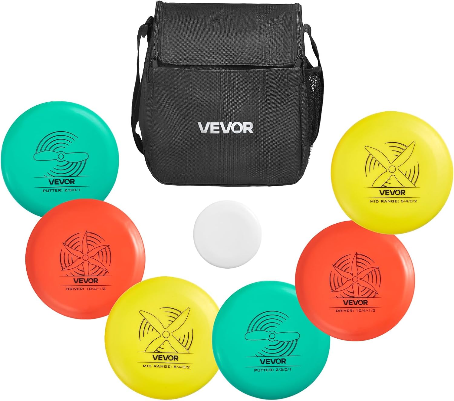 6 + 1 dischi inclusi: questo set da disc golf include 6 + 1 dischi con diverse caratteristiche di volo per adattarsi agli stili di lancio. Che tu sia un principiante o un giocatore esperto, questo set ti aiuterà a giocare con sicurezza e controllo Resistenti: realizzati in materiale TPE di alta qualità, questi dischi offrono elevata elasticità e prestazioni durature. Resistono a forti urti e mantengono la loro forma senza deformarsi o rompersi Facile da organizzare: lo zaino è dotato di tasche integrate per segnapunti, penne e altri piccoli oggetti. Che si tratti di tornei o di allenamenti quotidiani, ha spazio per tutta la tua attrezzatura Grafica e scritte chiare: ogni disco presenta disegni e testi stampati per aiutare i principianti a comprendere rapidamente le basi del disc golf. Adatto sia ai giocatori alle prime armi che a quelli esperti che desiderano migliorare le abilità Versatile per qualsiasi ambiente: questo set da disc golf con sacca è ideale per una varietà di ambienti esterni. Ideale per l'uso su erba, sabbia, nei parchi o direttamente in giardino. Divertiti con il disc golf ovunque tu sia