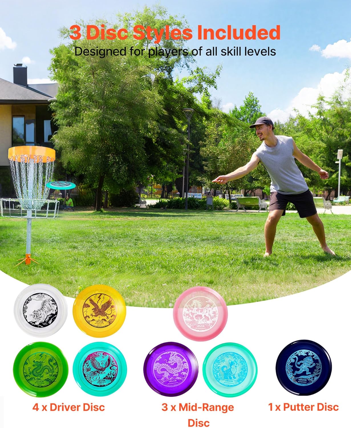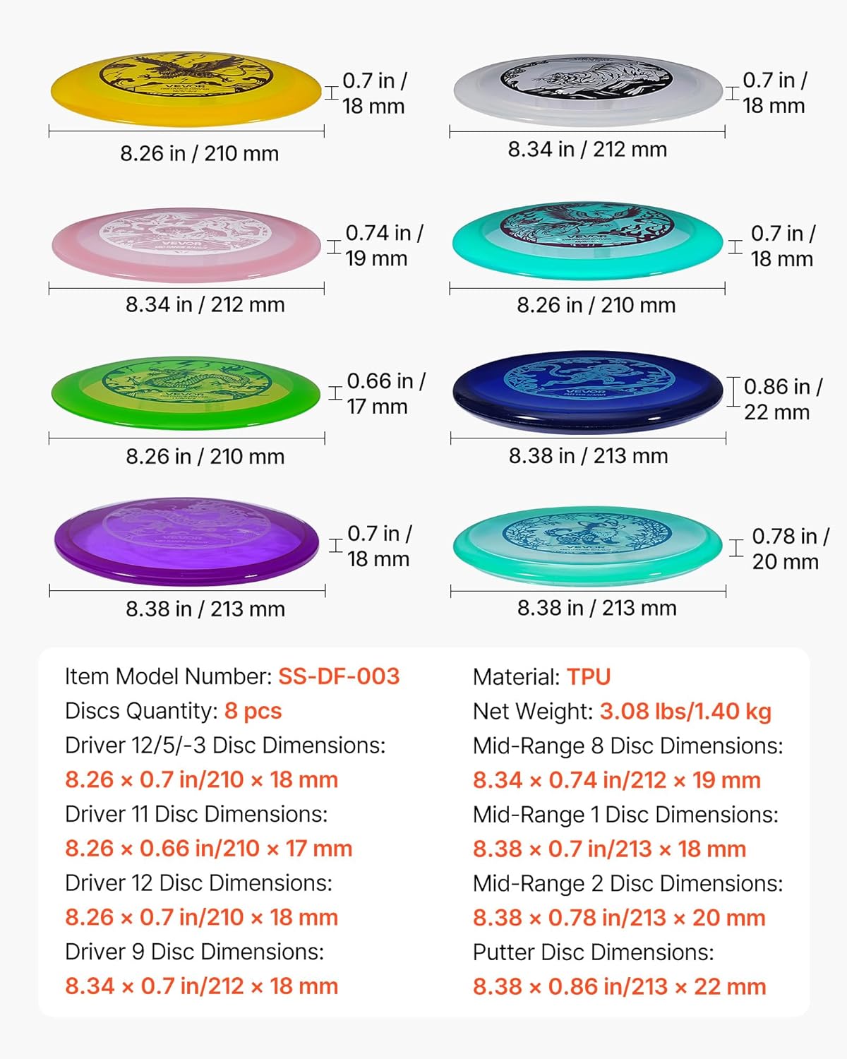 8 dischi, tutto il necessario per giocare: questo set da disc golf include 8 dischi ben progettati. I principianti possono iniziare facilmente e divertirsi con il disc golf, mentre i giocatori più esperti possono migliorare le proprie abilità Resistenti: realizzati in materiale TPU di alta qualità, questi dischi offrono elevata elasticità e prestazioni durature. Possono resistere a forti urti e mantenere la loro forma senza deformarsi o rompersi Allenamento di forza per tutto il corpo: i lanci di dritto e rovescio coinvolgono i muscoli della parte superiore del corpo, mentre le rotazioni di tutto il corpo attivano più gruppi muscolari Grafica e scritte chiare: ogni disco presenta disegni e testi stampati per aiutare i principianti a comprendere le basi del disc golf. Adatto sia ai giocatori alle prime armi che a quelli esperti che desiderano migliorare le proprie abilità Versatile per qualsiasi ambiente: questo set è ideale per una varietà di ambienti esterni. Ideale per l'uso su erba, sabbia, nei parchi o direttamente nel tuo giardino. Divertiti con il disc golf ovunque tu sia