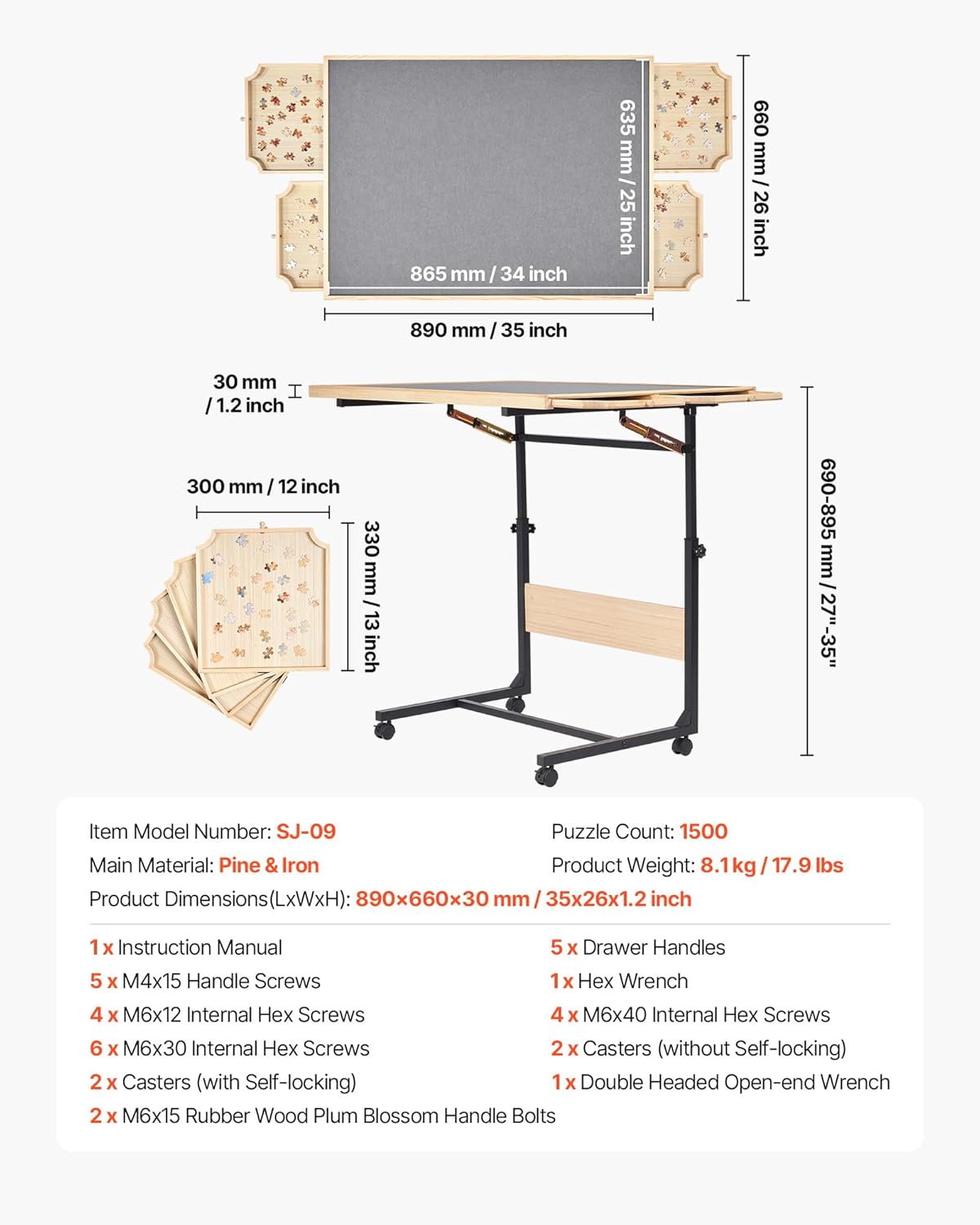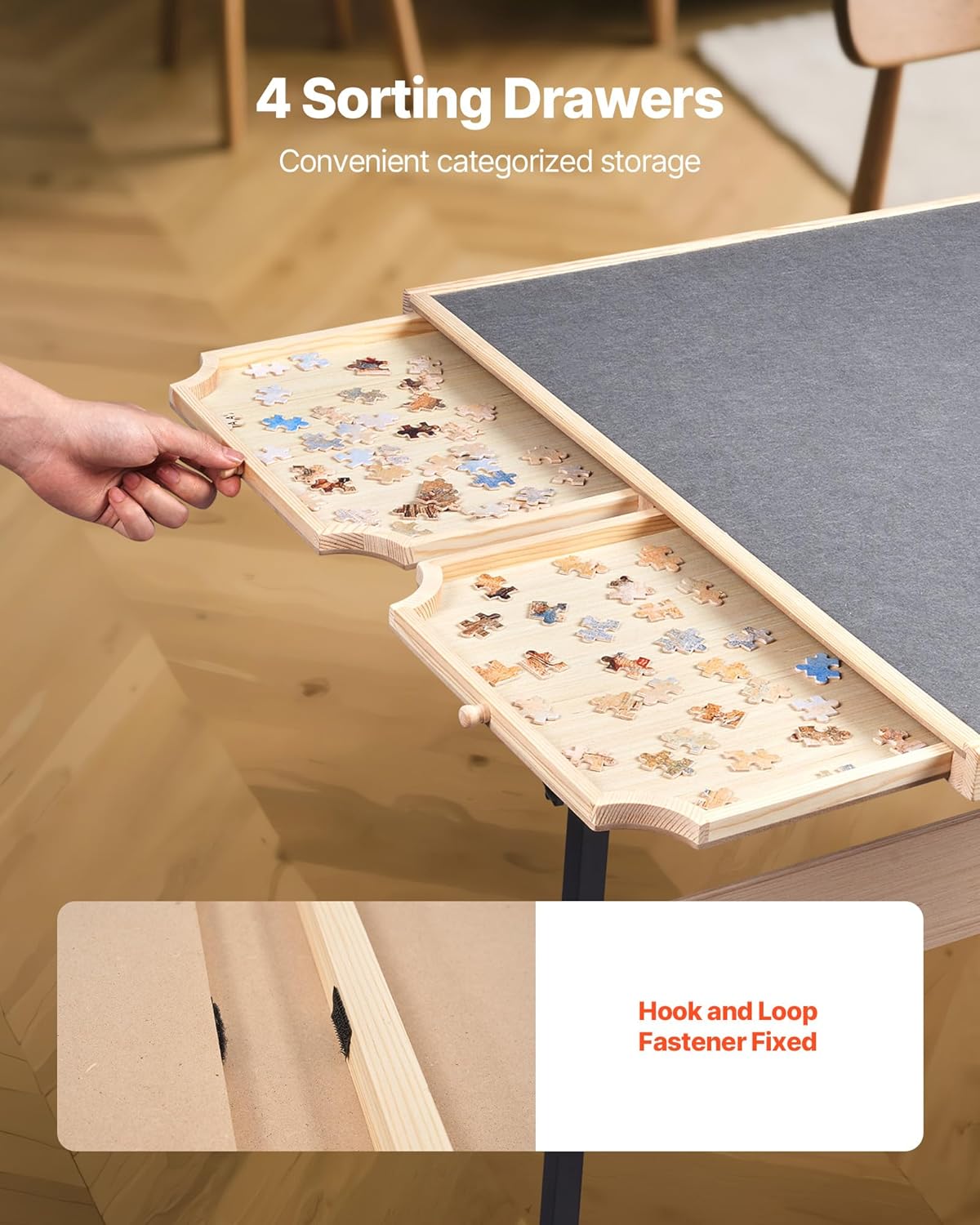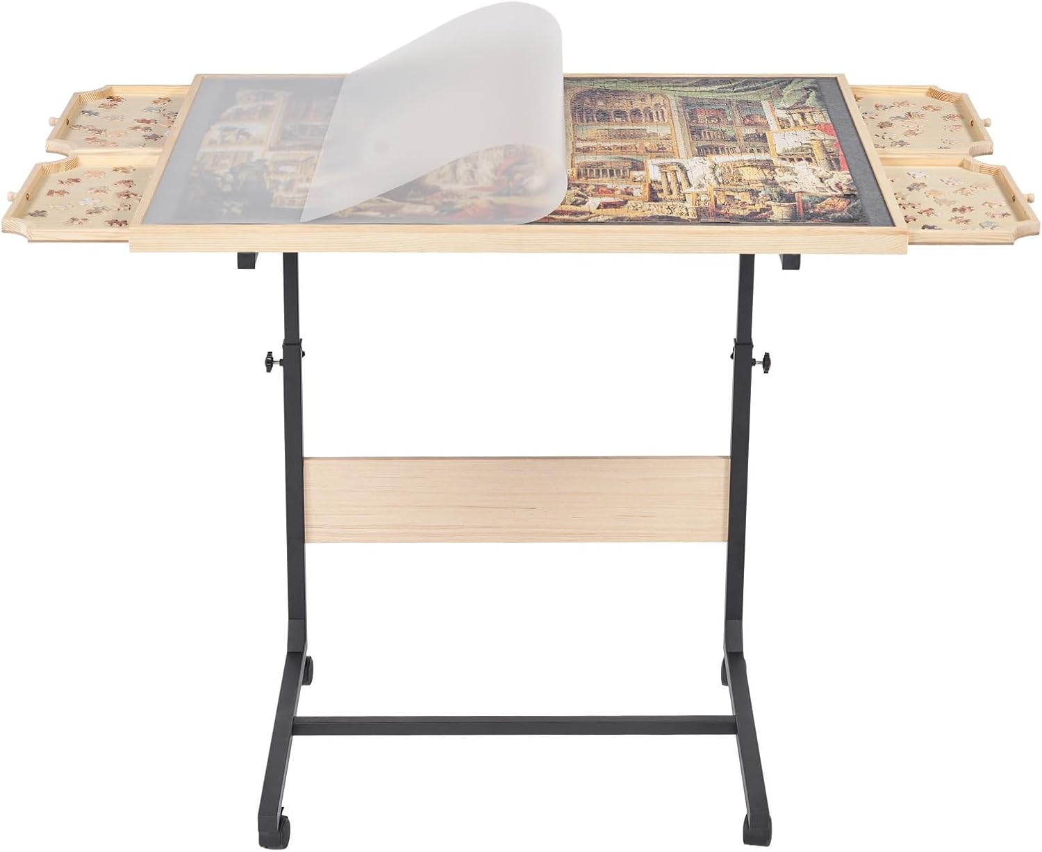 Set da tavolo standard per puzzle: il nostro set da tavolo per puzzle da 1500 pezzi ha dimensioni complessive di 890 x 660 x 30 mm / 35 x 26 x 1,2 pollici, con un'area puzzle di 865 x 635 mm / 34 x 25 pollici Altezza regolabile e piano del tavolo inclinabile: l'altezza del tavolo da puzzle è regolabile su quattro livelli e il piano del tavolo è inclinabile. Questo ti permette di lavorare al tuo puzzle in una posizione comoda e seduta Multiuso: il piano del tavolo a forma di puzzle è realizzato in legno di pino naturale e le robuste gambe in metallo sono rinforzate con 4 cerniere metalliche per facilitarne la piegatura Design intuitivo: i 4 cassetti scorrevoli facilitano la conservazione e l'organizzazione dei pezzi del puzzle. Il gancio e l'asola mantengono saldamente i cassetti chiusi sul piano di gioco Copertura utile: lavorare su un puzzle di grandi dimensioni è un progetto a lungo termine e la copertura trasparente in PP aiuta a proteggere le sezioni completate del puzzle durante le pause