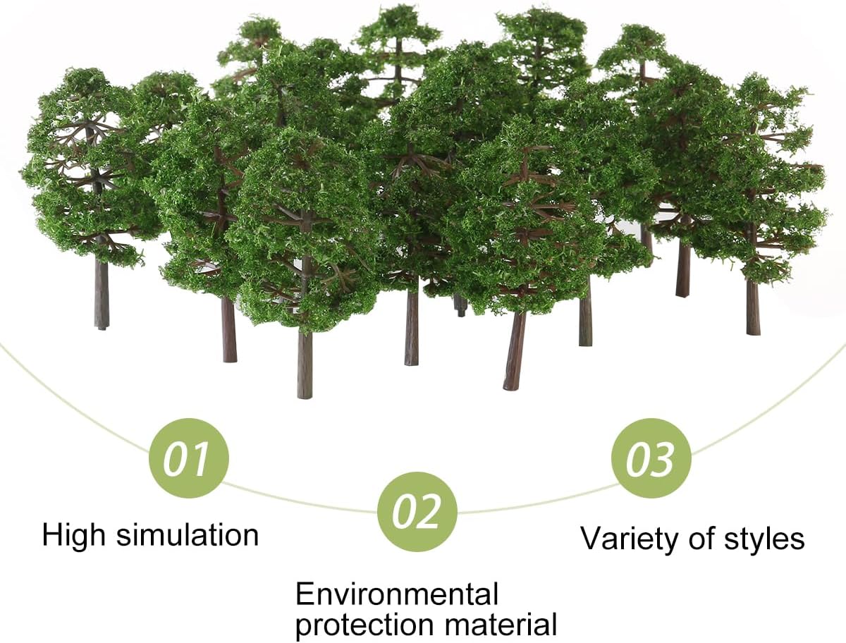 Design realistico: realizzati con precisione, questi alberi modello verde scuro da 9 cm replicano la vegetazione naturale, rendendoli perfetti per valorizzare modelli architettonici e paesaggi panoramici Ideale per la creatività: che si tratti di modellismo professionale o di progetti fai da te personali, questi alberi verdi da giardino offrono infinite opportunità di espressione creativa Materiale durevole: realizzati in plastica, questi alberi modello sono leggeri ma robusti, il che li rende adatti a vari scopi decorativi e di modellismo Applicazione versatile: perfetti per decorare modellini di ferrovie, layout architettonici o diorami, questi alberi aggiungono un tocco realistico a qualsiasi paesaggio in miniatura Dimensioni compatte: ogni albero misura circa 9 cm di altezza, il che li rende adatti ai modelli in scala HO e facili da integrare in progetti su piccola scala