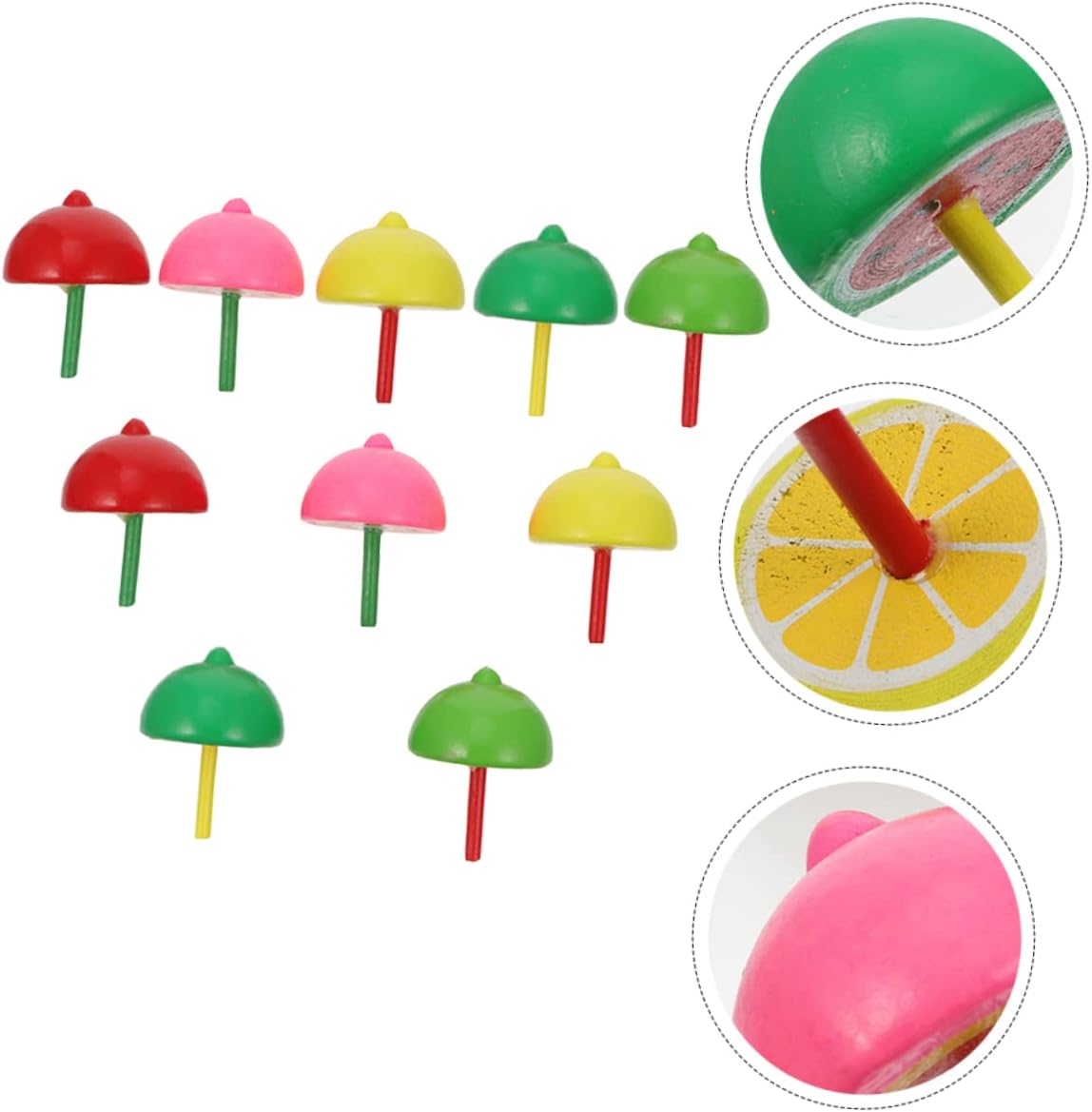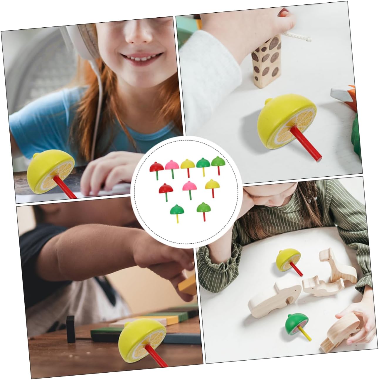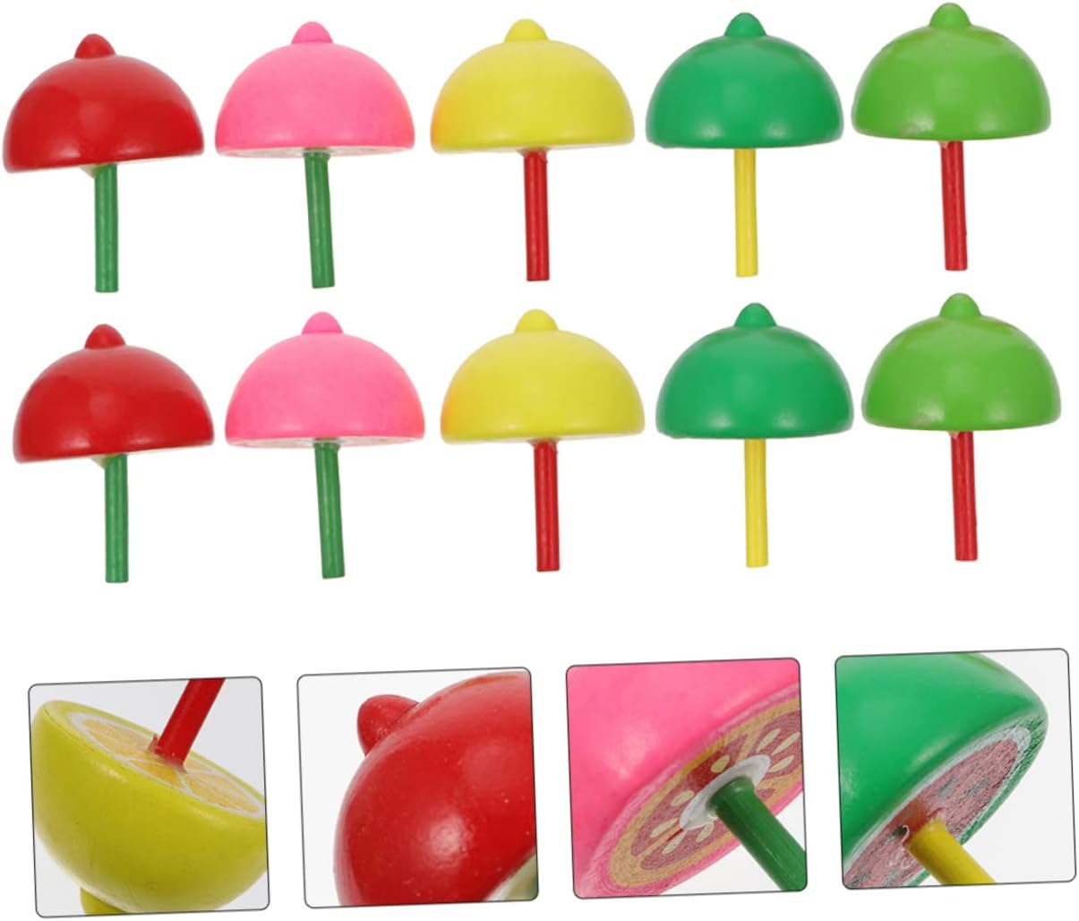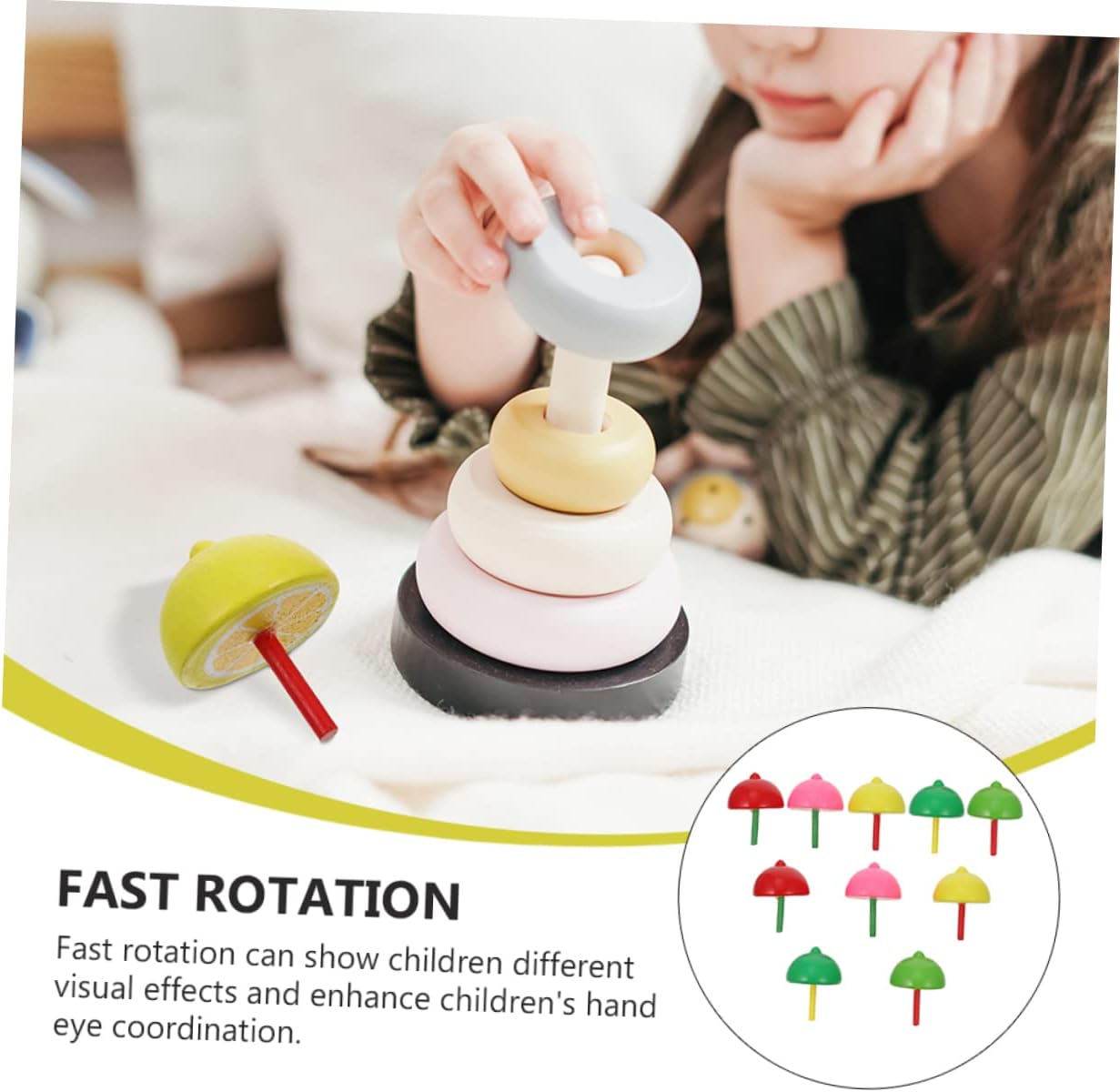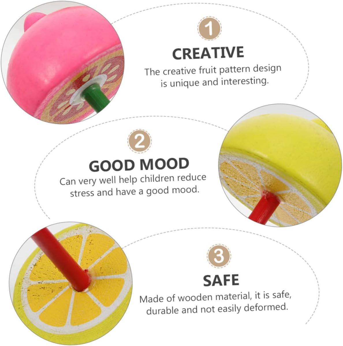 Giocattoli: la trottola gira velocemente, può offrire ai bambini un divertimento visivo diverso e stimolare la loro capacità di pensiero e creatività. con picchetti: il design creativo del modello di frutta è unico e interessante, che può attirare molto bene l'attenzione dei bambini. in cima: può benissimo aiutare i bambini e il buon umore. Piani con picchetti in legno: la lavorazione è buona, la consistenza è buona e il tocco è confortevole, garantendo la sicurezza dei bambini. Giocattolo educativo per bambini: realizzato in materiale di legno, è sicuro e deforma facilmente.
