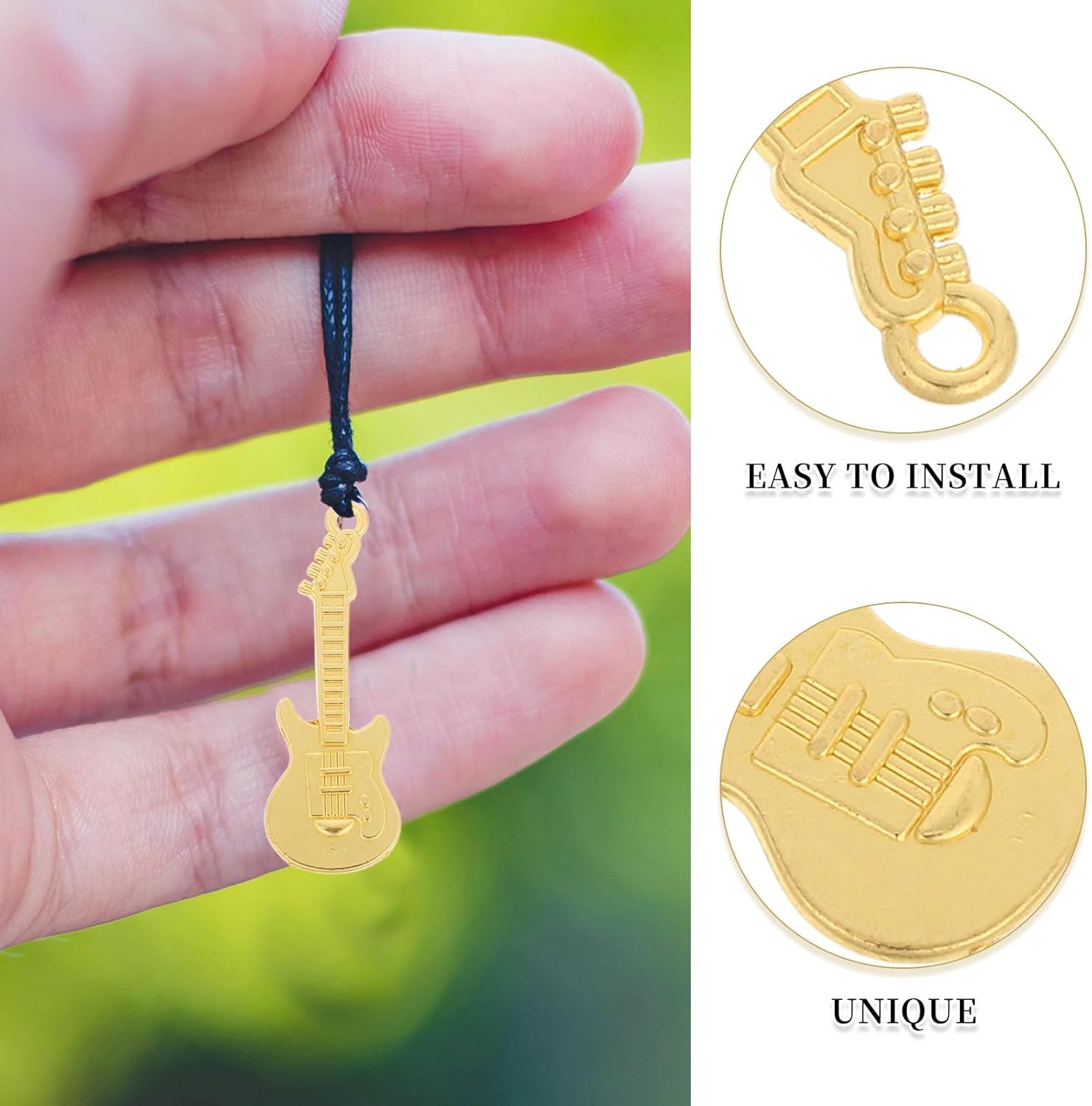 Design artistico: questi ciondoli a forma di chitarra artistica presentano dettagli intricati che li rendono un accessorio eccezionale per gli amanti della musica e per coloro che apprezzano i design unici Struttura resistente: realizzati in lega di zinco, questi ciondoli rustici per strumenti sono progettati per resistere all'usura quotidiana, garantendo che rimangano un accessorio utile Adatto come regalo: questi ciondoli in lega a tema musicale sono regali premurosi per musicisti, appassionati di musica o chiunque i gioielli creativi Leggero e portatile: il design leggero di questi portachiavi musicali li rende facili da trasportare e indossare, aggiungendo un tocco di stile musicale a qualsiasi outfit Ampia compatibilità: questi ciondoli in metallo per chitarra sono adatti a vari progetti fai da te, tra cui collane, braccialetti, orecchini e portachiavi, offrendo infinite possibilità creative