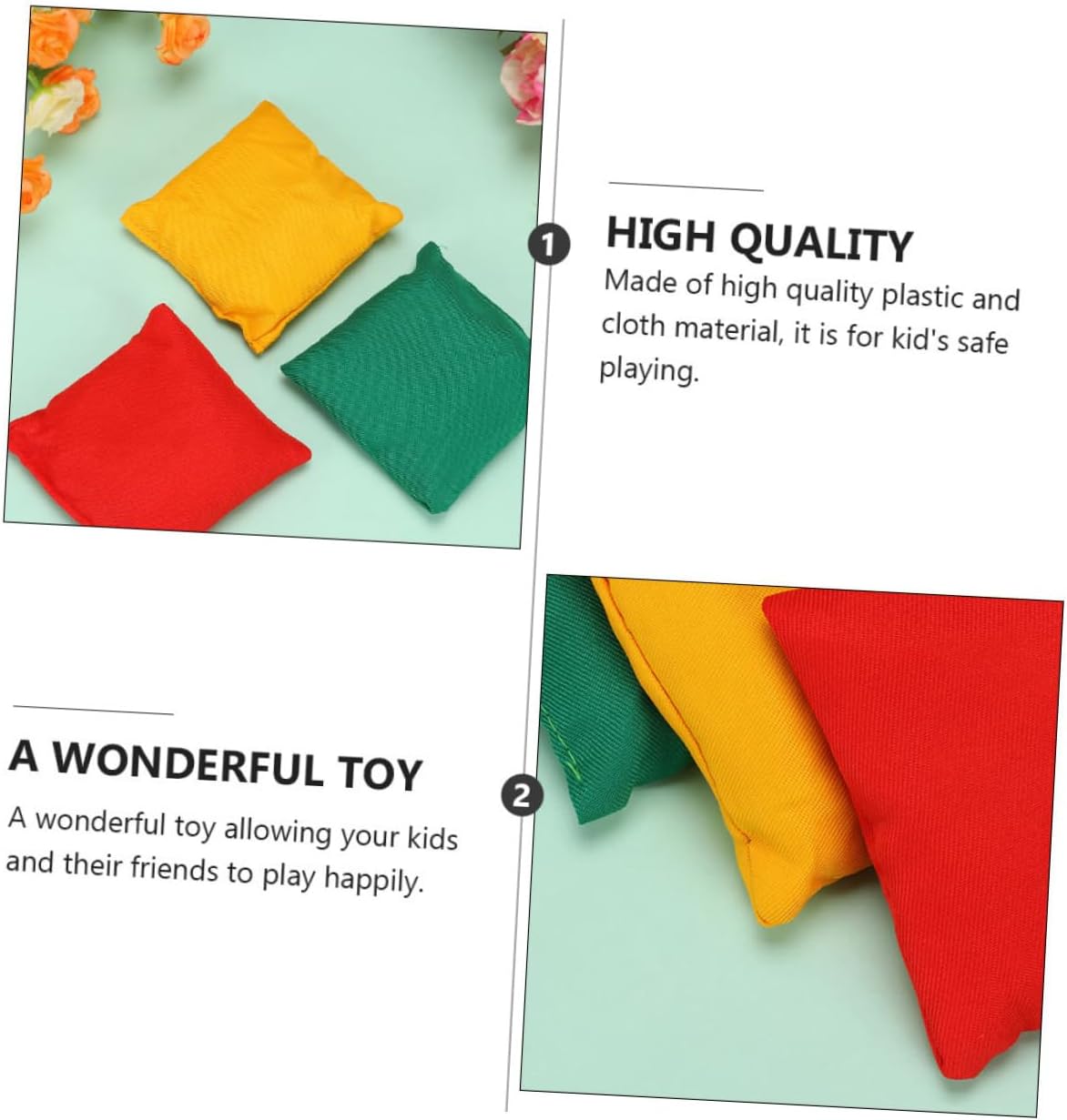 Palline appiccicose per freccette: i colori brillanti possono coltivare la capacità di riconoscimento dei colori dei bambini e attirare la loro attenzione. Freccette sicure per bambini: i giochi con sacchi di sabbia possono esercitare la coordinazione occhio-mano, la funzione fisica e la coordinazione dei bambini. Piccolo sacco di sabbia per bambini: è adatto a una varietà di attività, indoor, outdoor, singole o più persone possono usarlo, tutti possono giocare ed è ampiamente utilizzato. Lanciare sacchi di fagioli: i colori vivaci possono attirare l'attenzione dei bambini. la scelta per i giochi all'aperto per bambini. Gioco del sacco a sacco: questo prodotto può aggiungere divertimento alla vita extrascolastica dei bambini. è una buona scelta come per i tuoi bambini, a loro piacerà.