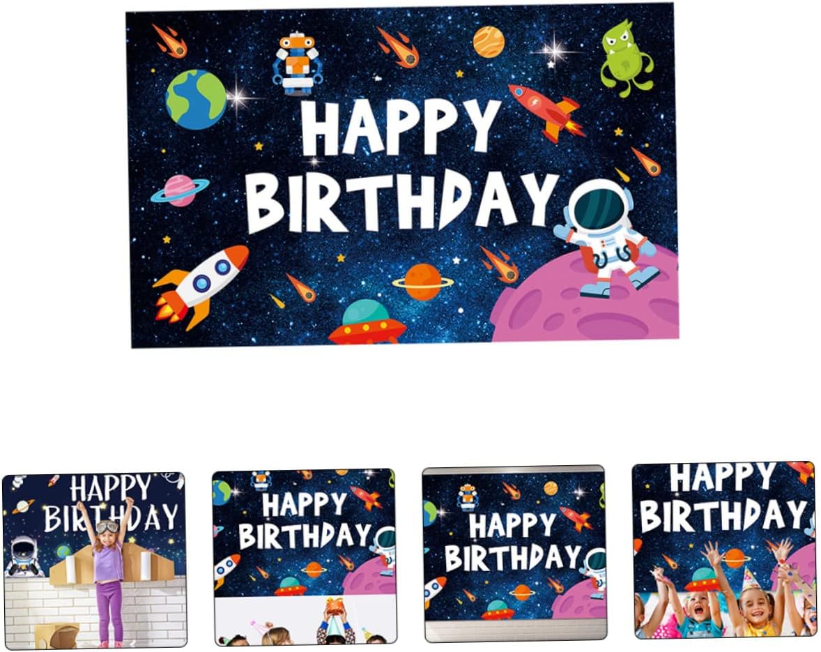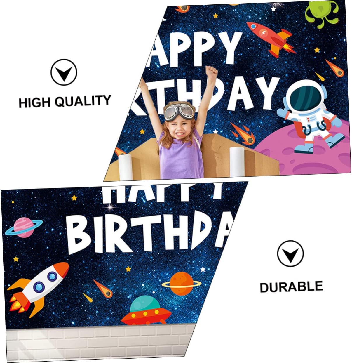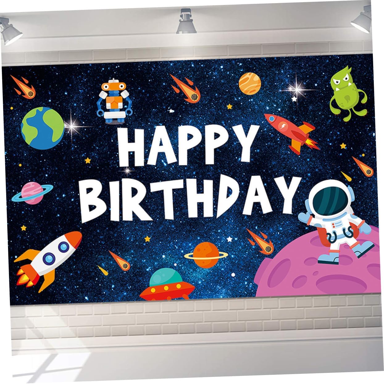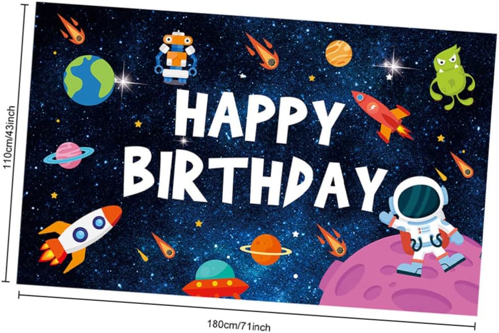 Decorazione per feste a tema: realizzata in bel materiale poliestere e uso duraturo, tavolo da torta. Sfondo del : puoi decorare questo striscione di compleanno sul muro o in altri posti come preferisci, striscione di buon compleanno. Decorazioni: appendere lo striscione di compleanno a tema, aggiungere più divertimento alla festa di compleanno a tema dei tuoi bambini, decorazioni per la tavola della torta. Forniture decorative per feste: puoi abbinarlo ad altri ornamenti per feste e l'effetto sarà migliore, banner per feste di compleanno. Festa a tema sullo spazio esterno: questo banner di sfondo per la festa sarà un successo per il tuo evento o servizio fotografico, sfondo per la parete dello spazio di compleanno.