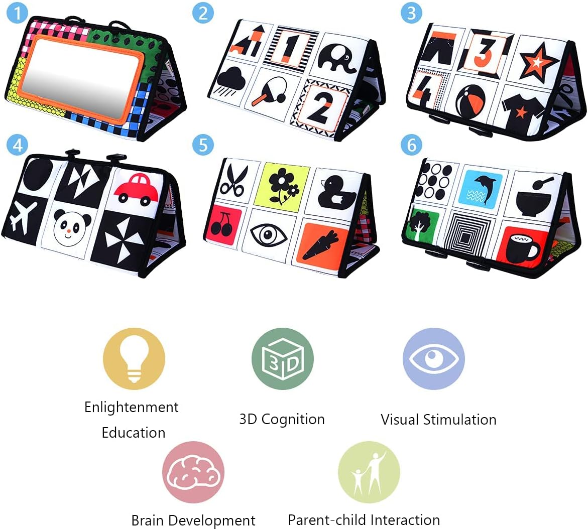 【Disegno dello specchio】 Usa uno specchio per mettere a fuoco determinati oggetti, che è facile attirare l'attenzione dei bambini. Incoraggia i bambini a concentrarsi sui loro volti e suscita la loro attenzione e curiosità. 【Giocattoli per la prima educazione】 Modelli di corrispondenza dei colori in bianco e nero, semplici mappe cognitive come numeri, animali, frutti, ecc., Aiutano i bambini a coltivare l'interesse per l'apprendimento fin dalla tenera età, promuovono lo sviluppo cognitivo e attivano il cervello. 【Materiale di sicurezza】 Il tessuto è morbido e confortevole e non danneggerà la pelle del tuo bambino. Specchio acrilico, lo specchio è avvolto strettamente in un panno morbido e infrangibile. (Nota: sullo specchio è presente una pellicola protettiva trasparente, si prega di strapparla prima dell'uso) 【Design pieghevole】 Risparmia spazio e semplifica l'archiviazione. I giocattoli per bambini possono formare una struttura triangolare stabile e stare sul tavolo o sul pavimento, adatti ai bambini per giocare o sedersi. La cintura di collegamento è facile da appendere al passeggino e alla culla per ottenere il miglior effetto visivo. 【Regalo ideale】 I giocattoli a specchio per bambini sono la scelta migliore per l'esplorazione. Il regalo perfetto per i neonati per aumentare l'interazione genitore-figlio. Adatto a bambini di età compresa tra 0 - 12 mesi.