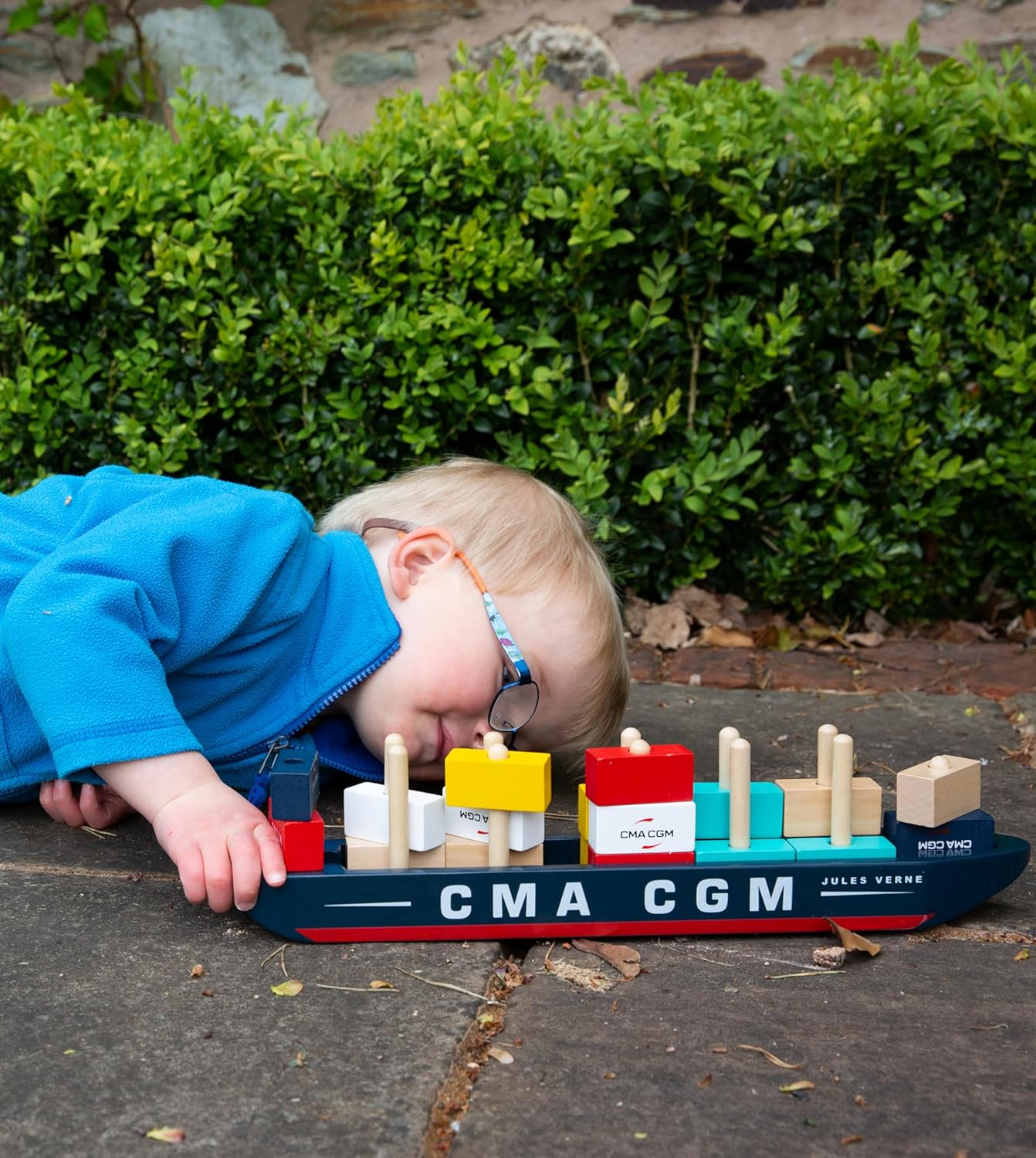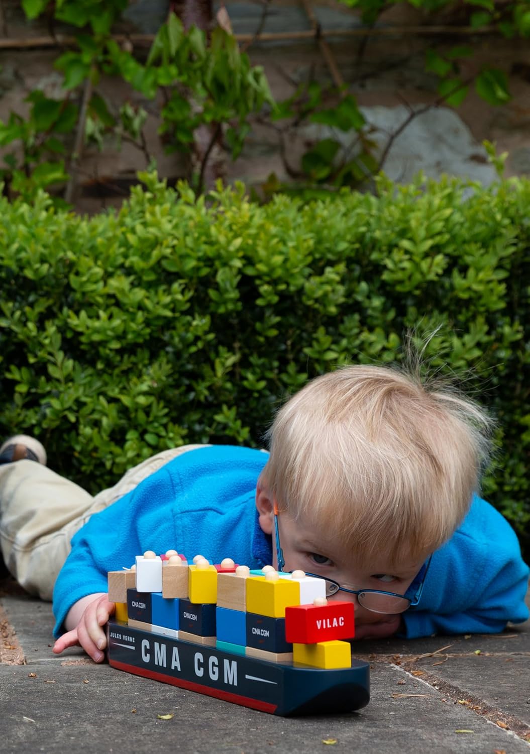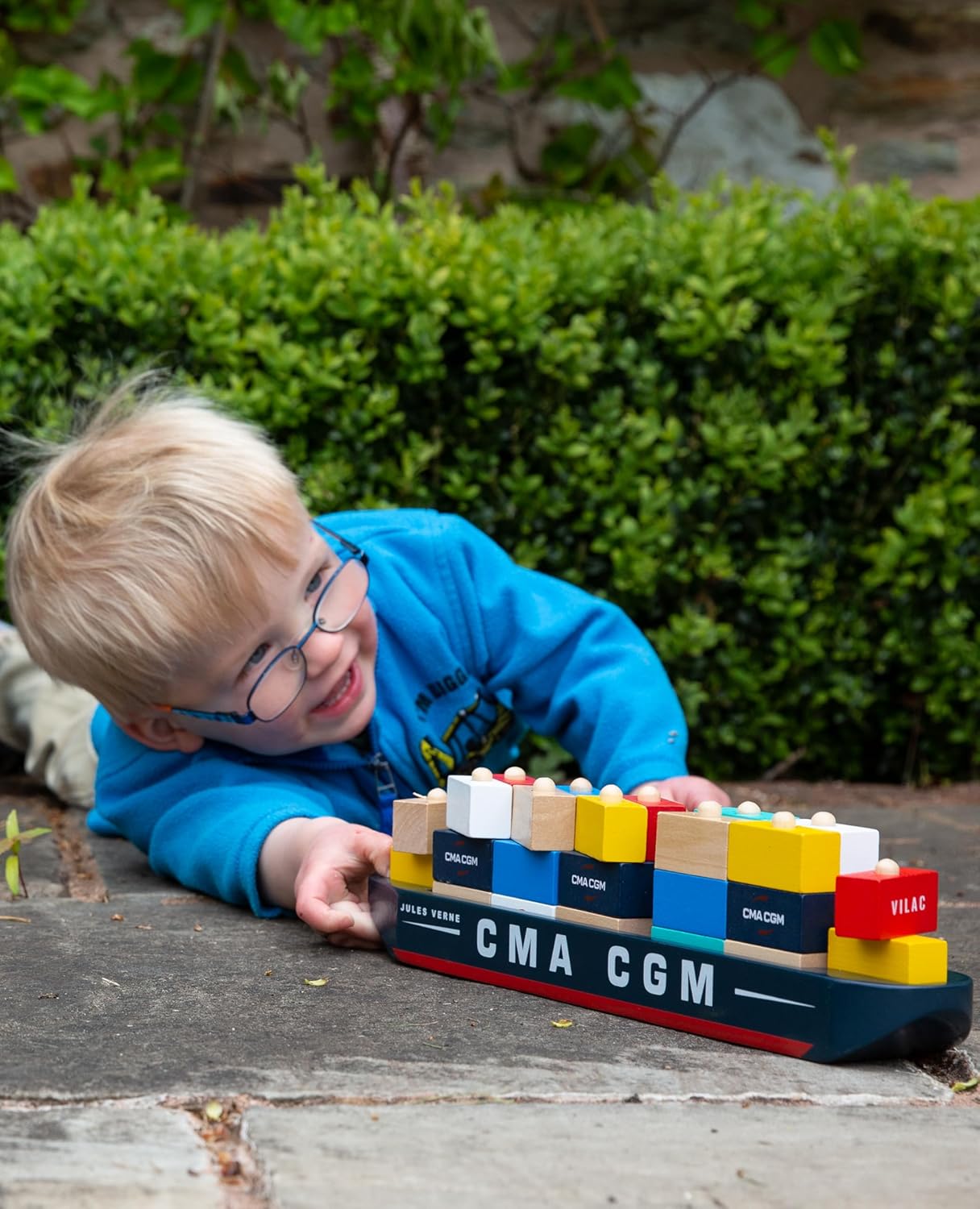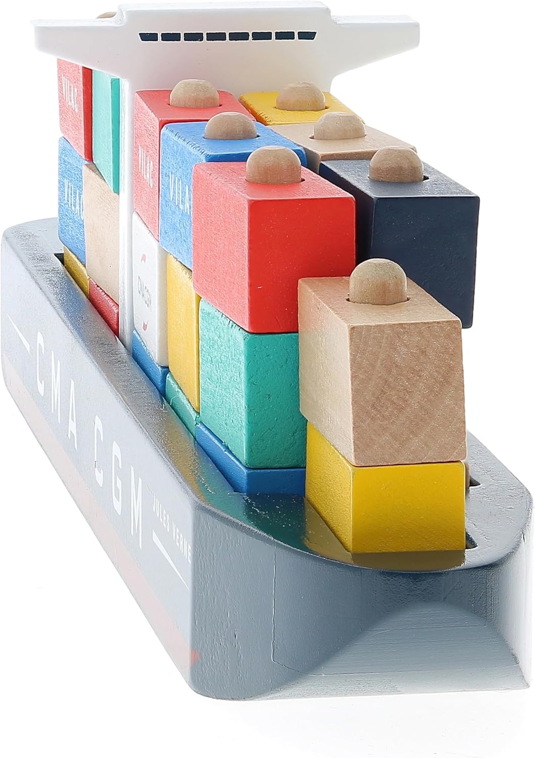 La Jules Verne di Vilac è una nave portacontainer in legno dai colori vivaci per bambini piccoli. Possono impilare e caricare il carico di cubi di legno e immaginare che stiano salpando attraverso gli oceani! Ogni bambino ama il trasporto di un tipo o dell'altro e questa nave portacontainer retrò caricabile con 35 pezzi non solo fornisce ore di gioco fantasioso, ma li aiuta a sviluppare abilità motorie. Sta benissimo anche su uno scaffale! Realizzato a mano in legno sostenibile e rifinito con lacche multicolori. Facile da pulire. I giocattoli in legno di Vilac deliziano bambini e neonati dal 1911. Collaborano con artisti per realizzare giocattoli, giochi e puzzle belli e sostenibili. 17 cm x 26 cm x 27,5 cm Adatto per 3 anni +