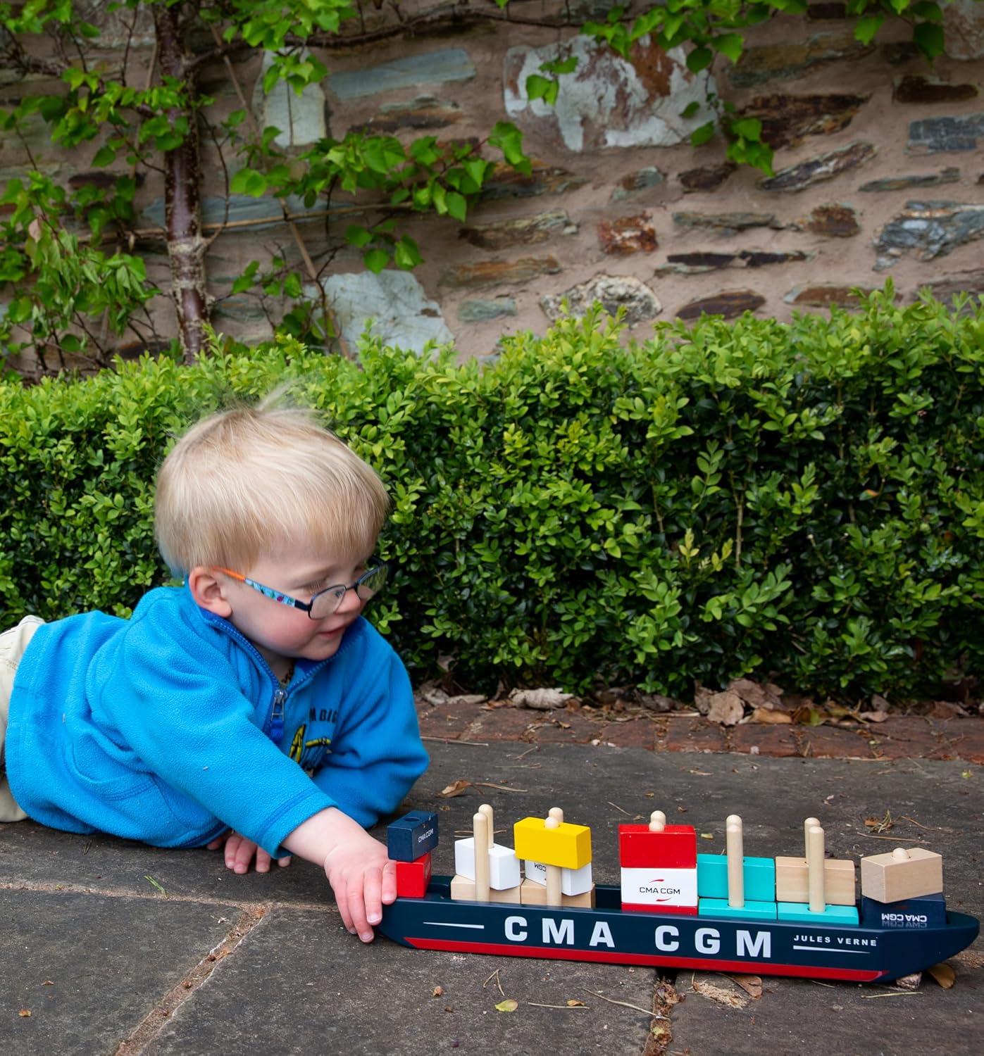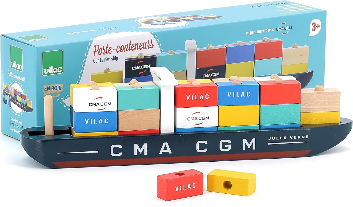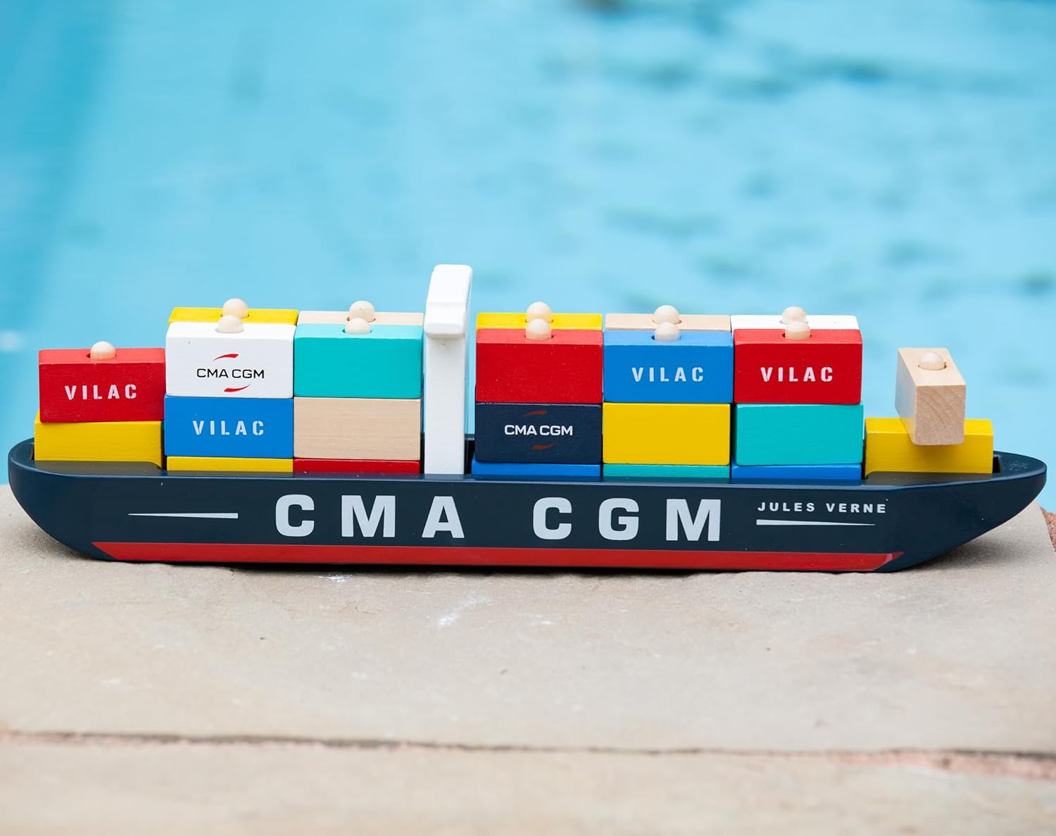 La Jules Verne di Vilac è una nave portacontainer in legno dai colori vivaci per bambini piccoli. Possono impilare e caricare il carico di cubi di legno e immaginare che stiano salpando attraverso gli oceani! Ogni bambino ama il trasporto di un tipo o dell'altro e questa nave portacontainer retrò caricabile con 35 pezzi non solo fornisce ore di gioco fantasioso, ma li aiuta a sviluppare abilità motorie. Sta benissimo anche su uno scaffale! Realizzato a mano in legno sostenibile e rifinito con lacche multicolori. Facile da pulire. I giocattoli in legno di Vilac deliziano bambini e neonati dal 1911. Collaborano con artisti per realizzare giocattoli, giochi e puzzle belli e sostenibili. 17 cm x 26 cm x 27,5 cm Adatto per 3 anni +