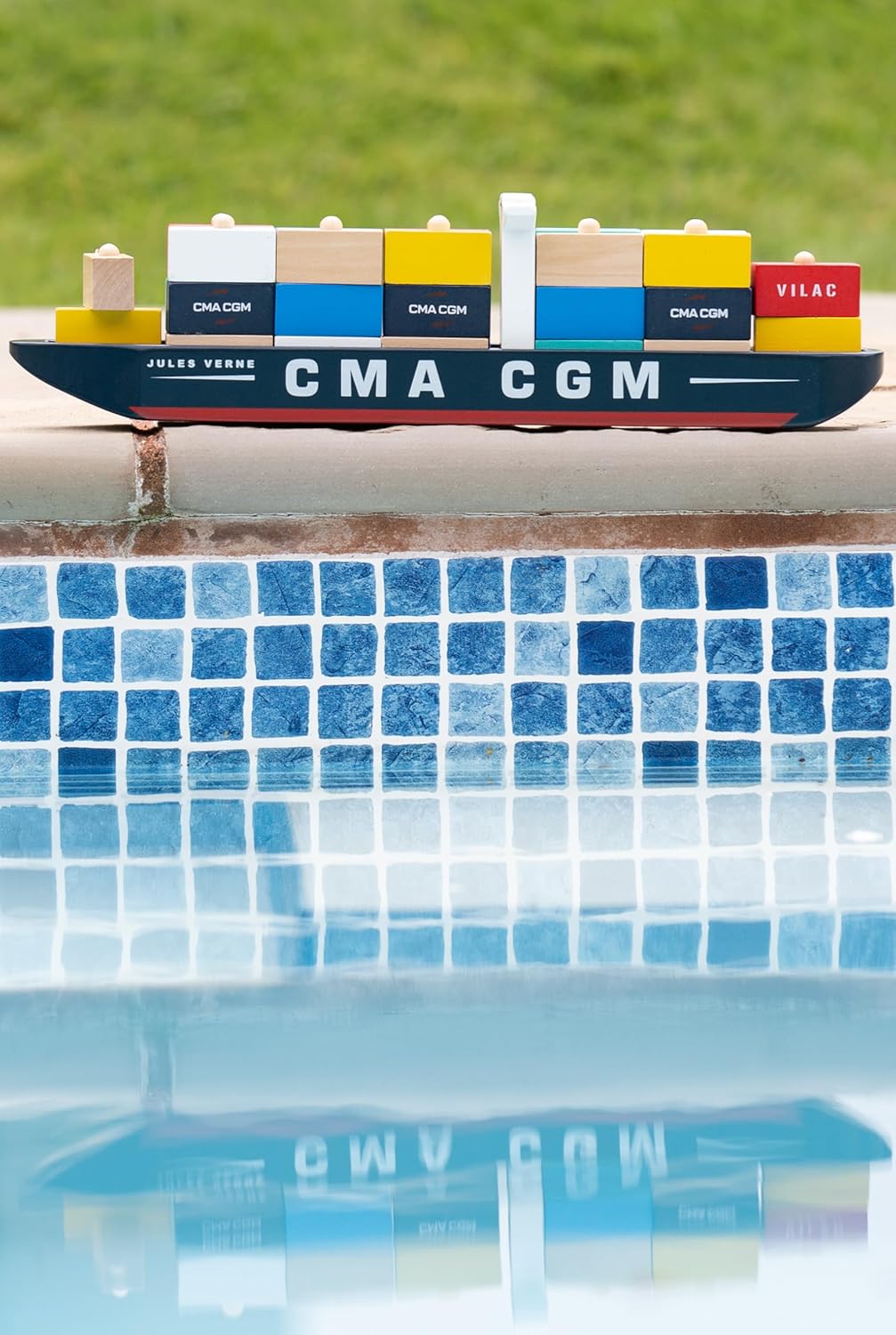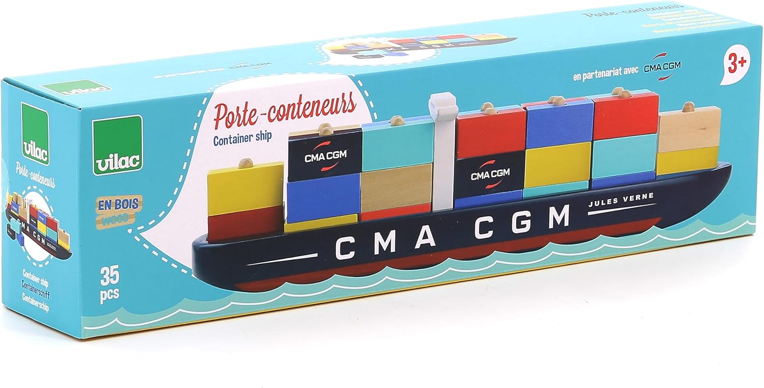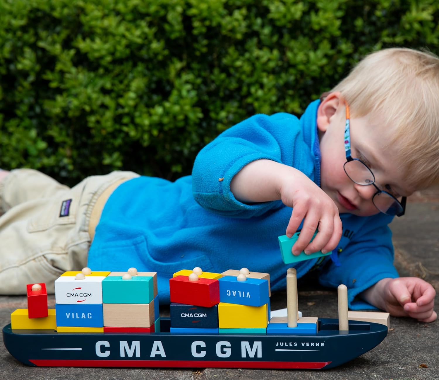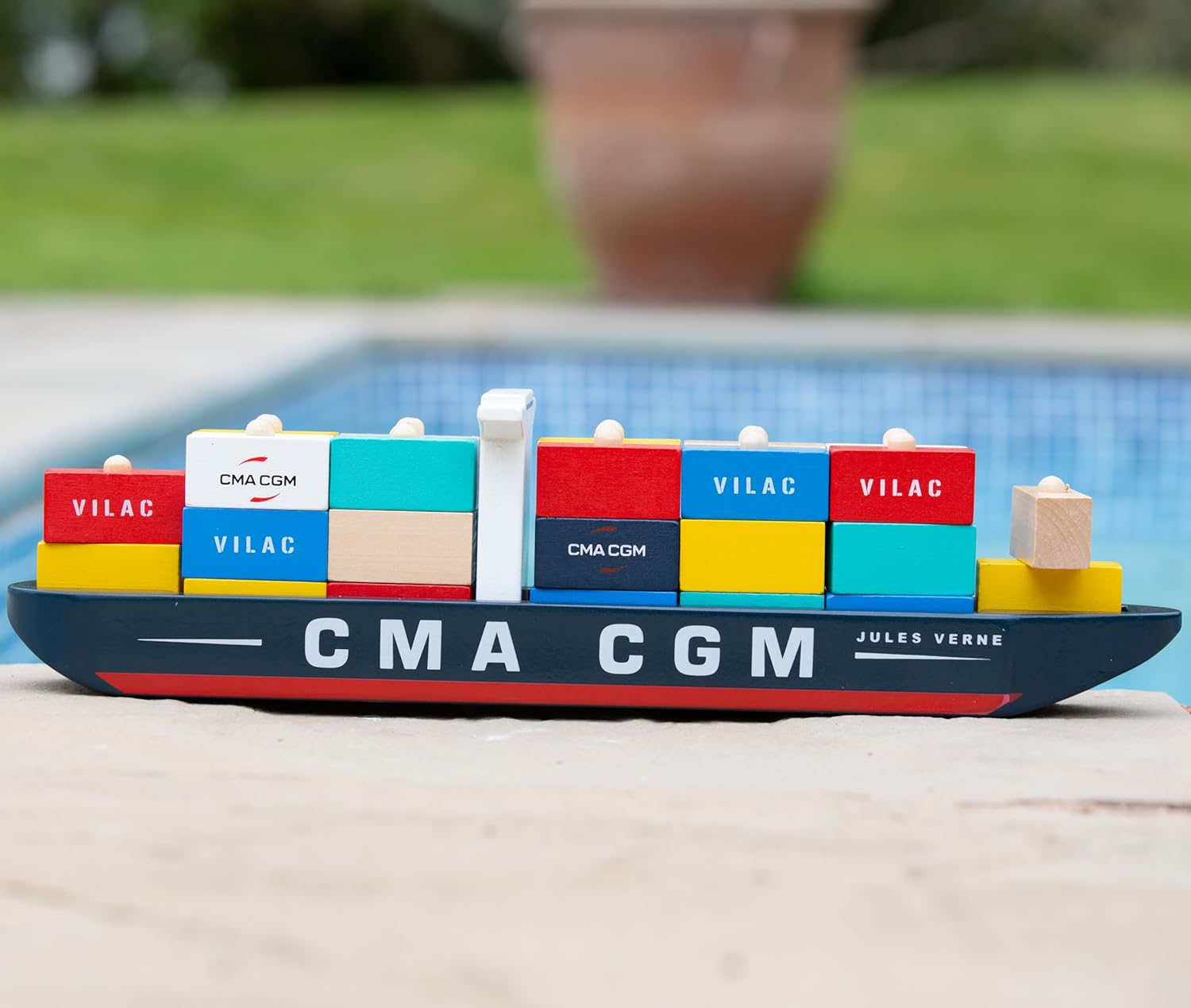 La Jules Verne di Vilac è una nave portacontainer in legno dai colori vivaci per bambini piccoli. Possono impilare e caricare il carico di cubi di legno e immaginare che stiano salpando attraverso gli oceani! Ogni bambino ama il trasporto di un tipo o dell'altro e questa nave portacontainer retrò caricabile con 35 pezzi non solo fornisce ore di gioco fantasioso, ma li aiuta a sviluppare abilità motorie. Sta benissimo anche su uno scaffale! Realizzato a mano in legno sostenibile e rifinito con lacche multicolori. Facile da pulire. I giocattoli in legno di Vilac deliziano bambini e neonati dal 1911. Collaborano con artisti per realizzare giocattoli, giochi e puzzle belli e sostenibili. 17 cm x 26 cm x 27,5 cm Adatto per 3 anni +