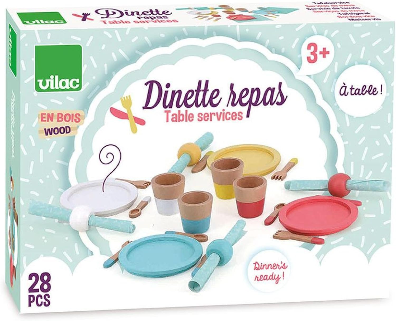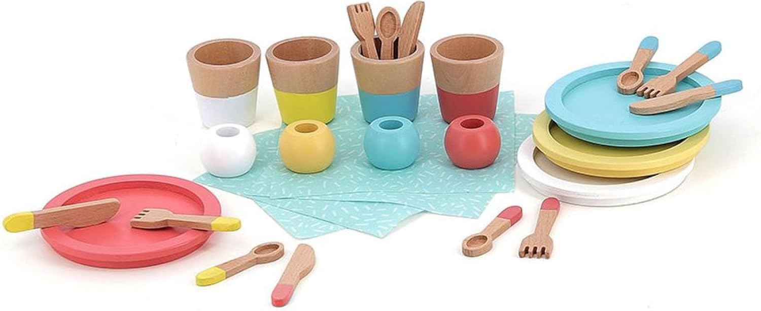 UNA DINETTA IN LEGNO: È il momento di riunire tutti i tuoi amici per pranzo! Con questo adorabile servizio di dinette in legno, il vostro bambino potrà inventarsi bei momenti di immaginazione e imitazione per fare "come i grandi". LASCIA POSTO LA IMMAGINAZIONE DEL TUO BAMBINO: Questo servizio è composto da 28 pezzi in legno con piatti, bicchieri, forchette, coltelli e cucchiai, nonché portatovaglioli e tovaglioli coordinati. Tutti gli elementi sono così riuniti per lasciare che i bambini creino, immaginare e sognare... UN GIOCO DI EVEIL: Questo gioco di dinette per il pasto incoraggia l'espressione creativa e il gioco collaborativo introducendo i concetti di base della vita quotidiana. Materiali di qualità: più durevole dei giocattoli di plastica, offre una piacevole esperienza sensoriale con la sua consistenza naturale e favorisce lo sviluppo delle capacità motorie. Idea regalo: una dinette in legno per tutti i bambini dai 3 anni in su