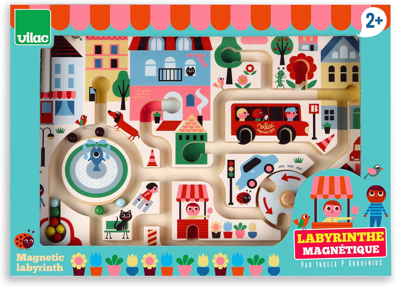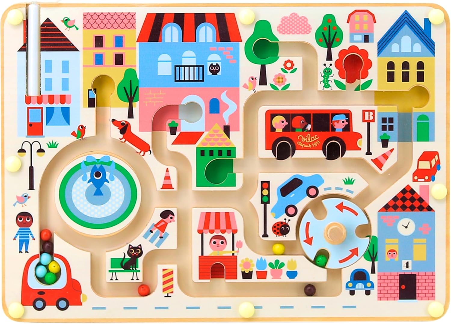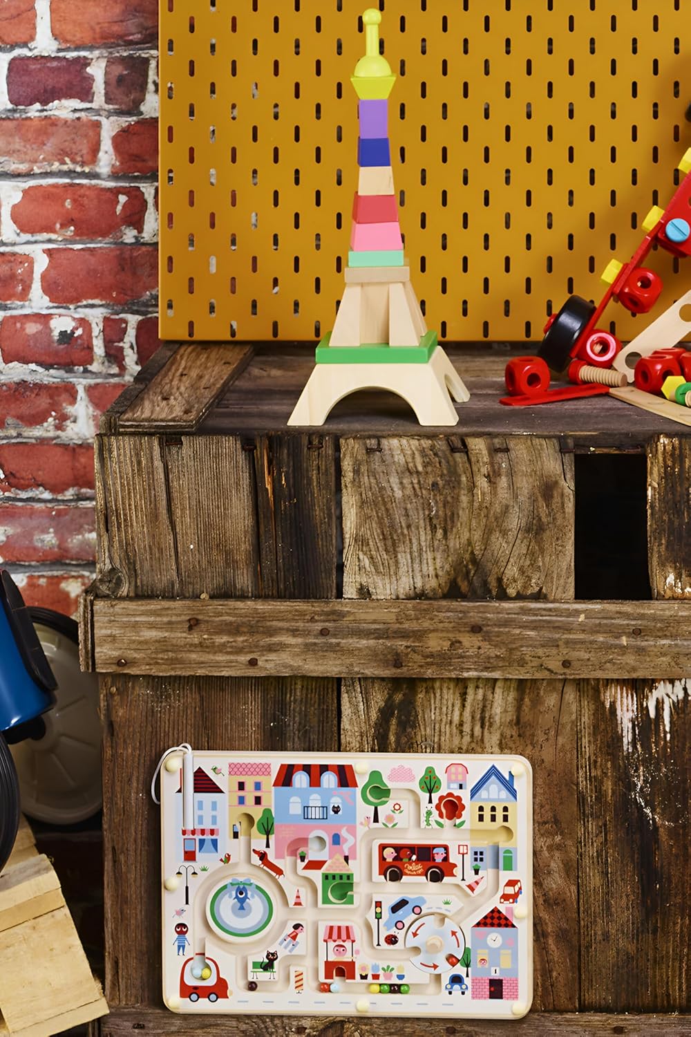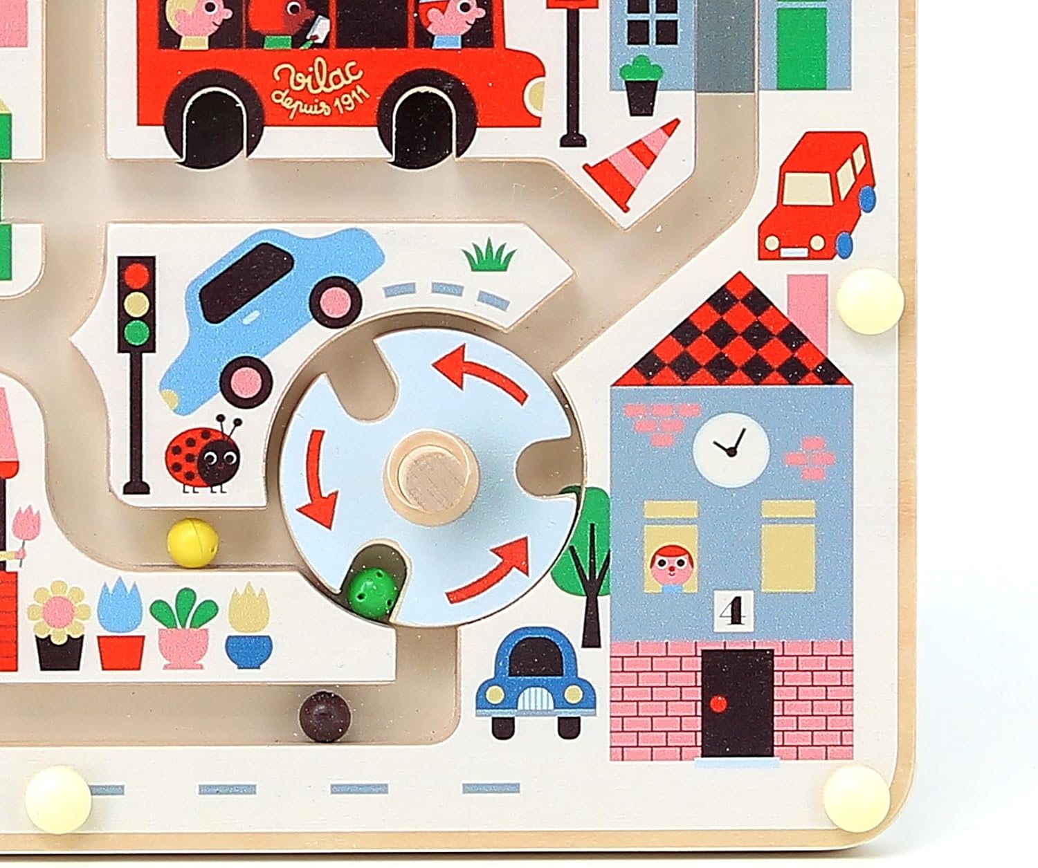 Benvenuti nell'universo poetico e vintage di Ingela P Arrhenius Grazie a una piccola penna magnetica, i bambini fanno viaggiare le palline colorate in questa splendida città Una palla verde su un albero, una rossa nel fiore, altre due sulle ruote del bus, arriverete a metterli tutti?È ancora più divertente passando per la rotonda che bisogna azionare!Un gioco in legno giocoso che facilita l'acquisizione delle capacità motorie fini dei piccoli, permette loro di individuare nello spazio e arricchito il loro vocabolario nominando colori, animali e oggetti Punti salienti: Un giocattolo imperdibile semplice e giocoso