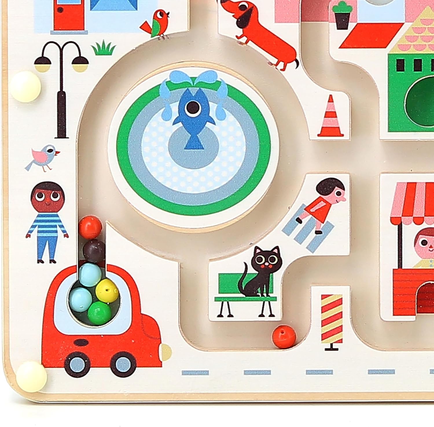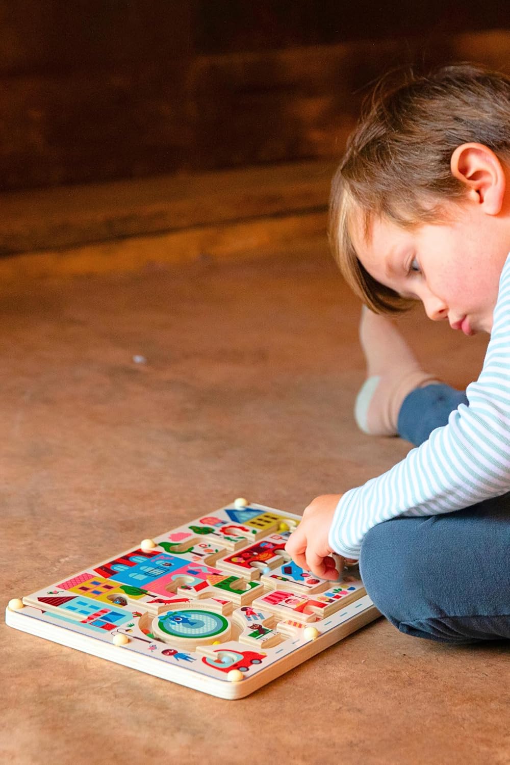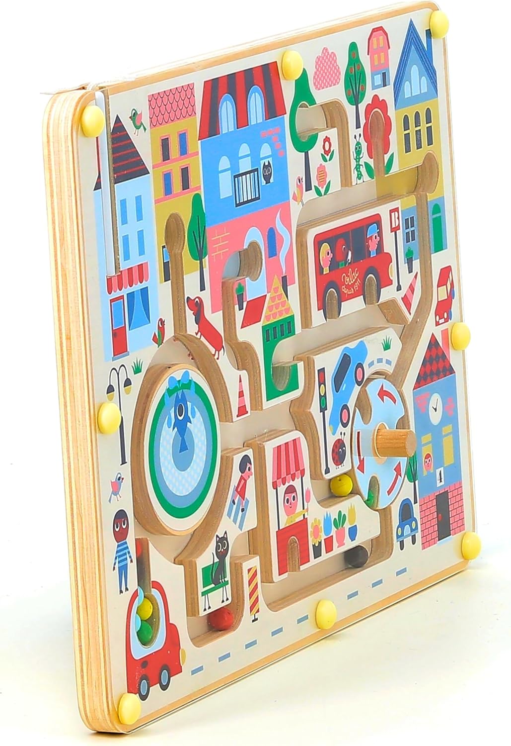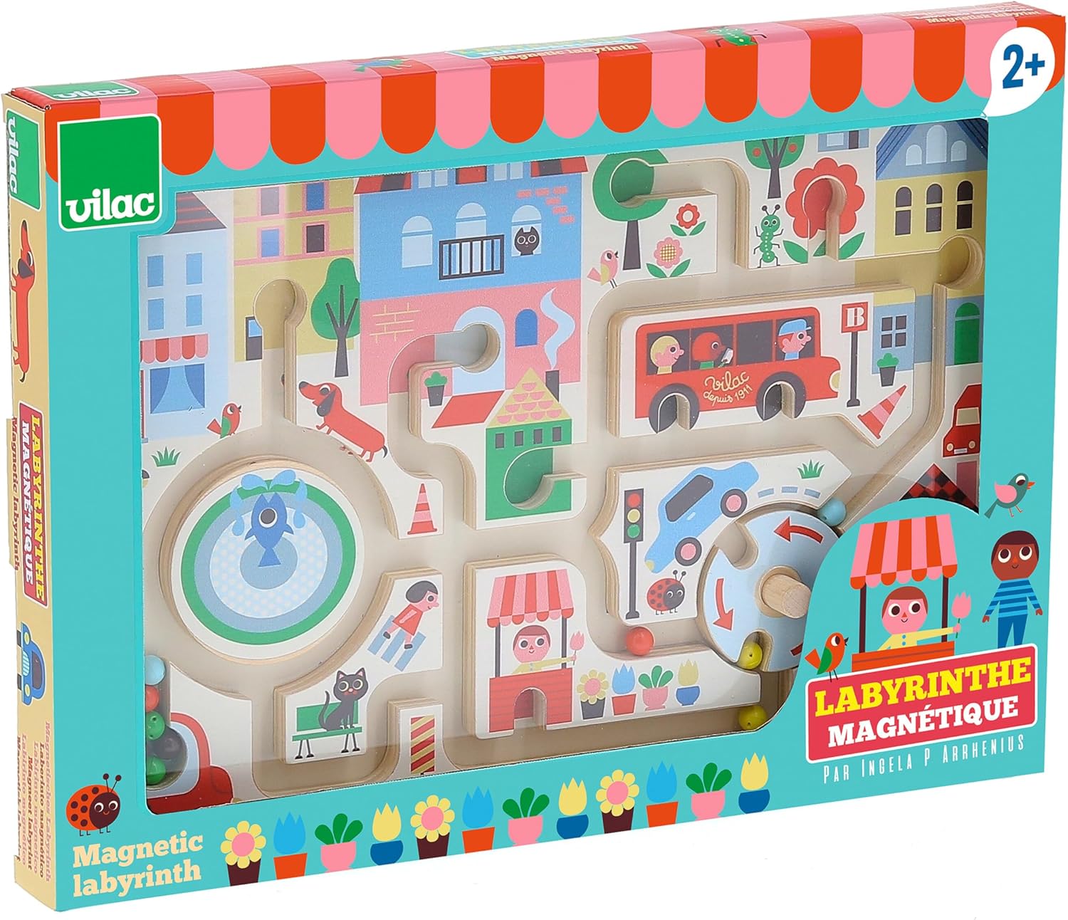 Benvenuti nell'universo poetico e vintage di Ingela P Arrhenius Grazie a una piccola penna magnetica, i bambini fanno viaggiare le palline colorate in questa splendida città Una palla verde su un albero, una rossa nel fiore, altre due sulle ruote del bus, arriverete a metterli tutti?È ancora più divertente passando per la rotonda che bisogna azionare!Un gioco in legno giocoso che facilita l'acquisizione delle capacità motorie fini dei piccoli, permette loro di individuare nello spazio e arricchito il loro vocabolario nominando colori, animali e oggetti Punti salienti: Un giocattolo imperdibile semplice e giocoso