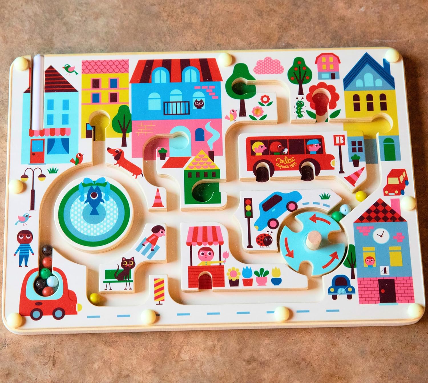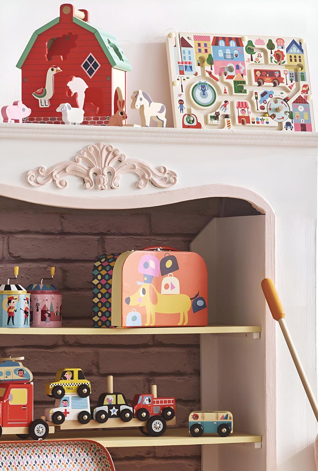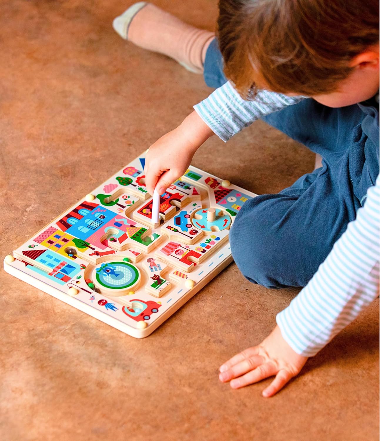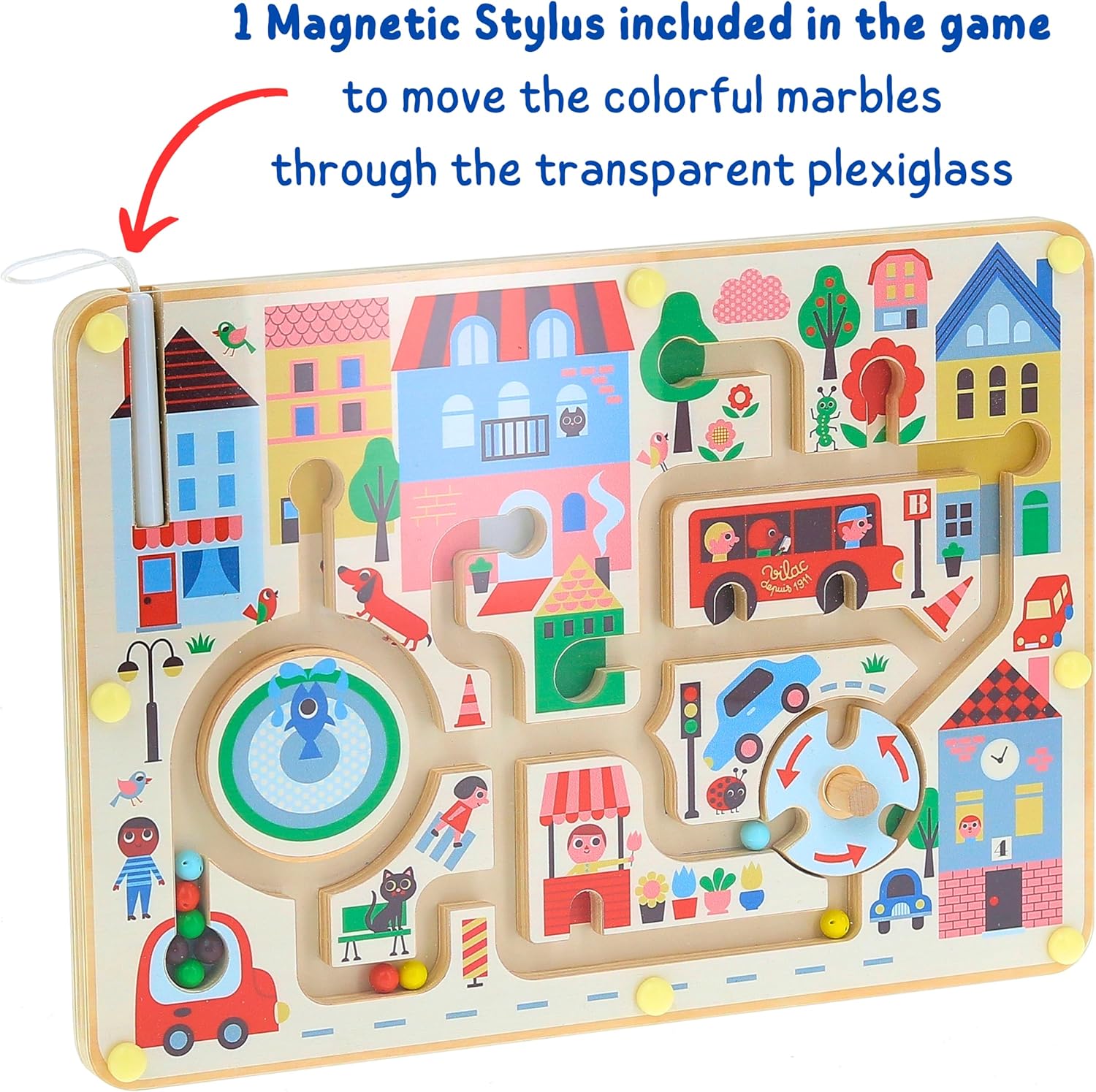 Benvenuti nell'universo poetico e vintage di Ingela P Arrhenius Grazie a una piccola penna magnetica, i bambini fanno viaggiare le palline colorate in questa splendida città Una palla verde su un albero, una rossa nel fiore, altre due sulle ruote del bus, arriverete a metterli tutti?È ancora più divertente passando per la rotonda che bisogna azionare!Un gioco in legno giocoso che facilita l'acquisizione delle capacità motorie fini dei piccoli, permette loro di individuare nello spazio e arricchito il loro vocabolario nominando colori, animali e oggetti Punti salienti: Un giocattolo imperdibile semplice e giocoso