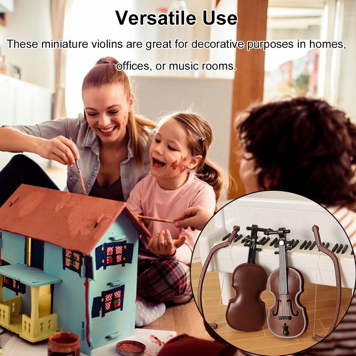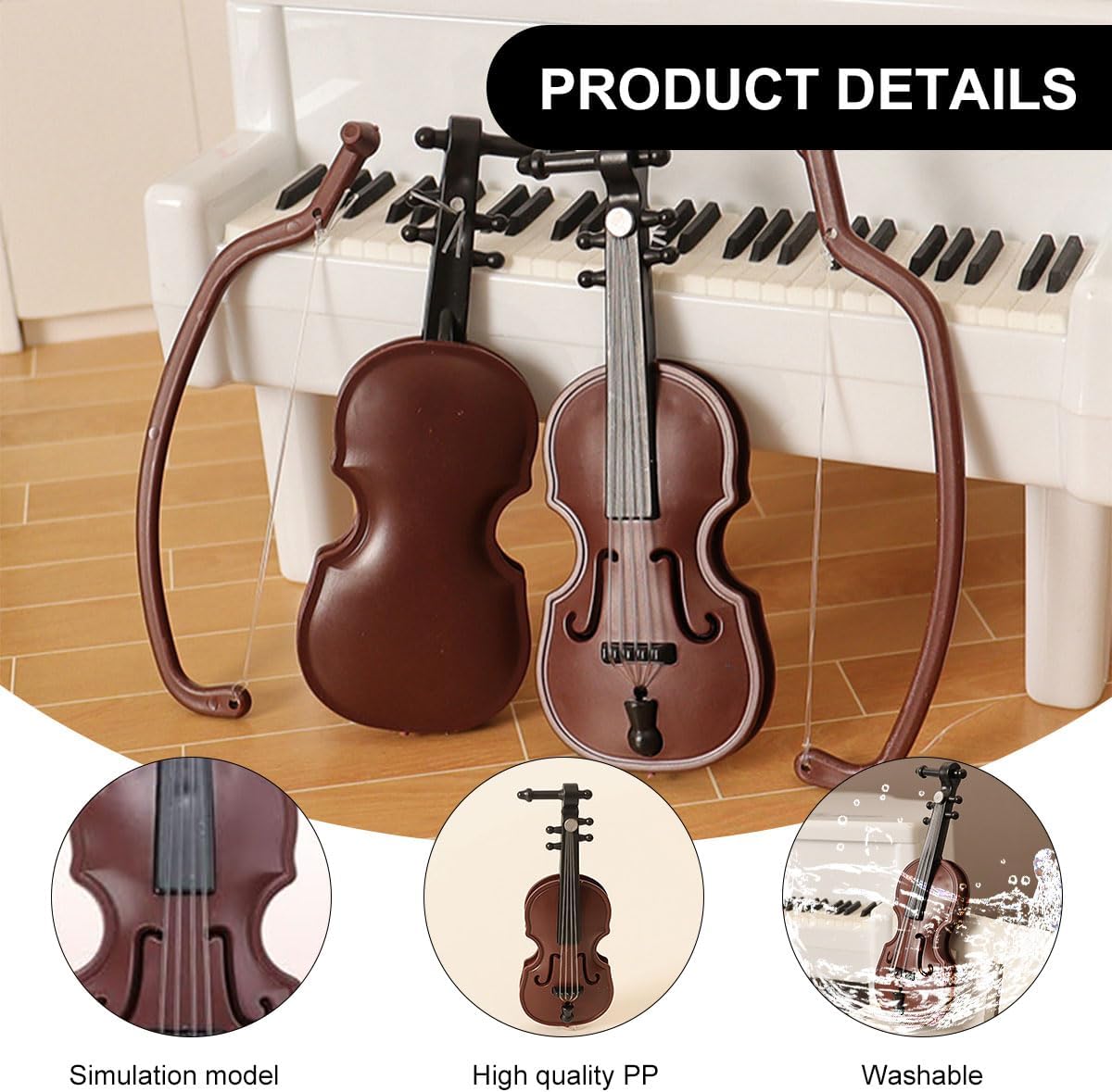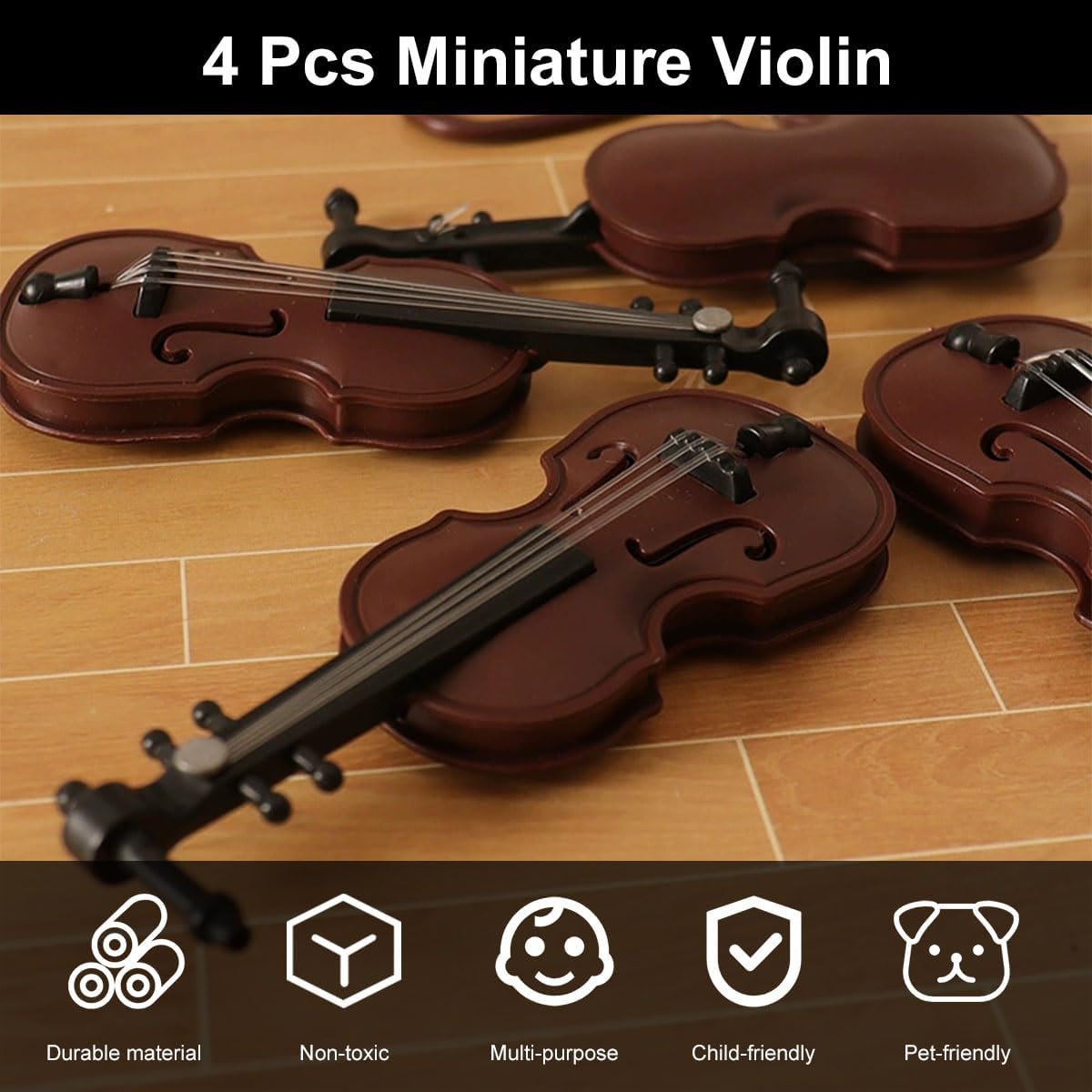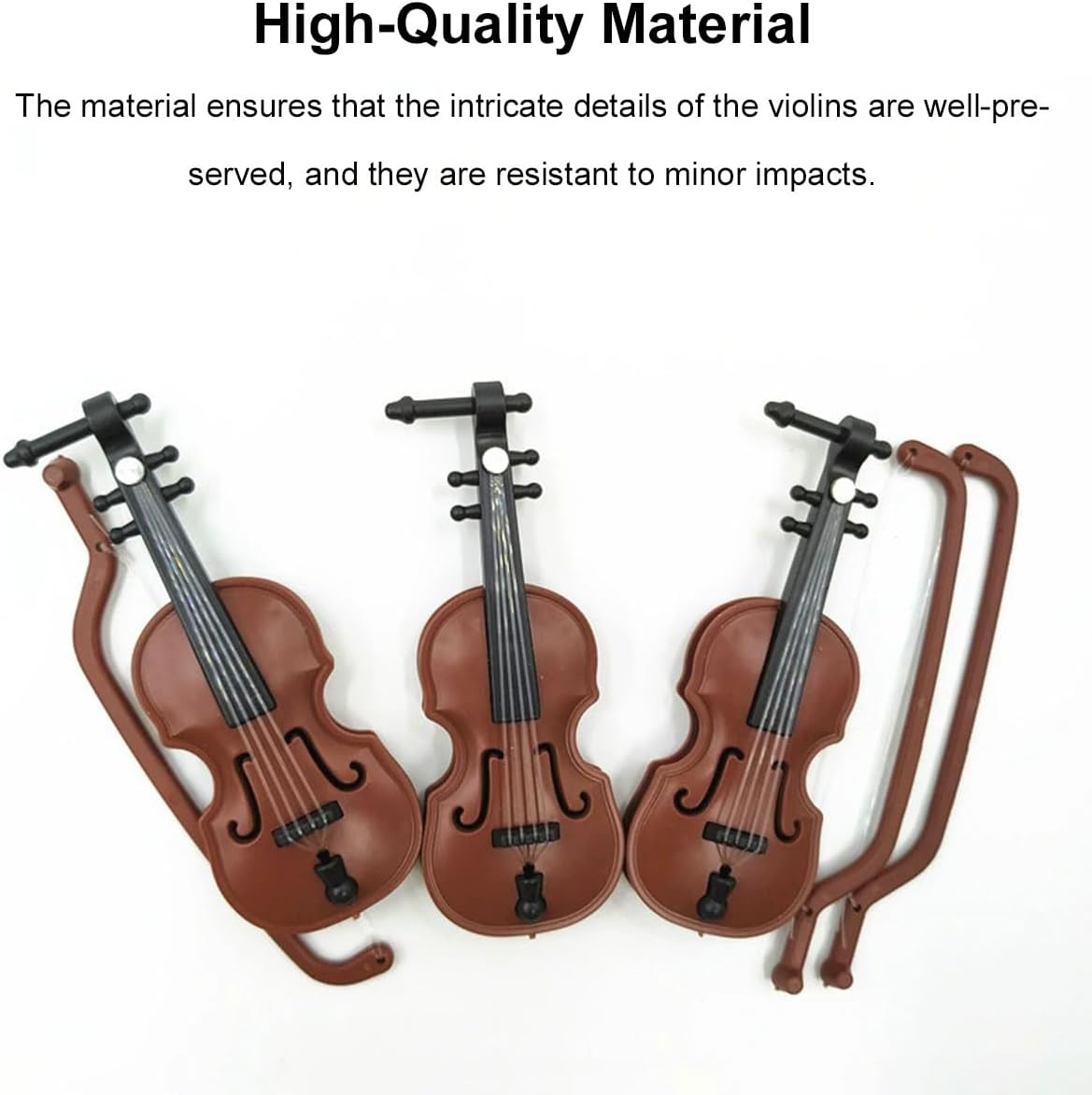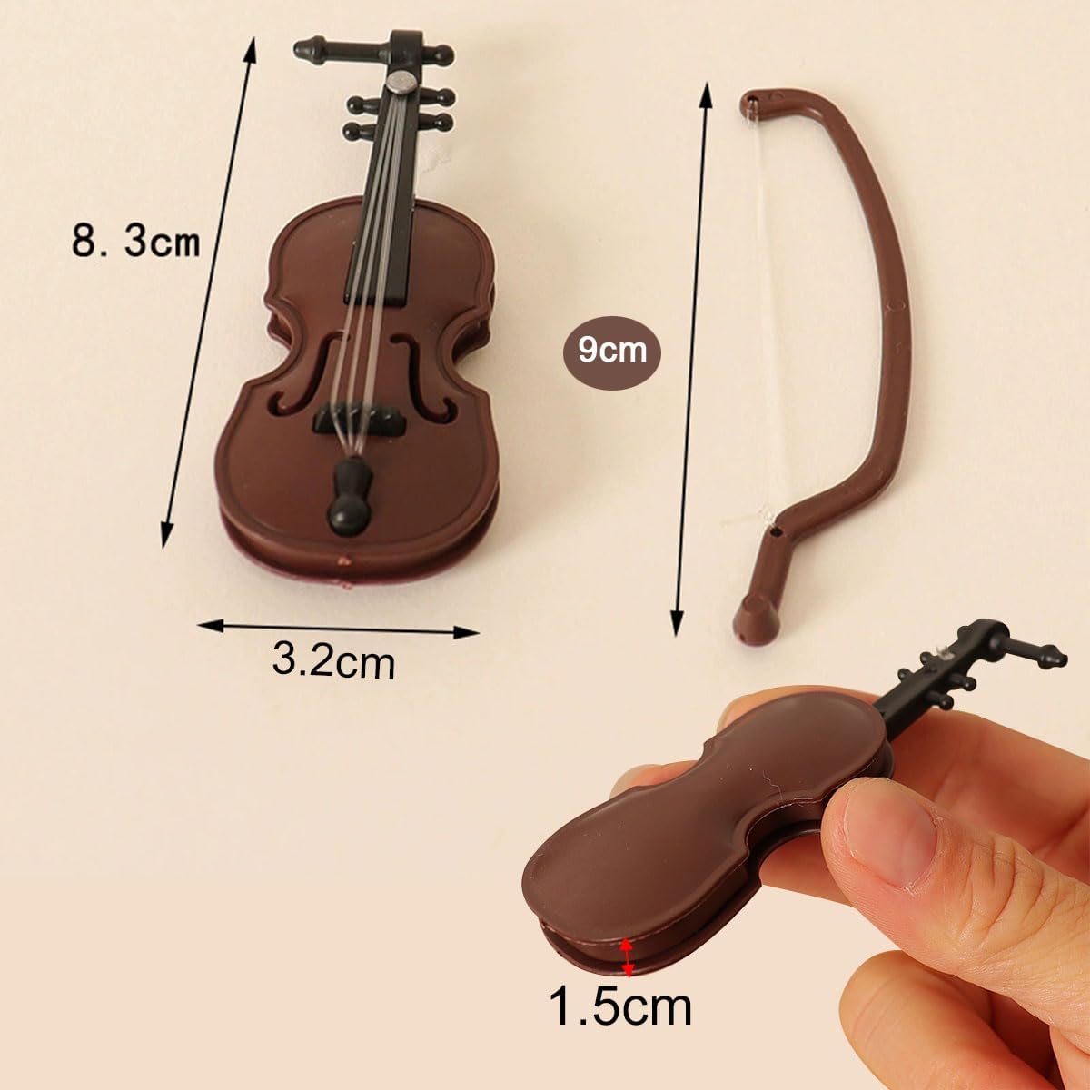 【Materiale di alta qualità】 Costruiti in plastica resistente, questi violini in miniatura sono costruiti per durare. Il materiale assicura che gli intricati dettagli dei violini siano ben conservati e siano resistenti agli urti minori. 【Dimensioni compatte】 Ogni violino misura 8,3 cm di lunghezza, 3,2 cm di larghezza e 1,5 cm di altezza. Le loro dimensioni ridotte li rendono ideali per essere posizionati su scaffali, scrivanie, vetrine o come parte di una composizione a tema. 【Design leggero】 Con un peso di soli 8 grammi ciascuno, questi violini sono incredibilmente leggeri. Questo li rende facili da spostare e posizionare come preferisci. 【Set di violini in miniatura con archi】 Include 4 violini in plastica e archi abbinati, perfetti per l'arredamento della casa delle bambole, le esposizioni educative o l'artigianato a tema musicale. 【Uso versatile】 Questi violini in miniatura non sono solo ottimi per scopi decorativi in case, uffici o sale da musica, ma sono anche regali meravigliosi per appassionati di musica, collezionisti o chiunque apprezzi l'artigianato raffinato.
