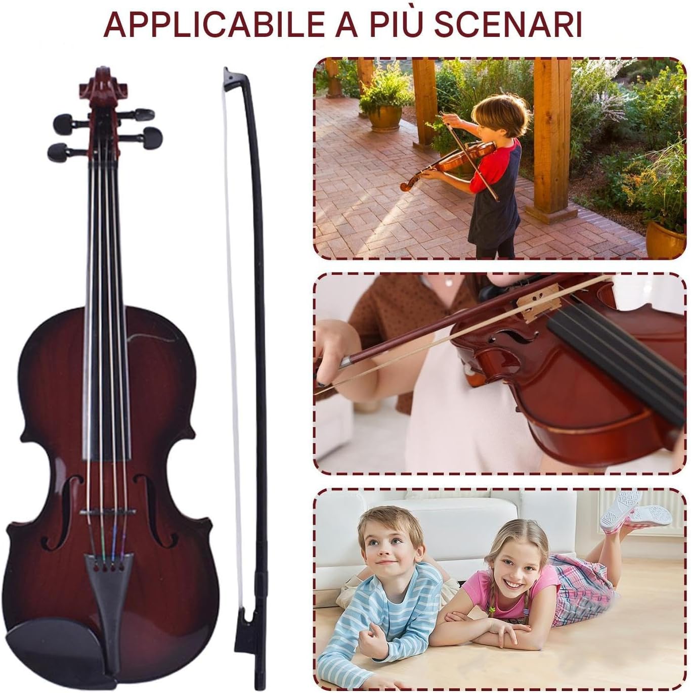 Costruzione : La costruzione integrata in ABS resiste efficacemente a urti e pressioni, garantendo un utilizzo prolungato con finiture lisce e di rischi che migliorano la sicurezza durante il gioco Pratico nell'utilizzo: Dotato di archetto e colofonia per suonare subito, la tensione delle corde regolabile si adatta a diverse esigenze, progettato per sessioni di pratica in famiglia, con manutenzione senza attrezzi per una gestione semplice Regolabile: Questo violino giocattolo produce un suono autentico grazie alle corde reali e all'archetto, migliorato da una camera interna e piroli regolabili per una accordatura e una risonanza ricca e soddisfacente per appassionati musicali di tutte le età Apprendimento musicale precoce: per coltivare il senso del ritmo e la creatività, rafforzando stesso la coordinazione occhio-mano attraverso il gioco interattivo con questo violino giocattolo adatto ai principianti Design Affidabile: La forma ergonomica curva favorisce il posizionamento delle mani e riduce la fatica durante l'utilizzo di questo violino giocattolo per bambini