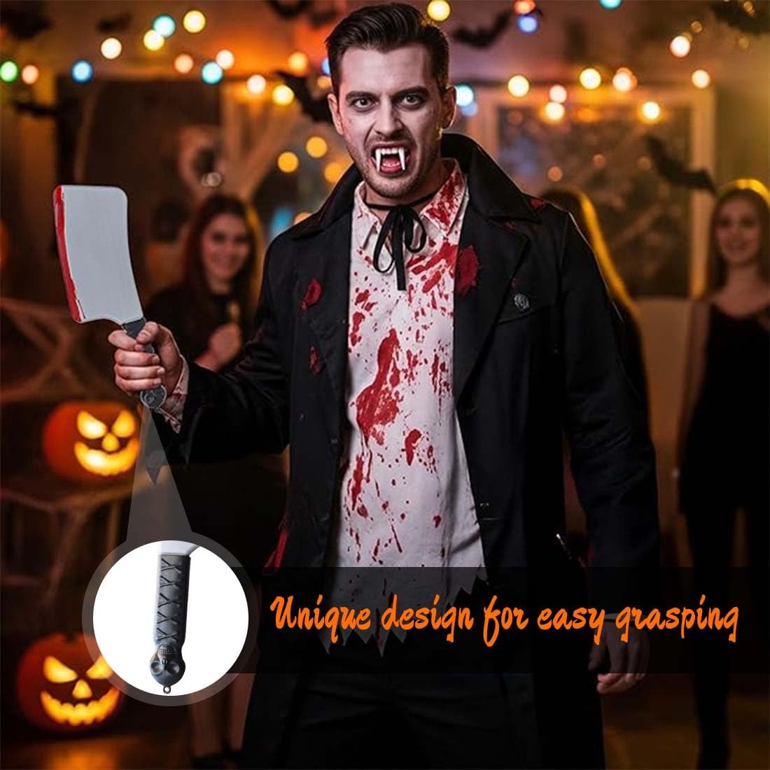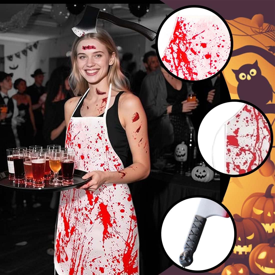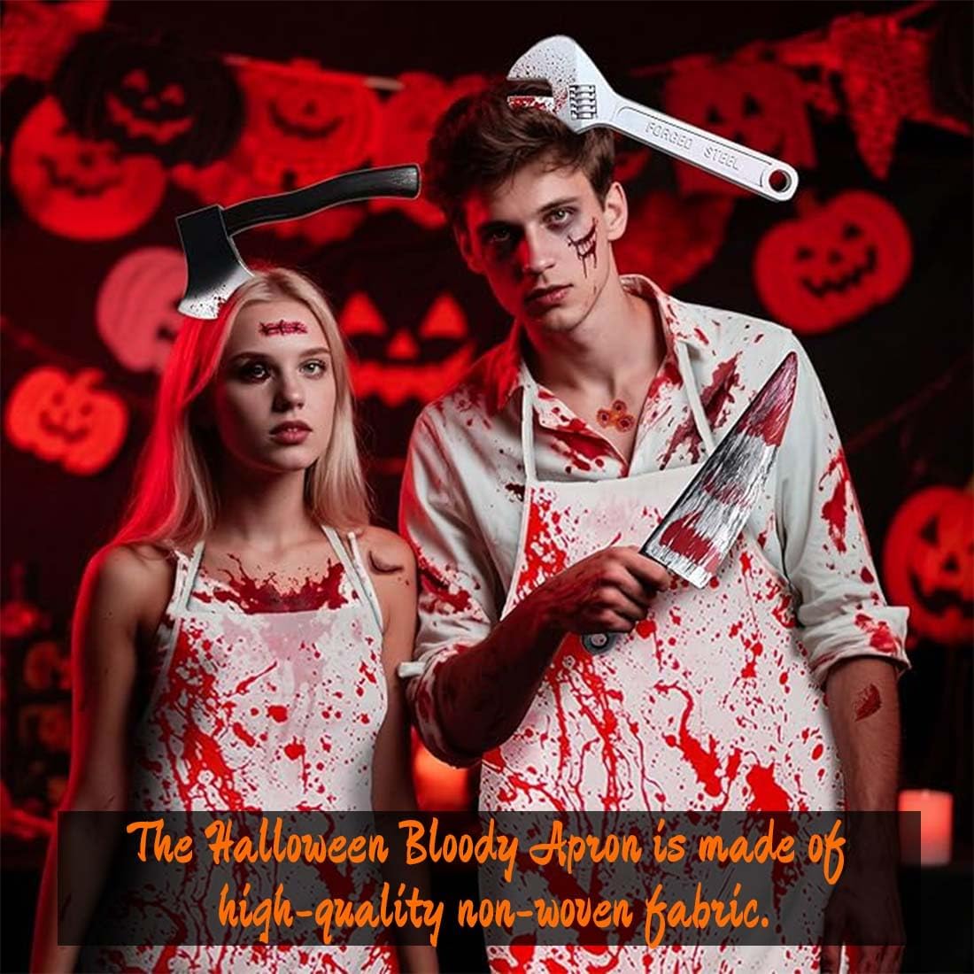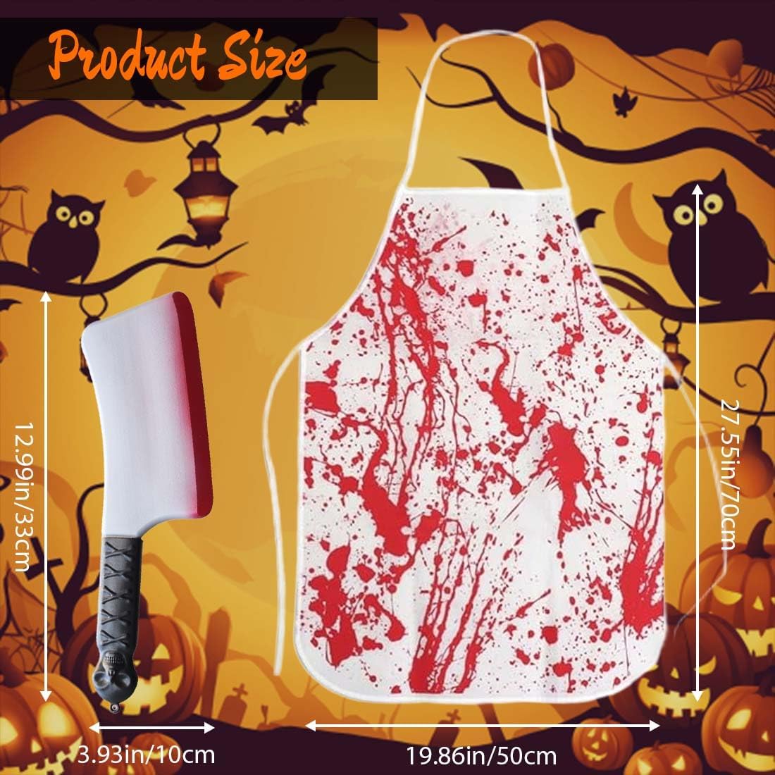 Design a tema horror: include 2 grembiuli di sangue finto e coltelli da cucina, con motivi di sangue realistici per creare un'atmosfera horror, in linea con lo stile horror e bizzarro di Halloween, e per creare facilmente le forme dei personaggi di zombi, macellai, ecc. Materiale tessile di alta qualità: il grembiule è realizzato con tessuti resistenti e durevoli, resistenti all'usura e allo sbiadimento, oltre a essere comodi da indossare; i coltelli da cucina sembrano veri, il materiale è sicuro e non vi è alcun rischio nel loro utilizzo. Design pratico e indossabile: il grembiule è dotato di cinghie regolabili, adatte a diverse corporature, facili da indossare, non facili da sfilare durante le attività, consentendoti di immergerti completamente nel carnevale di Halloween. Adattabile a vari scenari: adatto per feste di Halloween, escape room, feste a tema e altre occasioni, migliorando immediatamente l'atmosfera e diventando il centro dell'attenzione di tutti. Set regalo: design combinato unico, è un regalo eccellente per gli amanti di Halloween, che consente loro di vestirsi facilmente e godersi la gioia e la sorpresa del festival