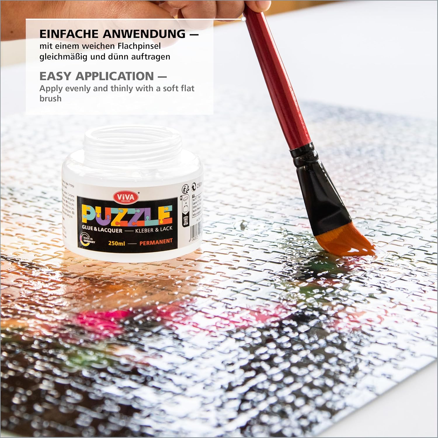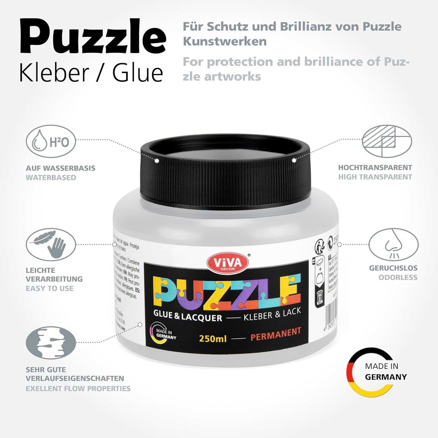Incollare e sigillare in un unico passaggio: la colla per puzzle Viva Decor fissa il tuo puzzle in modo permanente e allo stesso tempo lo protegge con una sigillatura trasparente, senza ulteriore vernice. Applicazione ottimale La colla puzzle Viva Decor, ideale per attaccare e appendere puzzle, grazie alla sua ampia apertura, permette un utilizzo confortevole con un pennello per una distribuzione uniforme. Puzzle ad asciugatura rapida Conserver: questa colla puzzle si distingue per il suo tempo di asciugatura rapida di sole 1-2 ore, perfetto per fissare e appendere rapidamente i tuoi puzzle. Finitura trasparente e lucida: una volta asciugata, la colla diventa quasi invisibile, mantenendo il motivo del puzzle nella sua brillantezza originale – ideale come adesivo per puzzle trasparente. Ampia gamma di applicazioni: è adatto come puzzle Conserver per diversi tipi di puzzle, dai piccoli puzzle per bambini ai grandi progetti per adulti. Perfetto per gli appassionati di puzzle: una scelta ideale per fissare e presentare puzzle a lungo termine, questo adesivo puzzle si rivela un compagno affidabile per qualsiasi progetto di puzzle.