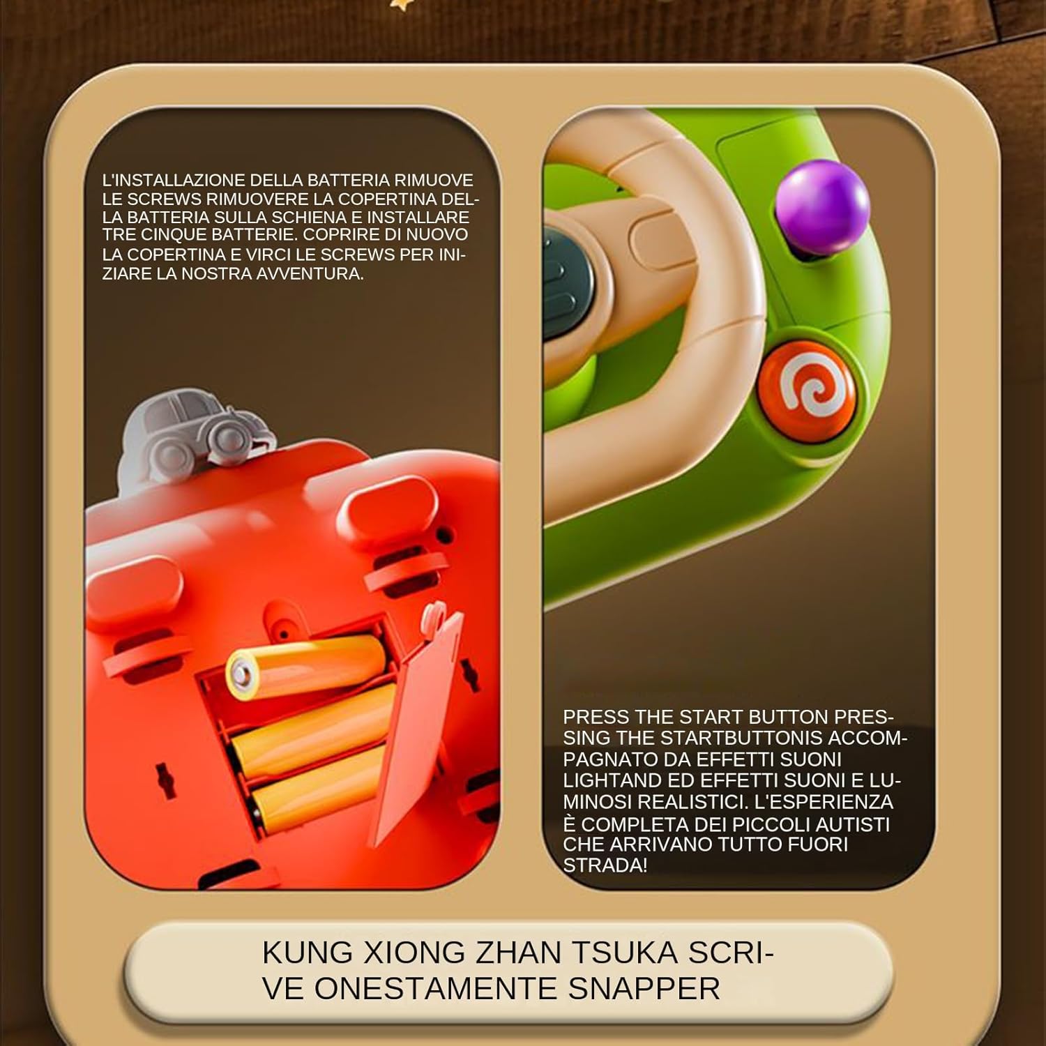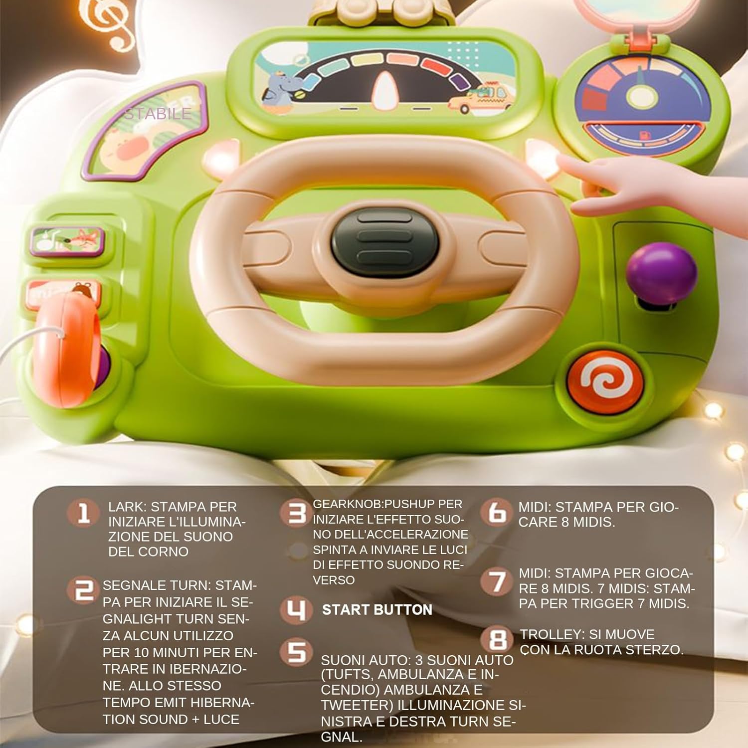 Qualità Persistenti: L'ABS studiato per giocattoli assicura che il volante mantenga forma e funzionalità nel , resistendo alla pressione e mani dei bambini durante l'utilizzo quotidiano Facile da Usare: Luci realistiche ed effetti sonori un'atmosfera di guida coinvolgente, stimolando lo sviluppo uditivo con vari metodi di attivazione per un utilizzo immediato da parte dei bambini durante il gioco esplorativo Regalo Creativo: Offri questo giocattolo volante interattivo ai bambini, proponendo un modo divertente di potenziare le abilità cognitive e insegnare loro i fondamentali concetti di sinistra e destra con naturalezza Apprendimento Giocoso: La semplice rotazione del volante genera il movimento 'auto, potenziando la concentrazione e introducendo i concetti base e direzioni per i più piccoli in maniera naturale e allegra. Funzione Automatica: Modalità riposo integrata preserva la batteria e prolunga il gioco: si attiva dopo 10 minuti senza uso, accompagnata da suoni piacevoli e indicatori luminosi per intrattenere i piccoli in modo naturale.