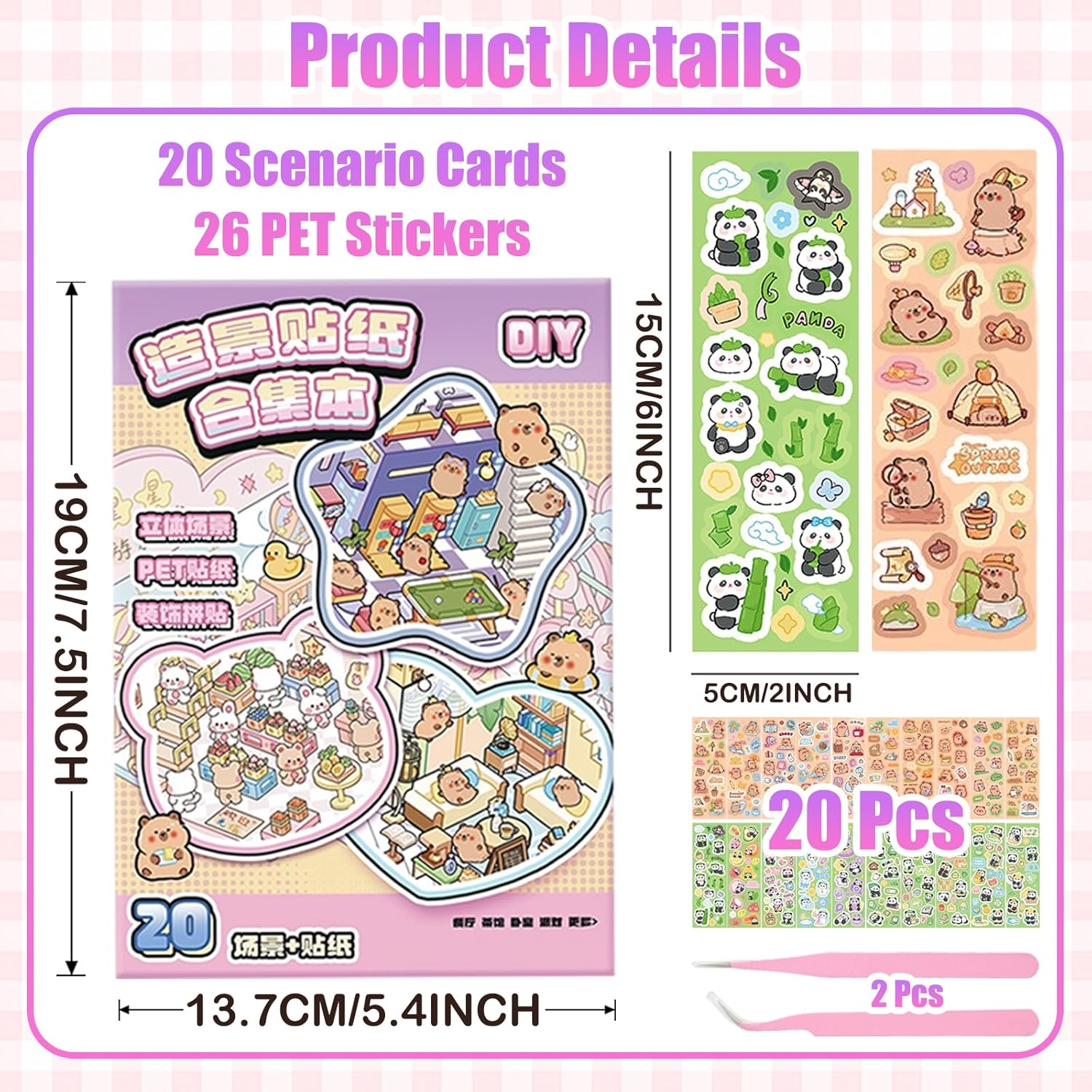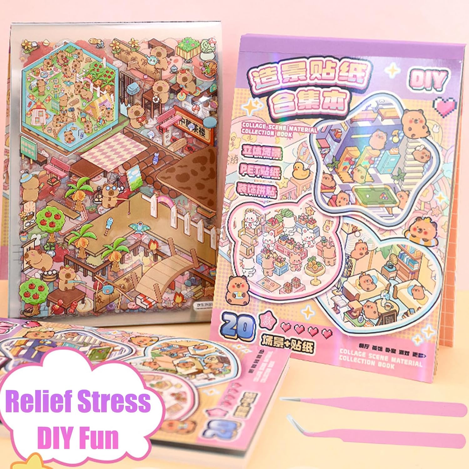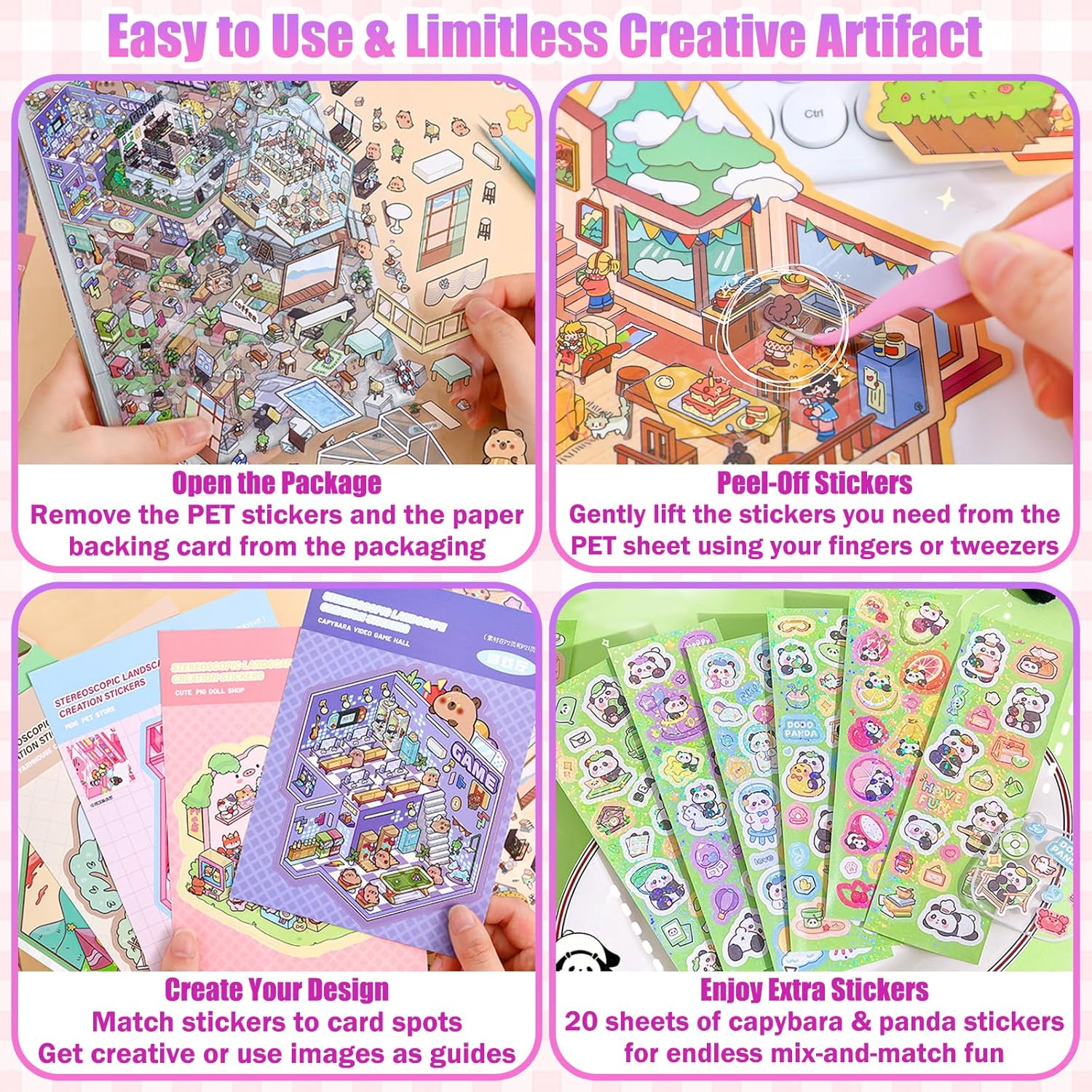 Sollievo dallo stress e divertimento creativo fai-da-te: se stai cercando sollievo dopo una lunga giornata o hai bisogno di uno sbocco creativo, la terapia con adesivi è la scelta perfetta. Calma le tue emozioni e lascia lo stress alle spalle attraverso il processo di collage meditativo utilizzando la concentrazione e la cromoterapia. Questo progetto promuove anche la pazienza e la concentrazione. Goditi ore di divertimento fantasioso e aumenta la tua creatività mentre crei la casa dei tuoi sogni. Scatena la tua creatività: questo set include 20 diversi pannelli di sfondo, 26 fogli di adesivi 3D, 10 simpatici adesivi panda e 10 giocosi adesivi Kapi. Con innumerevoli elementi dettagliati, le possibilità di combinazione sono infinite! I modelli di design sono inclusi per trarre ispirazione: seguili o lascia correre la tua immaginazione. Include 2 pinzette precise in acciaio inossidabile (diritte + curve) per un posizionamento perfetto. Materiali di alta qualità e facili da usare: le scene adesive 3D sono realizzate con carta e materiale PET di alta qualità, con stampa ad alta risoluzione e taglio preciso per colori vivaci e dettagli cristallini. I simpatici adesivi possono essere rimossi più volte e si adattano facilmente, consentendo un design personalizzato. Organizza la tua scena secondo i tuoi gusti! Il regalo ideale per creatività e relax - Gli adesivi in miniatura 3D sono perfetti per gli appassionati di artigianato, gli amanti del diario e chiunque desideri personalizzare il proprio ambiente. Che si tratti di compleanni, Natale, festival o bomboniere, queste scene adesive 3D sono un regalo unico e significativo che porta gioia e divertimento creativo e pratico. Possibilità di progettazione illimitate: gli adesivi offrono una varietà di motivi per carte con scene o da incollare su superfici lisce come quaderni, custodie per cellulari, tazze, bottiglie e altro ancora. Grazie all'adesione riutilizzabile, rimangono adesivi a lungo. Mostra il tuo stile personale e dai ai tuoi articoli un tocco colorato e allegro!