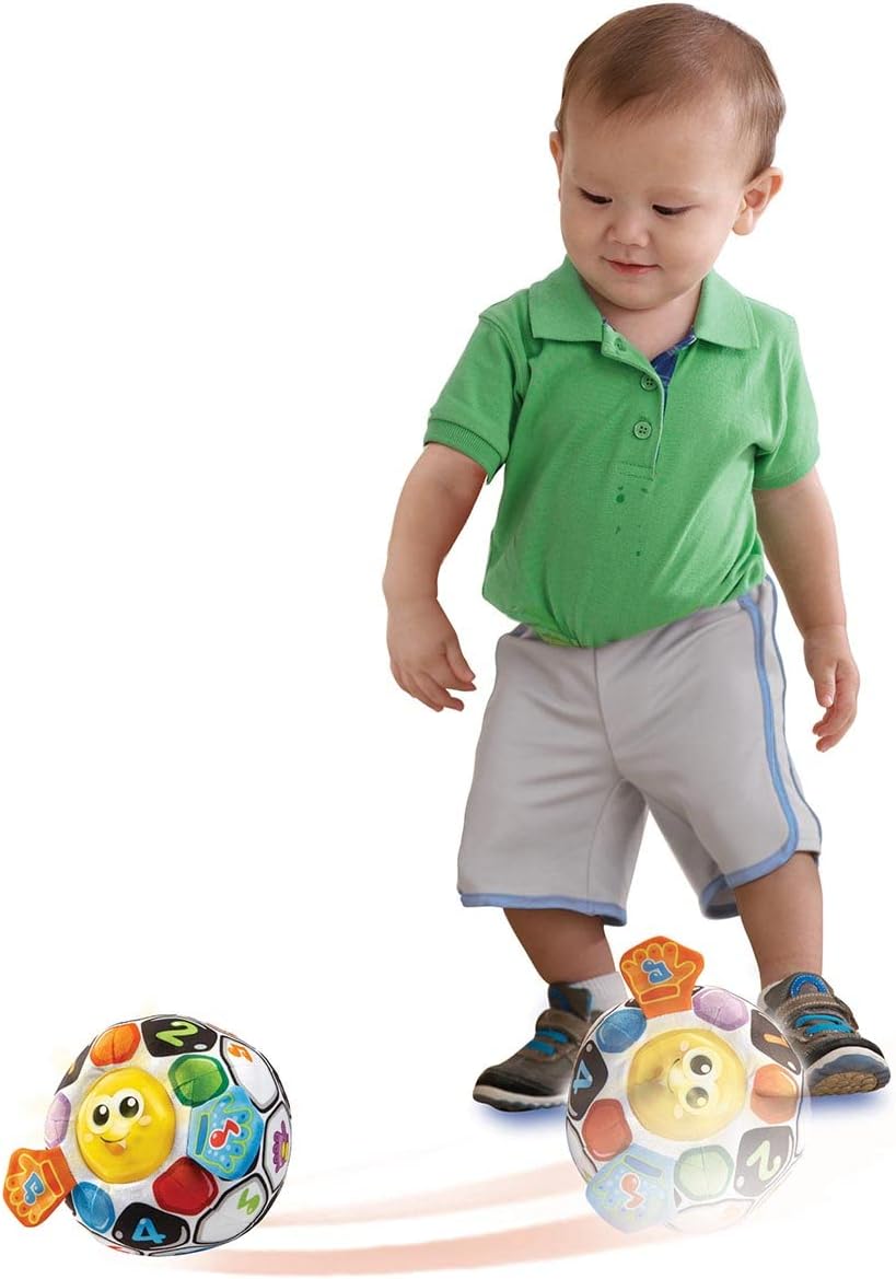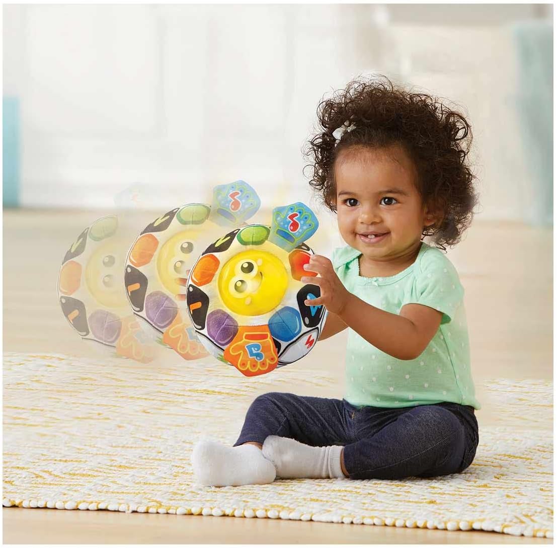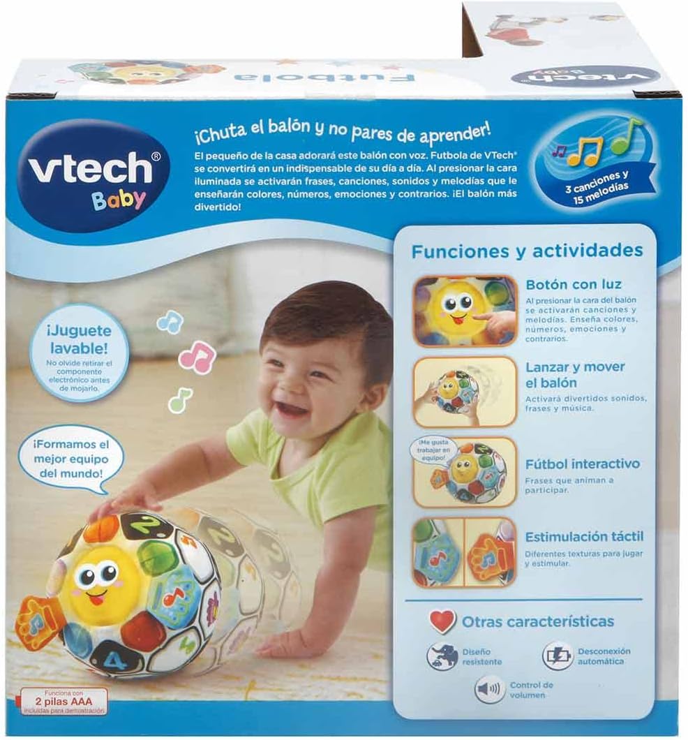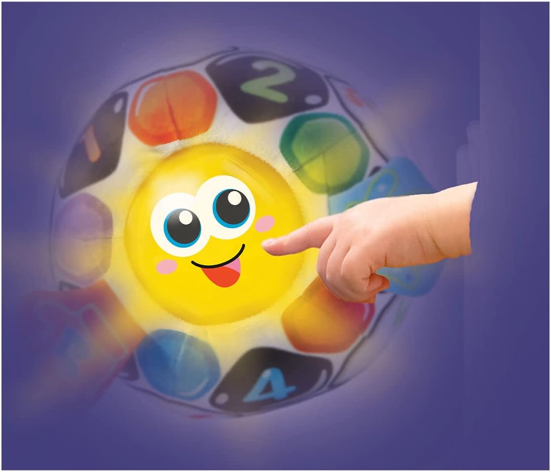 Pallone in peluche con luci e musica Premendo il pulsante luminoso sulla faccia della palla si attivano melodie e frasi divertenti mentre le luci si accendono Il sensore di movimento attiva frasi e melodie quando il bambino lancia la palla Insegna colori, numeri, emozioni e opposti La diversa consistenza sulle mani favorisce la stimolazione sensoriale Componente elettronico lavabile e facilmente rimovibile Le batterie sono a scopo dimostrativo, si consiglia di utilizzare batterie alcaline di alta qualità o batterie ricaricabili con una carica completa per migliori prestazioni Versione spagnola