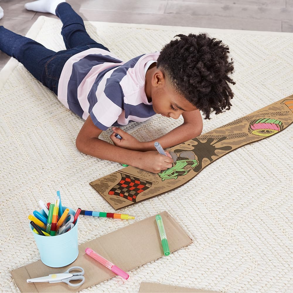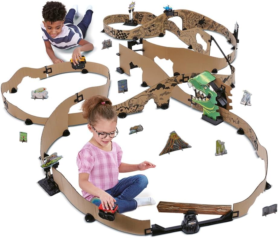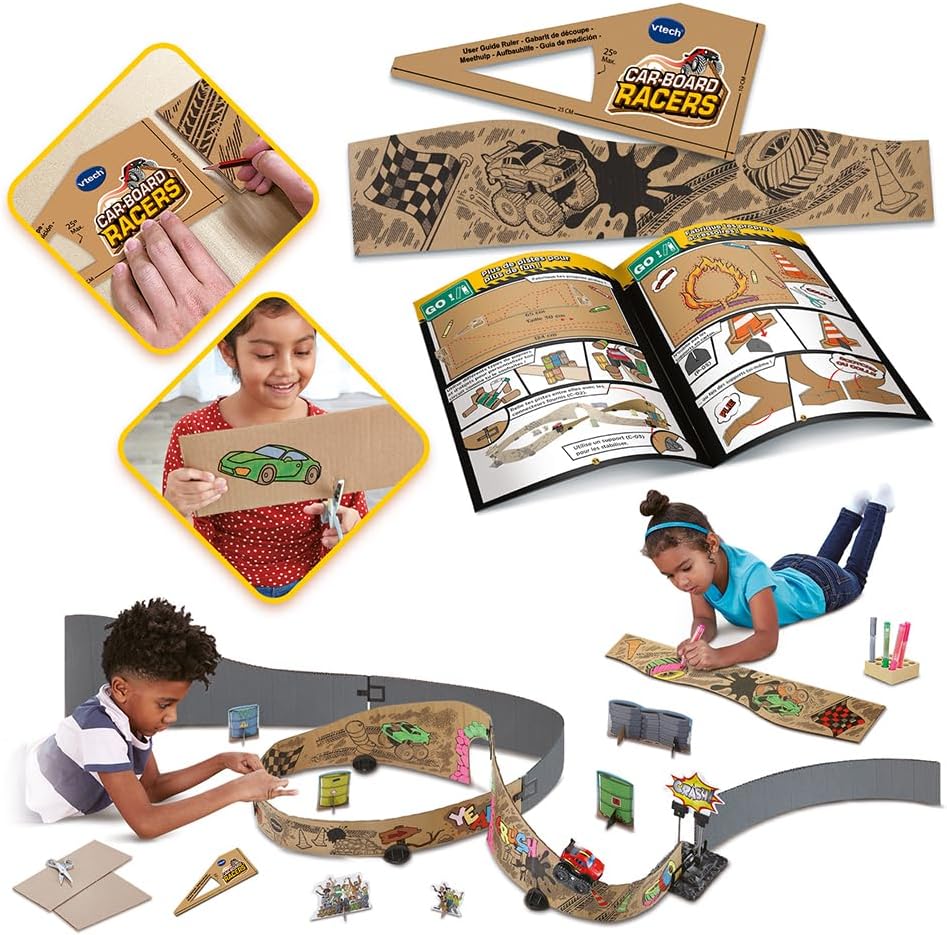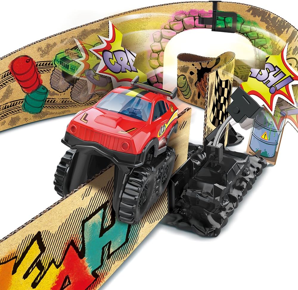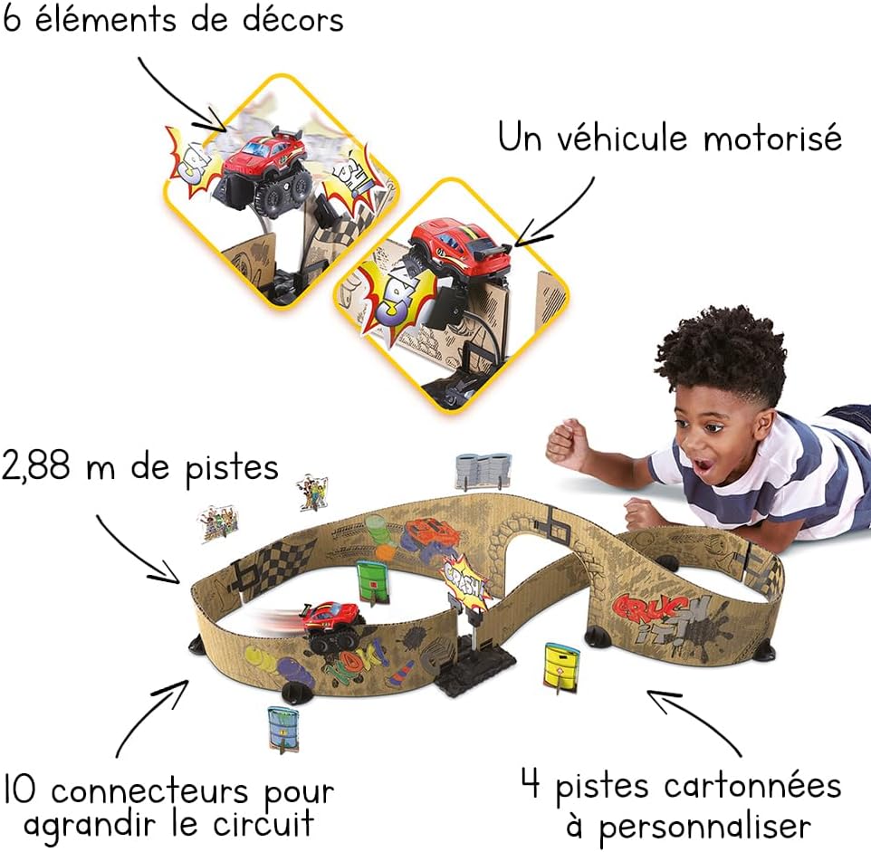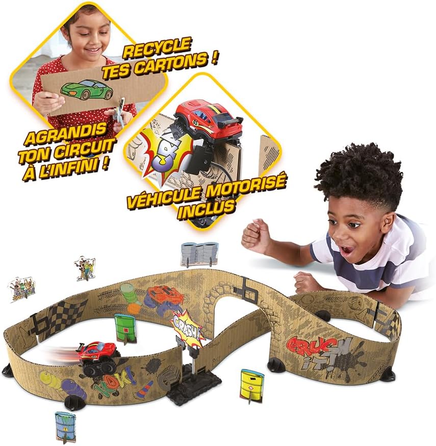 LA VERSIONE FRANCESE di questo circuito automobilistico in cartone riciclato* e riciclabile Car-Board Racers, permette ai bambini dai 5 anni in su di costruire un circuito da corsa che può essere ampliato all'infinito creando da soli nuove piste da pacchi recuperati 2,88 metri di piste di cartone stampate su entrambi i lati con illustrazioni sul tema delle corse automobilistiche. Per ancora più creatività, le 4 piste possono essere colorate e personalizzate utilizzando adesivi (non inclusi), il Monster Truck incluso è motorizzato e rotola sui bordi delle scatole di cartone per percorrere il circuito a tutta velocità evitando gli ostacoli. I suoi fari posteriori sono luminosi CONTENUTO: questo kit creativo per bambini comprende 4 piste in cartone da colorare e personalizzare, 1 macchinina Monster Truck motorizzata e illuminata con autonomia di almeno 2 ore, 10 connettori per collegare tra loro le piste ed estendere il circuito, 10 supporti e 2 ventose per stabilizzare il circuito e 6 elementi decorativi da ritagliare dalla scatola per completare il kit Funziona con 2 batterie LR6-AA non incluse Questo giocattolo è COMPATIBILE con tutti gli altri kit di costruzione della Car-Board Gamma Racers, per costruire i propri circuiti senza limiti, i bambini possono anche aggiungere piste completamente nuove al loro set realizzandole da soli con cartone riciclato e ampliare così il loro circuito, nella scatola c'è il modello da ritagliare per tracciare e realizzare le loro piste aggiuntive CAR-BOARD RACERS, si tratta di circuiti di auto unici realizzati in cartone riciclabile al 100% e contenenti almeno l'80% di materiali riciclati, da creare e costruire all'infinito, le macchinine motorizzate e illuminate rotolano sul bordo delle piste e per terra, ogni circuito è espandibile con nuove piste riutilizzando il proprio cartone di casa