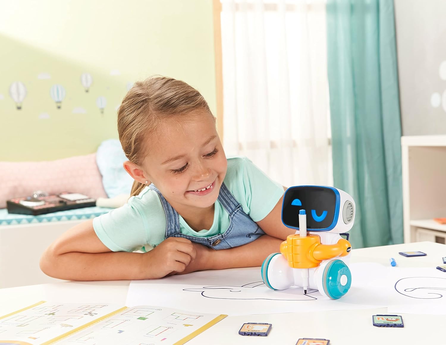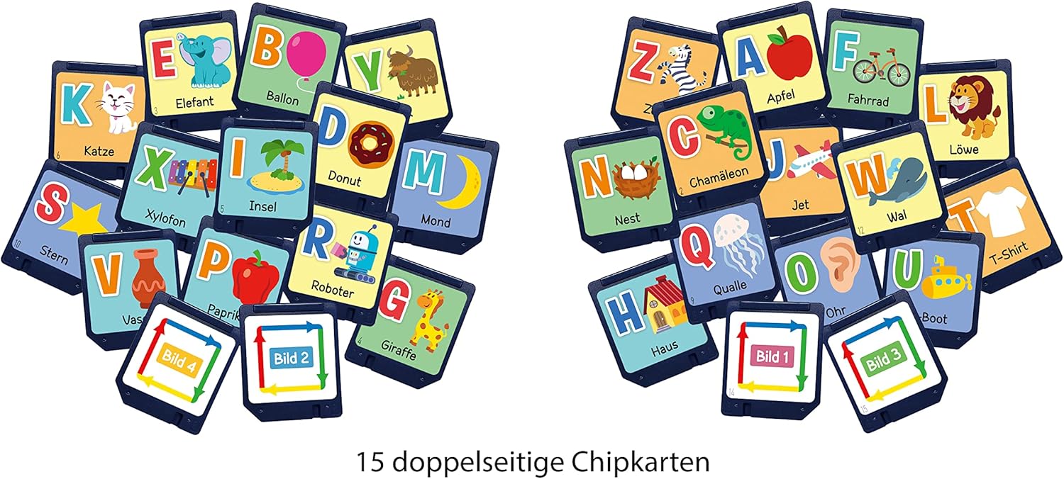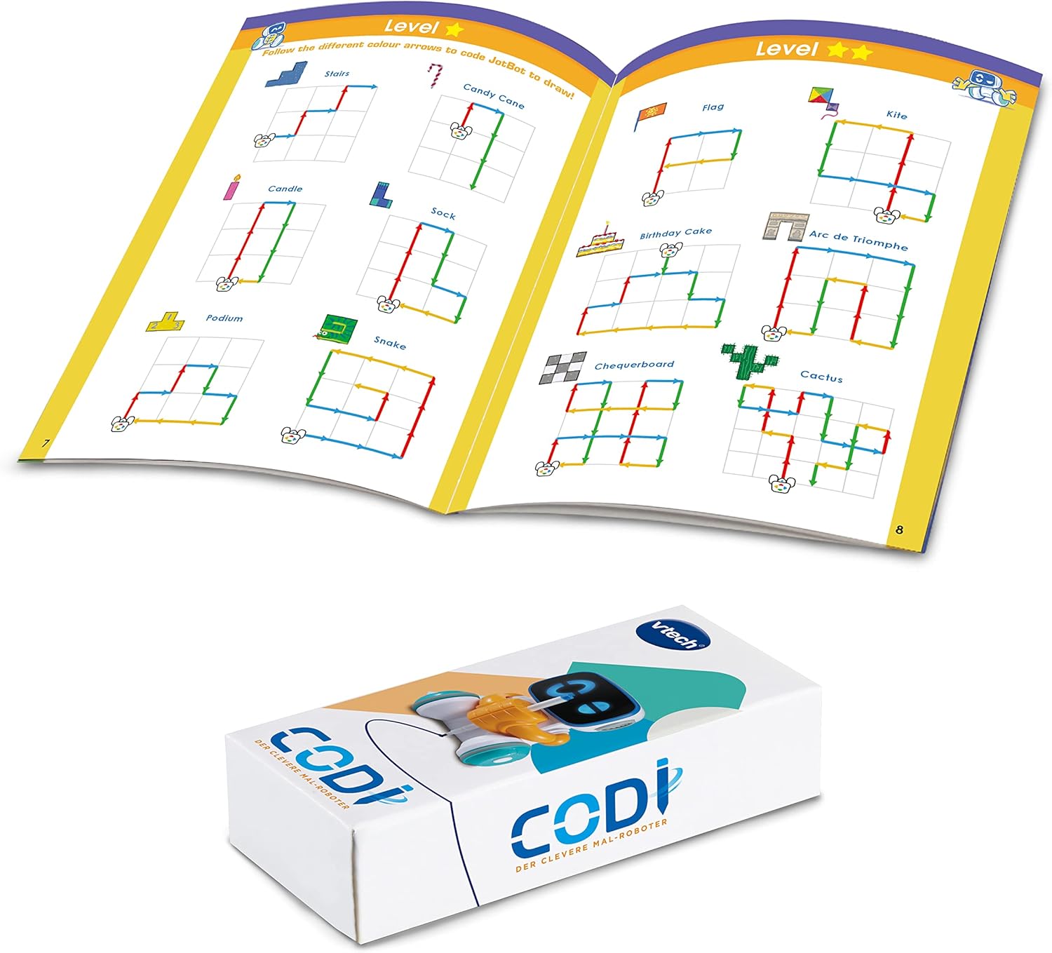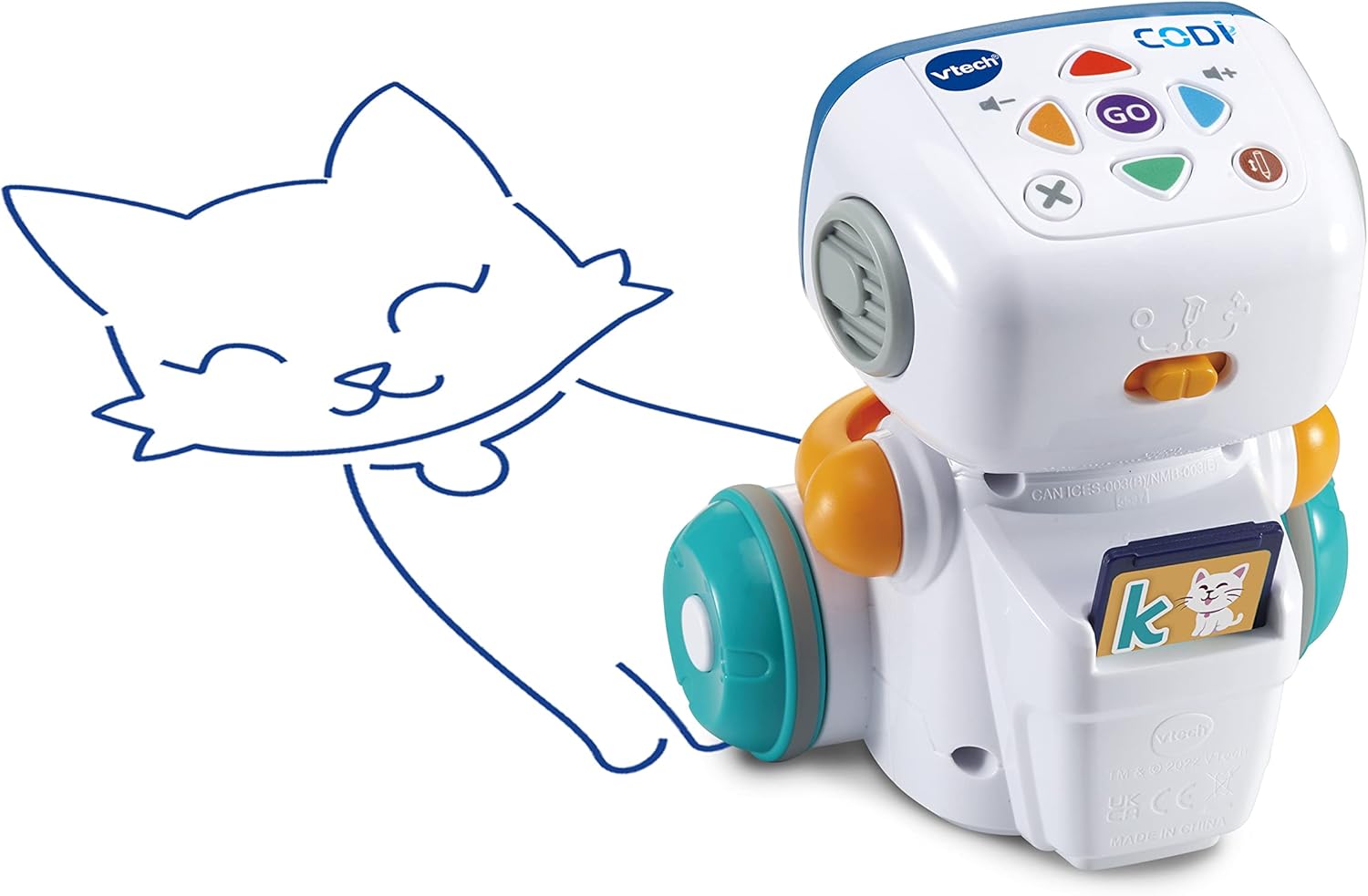Impara a disegnare con Codi: il fantastico robot dipinge fantastici disegni in diverse modalità che i bambini possono ulteriormente progettare / parla, suona musica e introduce i bambini alla programmazione Codi riconosce le dimensioni della carta, può tenere una penna e reagisce all'inserimento della chip card - basta inserire una delle 15 chip card e far disegnare la tua immagine preferita 3 modalità di gioco: Codi disegna la forma corrispondente in modalità disegno, seleziona uno dei 99 motivi o giochi quando disegna liberamente e ti permette di giocare in modalità codifica programma semplice disegni Codi mostra diverse espressioni facciali grazie ai 4 LED sul viso, sorprende con figure speciali quando si premono combinazioni di tasti segrete e ti invita a partecipare e continuare a dipingere Fornitura: 1 x VTech Codi, il robot di pittura intelligente / incl. 1 penna e manuale con 40 esempi di codifica / Versione tedesca / Età: 4-8 anni / Richiede 4 batterie AA/LR6 / Articolo n.: 80-553704