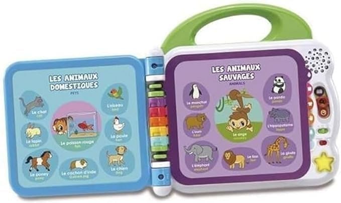 VERSIONE: francese ETÀ: dai 18 mesi ai 4 anni, questo libro illustrato parlante e interattivo ti permette di scoprire 100 vocaboli con i personaggi dei “Piccoli Scolari”. 100% BILINGUE: il bambino scopre i suoi primi vocaboli in francese e inglese APPRENDIMENTO: 12 pagine educative laminate e illustrate con sensori sensibili per selezionare le illustrazioni e fare numerose scoperte. Ogni pagina di apprendimento è classificata per tema: animali domestici/selvatici, frutta, cibi, colori, parti del corpo, opposti... 3 MODALITÀ DI GIOCO: Vocabolario, Scoperte e Suoni divertenti INCLUSO: 100% bilingue / Maniglia per una facile manipolazione / 2 canzoni in francese + 2 canzoni in inglese ed effetti sonori divertenti / Regolazione del volume del suono e spegnimento automatico / Funziona con 2 batterie LR6 incluse