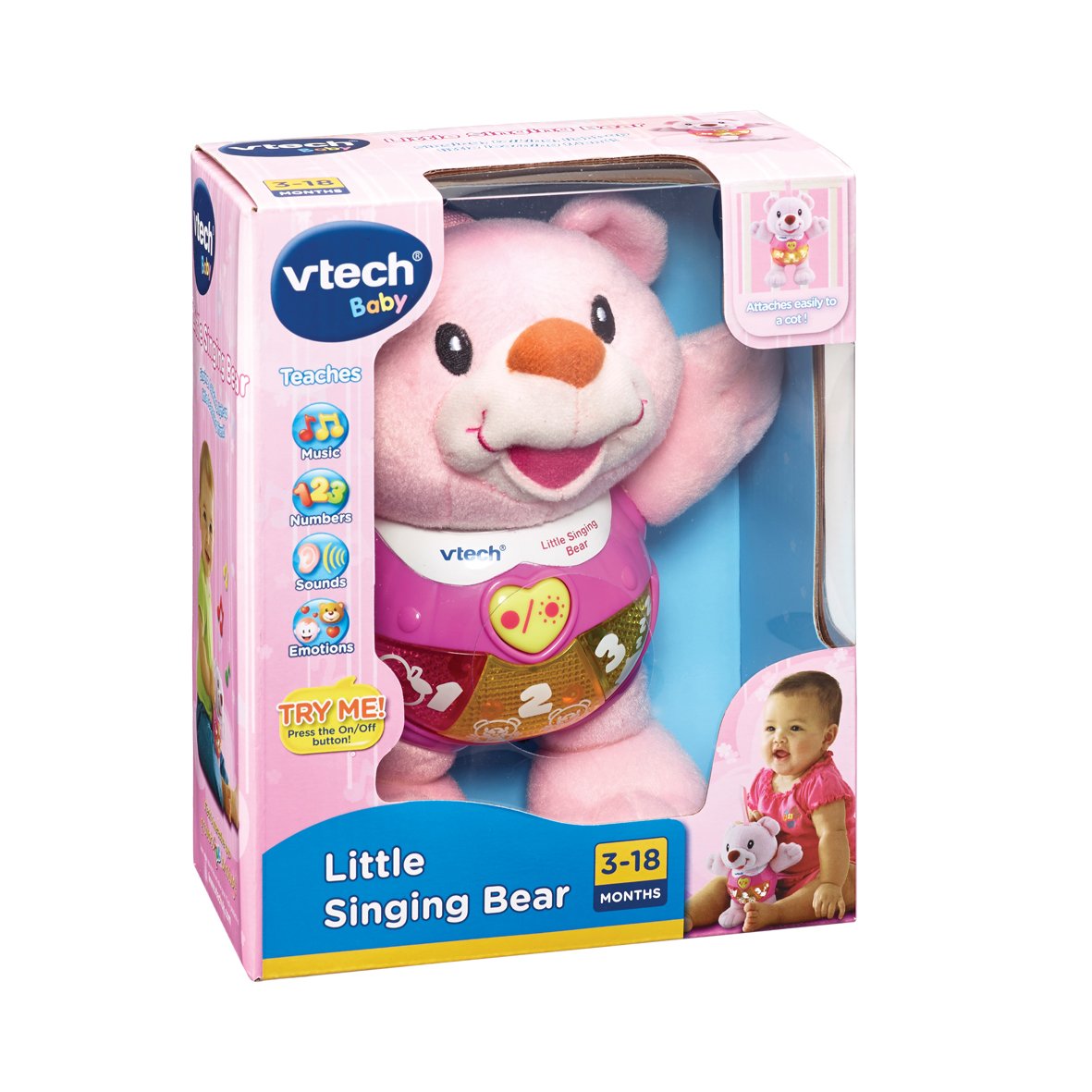 3 grossi pulsanti luminosi colorati Introducono emozioni, numeri e conteggio Anello di fissaggio in stile velcro per il fissaggio alla culla o al passeggino Include tante frasi divertenti e amichevoli ed effetti sonori Richiede 2 batterie AAA (incluse)