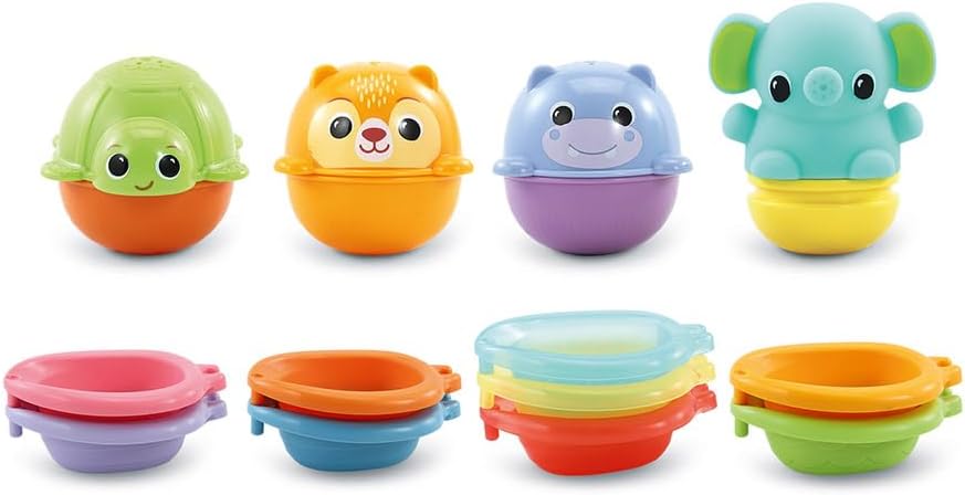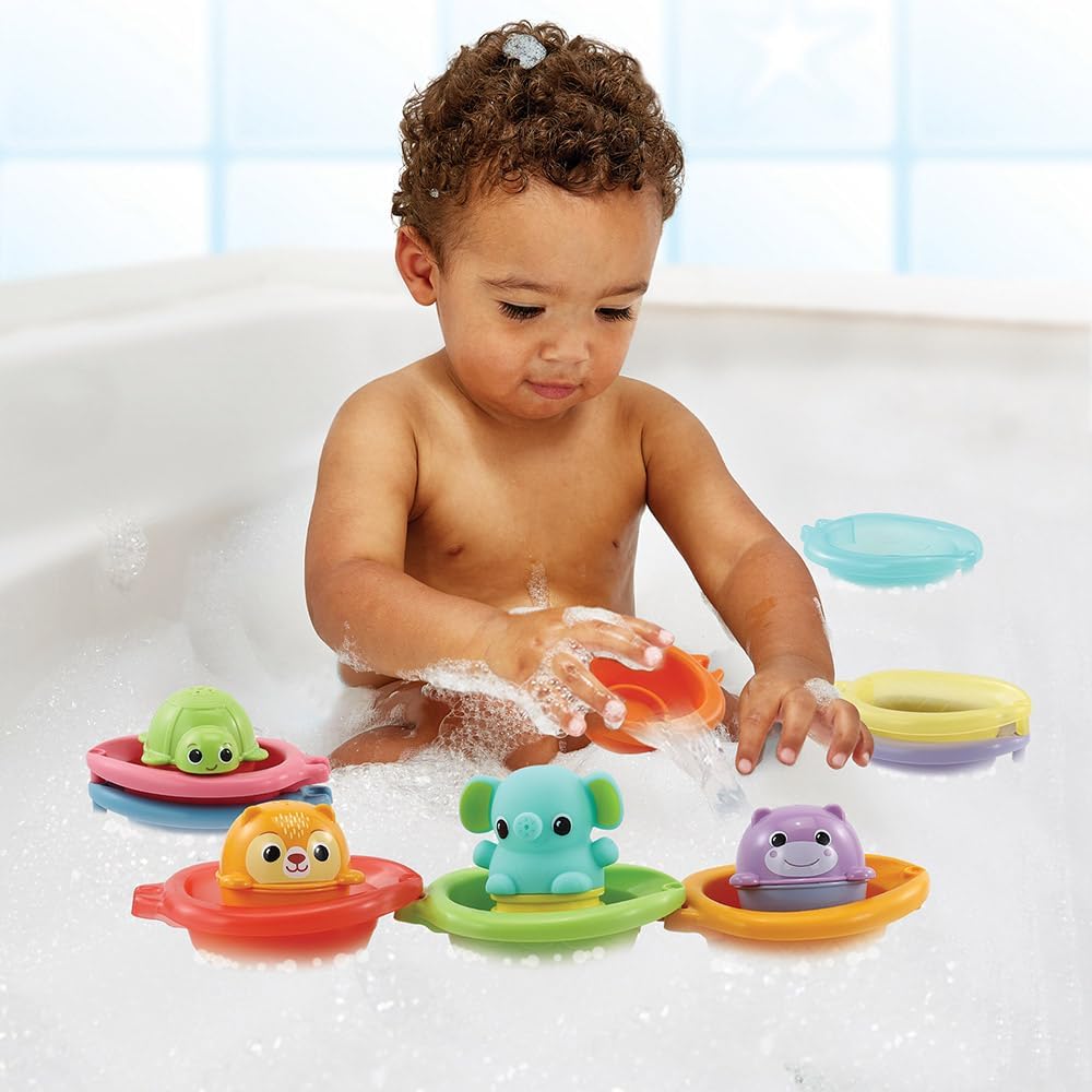LA VERSIONE FRANCESE di questo set di giochi da bagno permette ai bambini a partire da 12 mesi di navigare nell'acqua della vasca in compagnia degli animali! FACILI DA LAVARE e ASCIUGARE, i 4 animaletti si aprono per essere risciacquati e asciugati velocemente. Le barchette si attaccano l'una all'altra in modo da poterle portare tutte insieme per una gita nella vasca da bagno e impilarle per riporle facilmente. CONTENUTO: questo set per bambini comprende 13 giocattoli da bagno tra cui 9 barchette, 3 animali versatori e 1 elefante abbeveratoio. Questi giocattoli non sono elettronici. VTECH BABY è la gamma VTech di giocattoli per la prima infanzia che supporta in sicurezza i bambini dalla nascita ai 3 anni nel loro sviluppo e nel primo apprendimento.