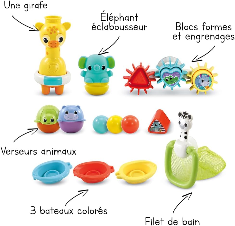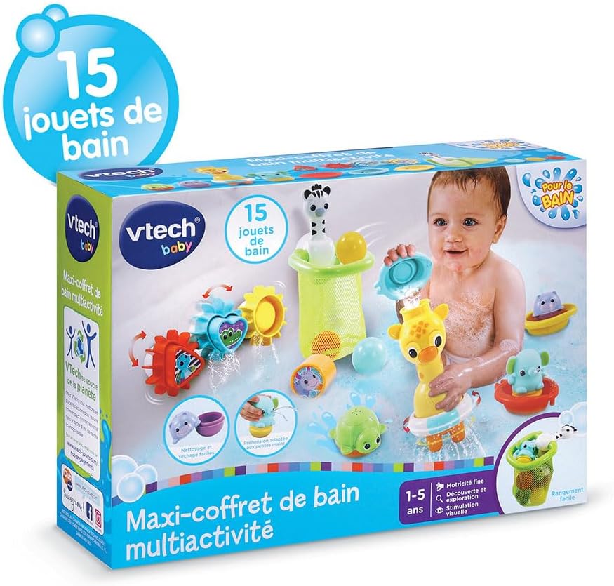 LA VERSIONE FRANCESE di questo set di giochi da bagno permette ai bambini a partire dai 12 mesi di cambiare attività per non annoiarsi mai nel bagno! La varietà di giocattoli di questo set completo permette al bambino di cambiare gioco da un bagnetto all'altro e di stimolare le sue capacità motorie in modo diverso maneggiando ciascun giocattolo. PRATICA, la rete è sia un elemento di gioco sotto forma di guadino o mini canestro da basket, sia un contenitore in cui far asciugare anche piccoli giocattoli. La ventosa facilita il fissaggio alle pareti del bagno. CONTENUTO: questa scatola per bambini include 15 giocattoli da bagno tra cui 3 palline, 3 barchette, 1 rete da gioco e portaoggetti, 3 blocchi di forme e ingranaggi e 4 versatori di animali. Questi giocattoli non sono elettronici. VTECH BABY è la gamma VTech di giocattoli per la prima infanzia che supporta in sicurezza i bambini dalla nascita ai 3 anni nel loro sviluppo e nel primo apprendimento.