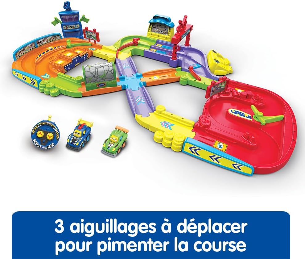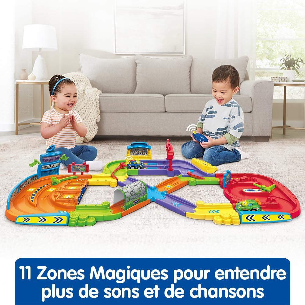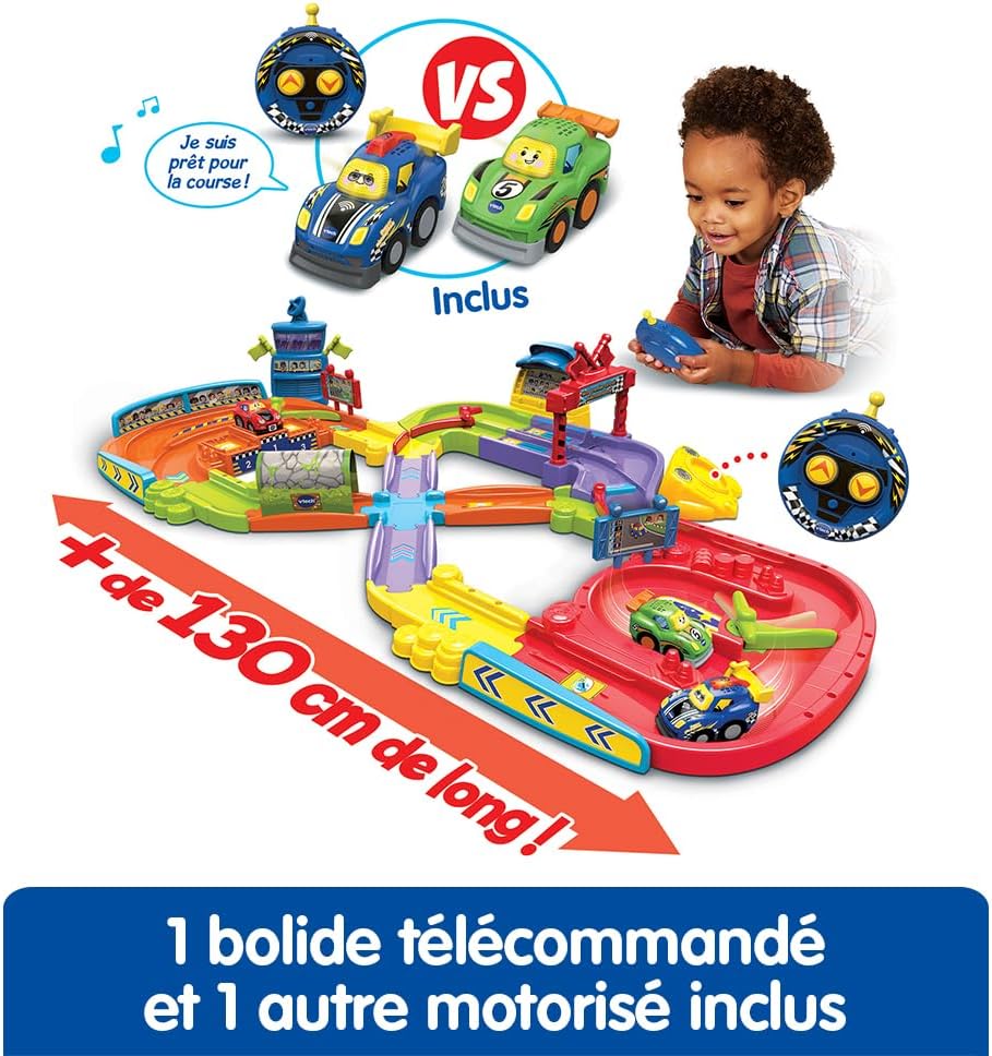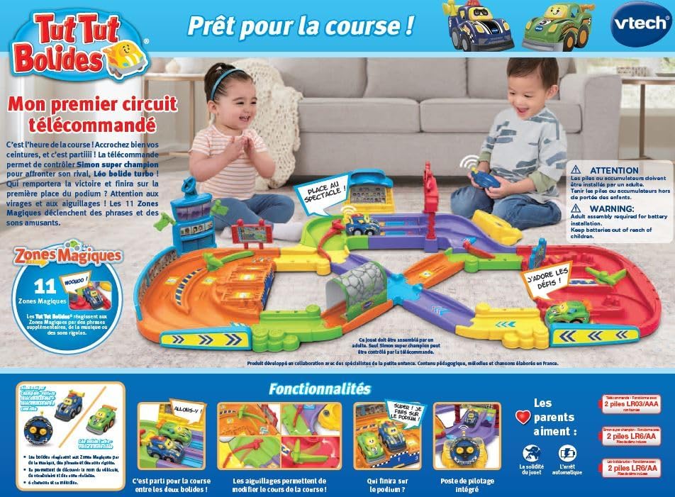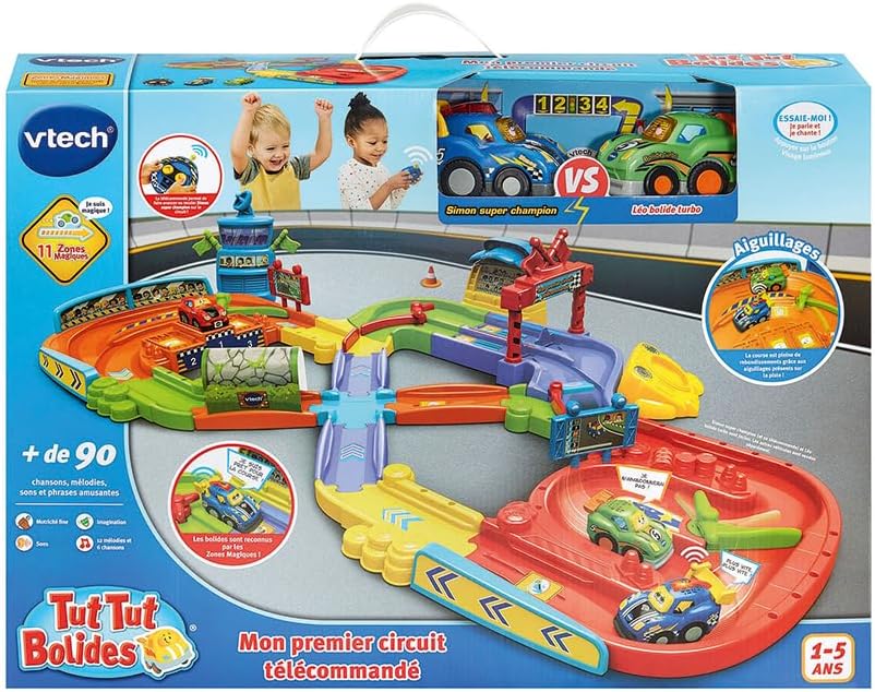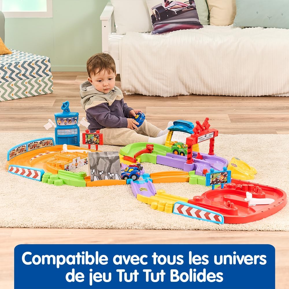LA VERSIONE FRANCESE di questo circuito automobilistico Tut Tut Bolides permette ai bambini a partire da 1 anno di dare nuovo slancio alle loro piccole corse automobilistiche guidando loro stessi un super Tut Tut Bolide RC! Chi vincerà la gara, l'auto da corsa Léo turbo o il super campione Simon? Le scommesse sono aperte! Guidando a distanza la sua macchinina telecomandata, il bambino migliora la coordinazione occhio-mano per cercare di sconfiggere l'auto motorizzata rivale. CONTENUTO: questo set di auto comprende 1 Tut Tut Bolide radiocomandato, il suo telecomando per guidarlo, 1 Tut Tut Bolide motorizzato e 30 pezzi di gioco e accessori per assemblare la pista e immaginare le avventure delle sue auto. 11 zone magiche. Ogni macchina canta 3 canzoni e suona 6 melodie (6 canzoni e 12 melodie in totale). Arresto automatico delle auto. Funziona con 4 batterie LR6-AA in dotazione (2 per auto) e 2 batterie LR03-AAA non in dotazione (per il telecomando). Questo giocattolo per bambini è COMPATIBILE con tutte le collezioni Tut Tut Bolides. I mondi di gioco si collegano tra loro per costruire circuiti infiniti e condividere grandi avventure! I BOLIDE TUT TUT sono macchinine musicali, parlanti e luminose che stimolano la fantasia dei bambini a partire da 1 anno. Sono anche interattivi poiché vengono riconosciuti dalle Zone Magiche situate sui binari dei mondi di gioco e attivano contenuti audio aggiuntivi!