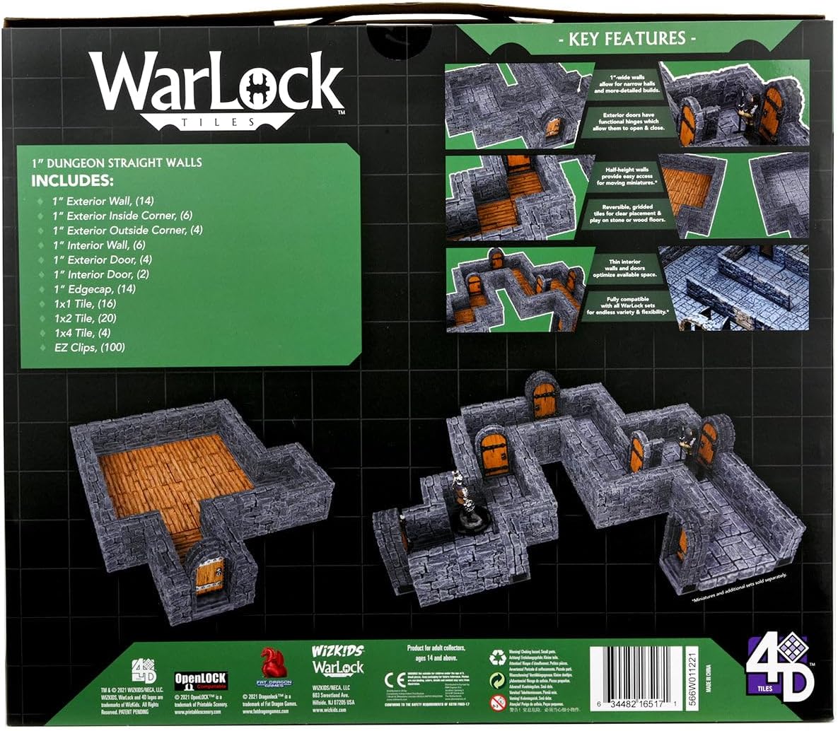 Per edifici dettagliati: le pareti larghe 2,5 cm consentono sale strette e costruzioni più dettagliate. Porte funzionali: le porte esterne hanno cerniere funzionali che consentono loro di aprirsi e chiudersi. Facile accesso: le pareti a mezza altezza offrono un facile accesso per miniature in movimento. Doppio uso: piastrelle reversibili a griglia per un posizionamento chiaro e giocare su pavimenti in pietra o legno. Compatibile con altri set – Completamente compatibile con tutti i set WarLock per infinite varietà e flessibilità.