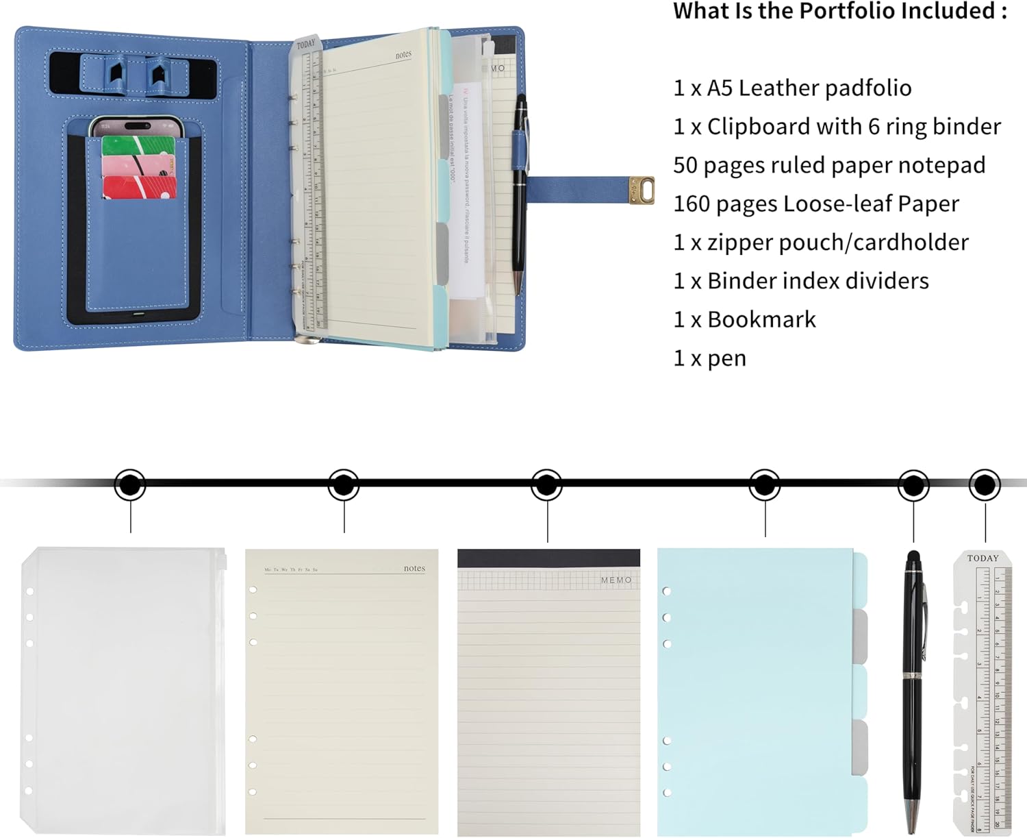 RILEGATURA FLESSIBILE E CARTA RICARICABILE - Migliora la tua vita professionale con il nostro portafoglio di rilegature flessibili. Le rilegature facilmente rimovibili e sostituibili offrono una flessibilità quotidiana senza pari, garantendo ampio spazio per tutti i tuoi pensieri, appunti e progetti. IL PROFESSIONISTA CREATIVO - Scatena la tua creatività con un'agenda multifunzionale che include un portablocco, un raccoglitore a 6 anelli, divisori per indici, segnalibro, penna e custodia con cerniera, soddisfacendo tutte le tue esigenze di scrittura e organizzazione. SCRITTURA PREMIUM - Goditi una scrittura di qualità superiore su 210 pagine di carta color crema da 100 g/m², progettata per impedire il trasferimento dell'inchiostro e mantenere i tuoi appunti nitidi e chiari. DESIGN SUPPORTO E CUSTODIA PER TELEFONO - Goditi funzionalità migliorate con il nostro ultimo design dotato di supporto per telefono integrato e custodia protettiva. Ideale per l'uso a mani libere, garantisce che i tuoi oggetti essenziali siano sempre a portata di mano e conservati in modo sicuro. STILE VINTAGE CON RESISTENZA - Proteggi le tue idee con stile con una copertina in pelle PU vintage, splendidamente goffrata per un look elegante, fornendo allo stesso tempo una protezione duratura per i tuoi appunti.
