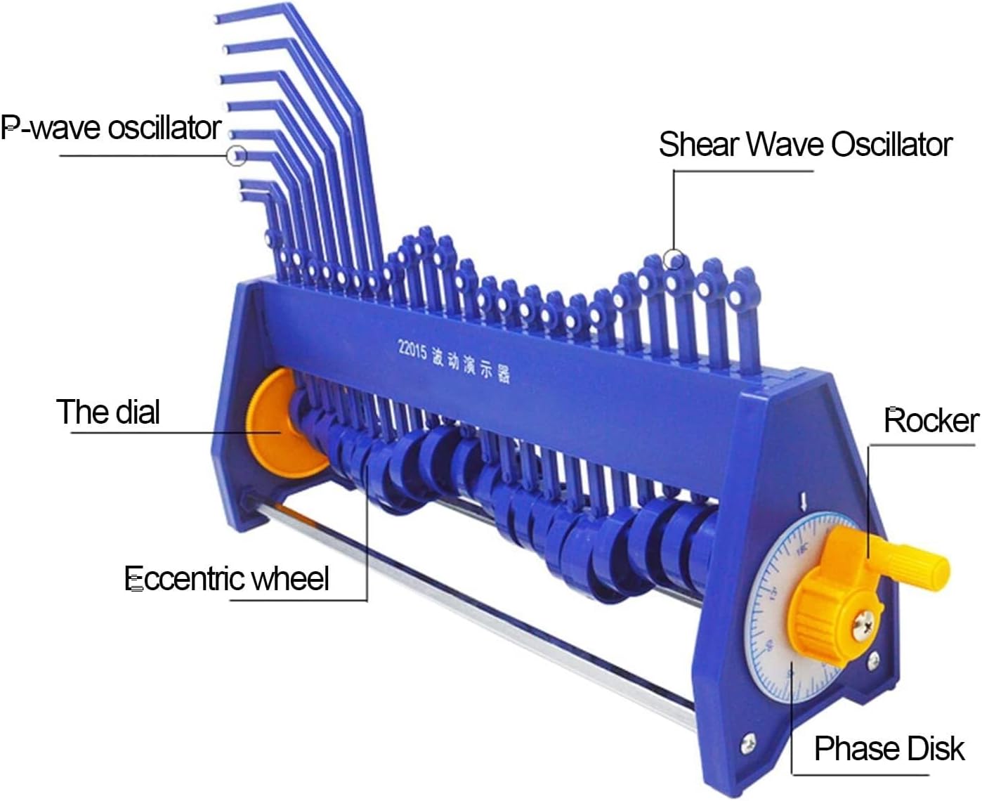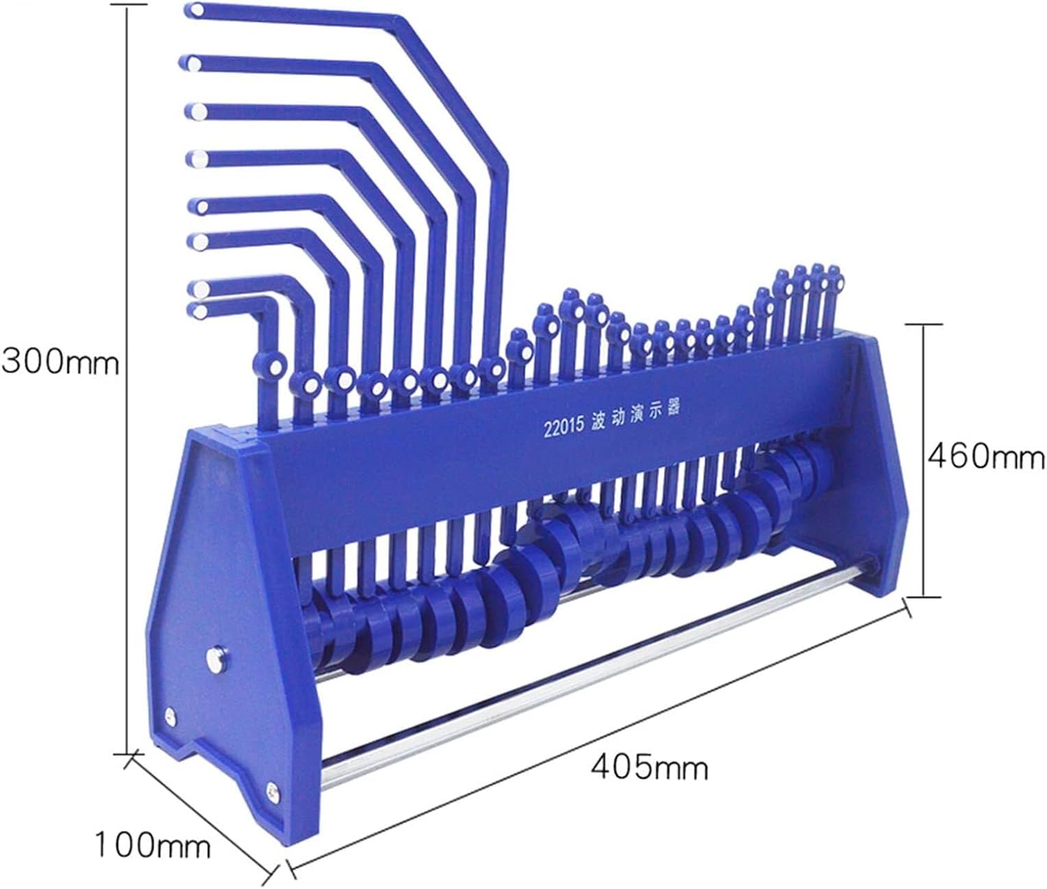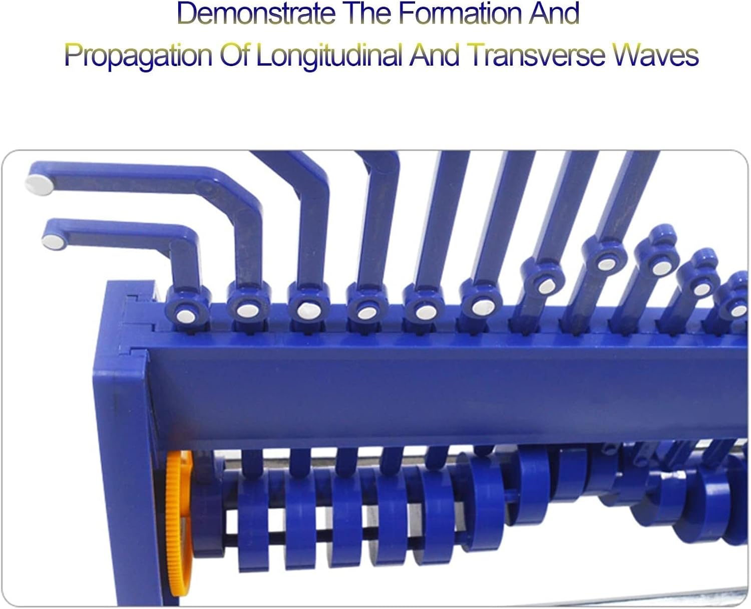 Struttura e principio: Ci sono 24 ruote eccentriche sullo stesso albero rotante nello strumento. Quando la prima ruota eccentrica ruota di 45°, aziona la seconda ruota eccentrica per ruotare, e la seconda ruota eccentrica aziona la terza ruota eccentrica dopo aver girato di 45°. Una alla volta, aziona la successiva alla volta, e persino 24 vengono girate. Materiale: plastica, accessori in metallo Dimensioni: lunghezza 405*larghezza 100*altezza totale 300mm Applicazione: Strumento speciale dimostrativo o sperimentale per l'insegnamento della fisica nelle scuole medie e per la ricerca sulla formazione e la propagazione delle onde. Metti l'istruzione nel divertimento, coltiva la conoscenza scientifica. Perfetto per qualsiasi casa, scuola o laboratorio.