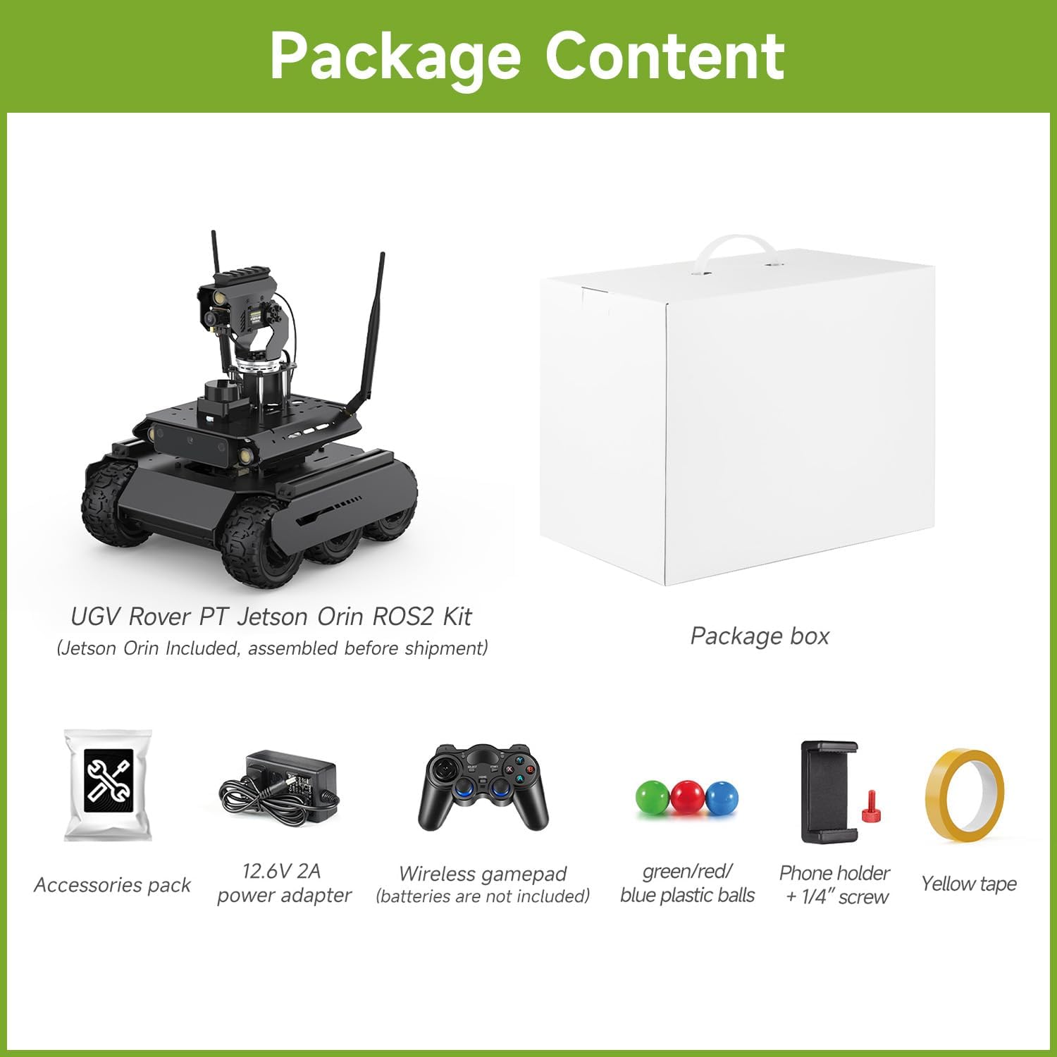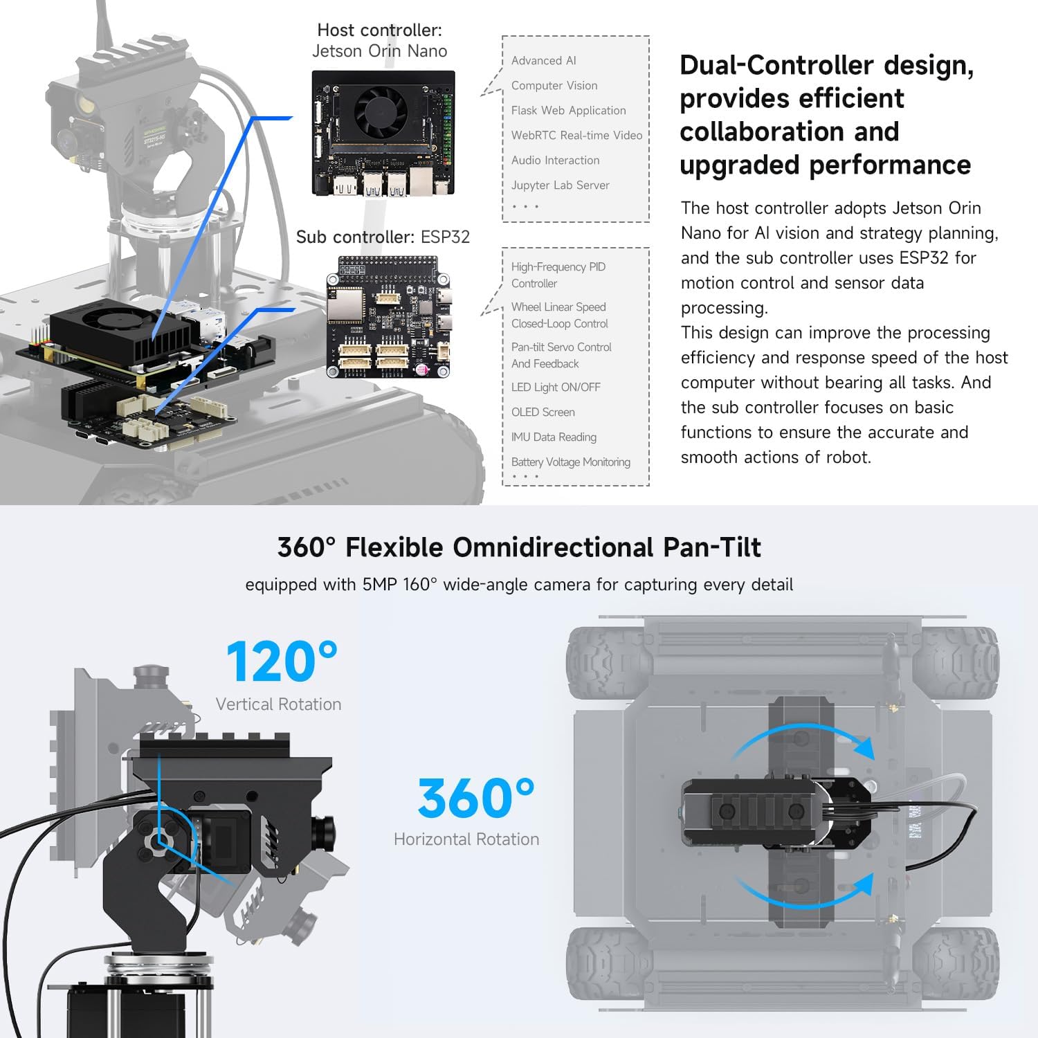 The main control of the slave device is ESP32, which is responsible for precise motor PID control and multiple sensor readings. The host device Jetson Orin Nano(Included) provides high-end computing power. The two-layer architecture makes the robot run more efficiently. Equipped with a 2-degree-of-freedom high-torque flexible pan-tilt, providing a wide 360° viewing angle horizontally; equipped with a 160° ultra-wide-angle 5MP camera to capture a wider range of images The host device is developed based on Ubuntu 22.04, the ROS2 function is developed based on the Humble version, the WEB application is based on Flask and Python languages, and the software platform is all open source. Integrate robot vision functions such as color, object, gesture recognition, face, and motion detection, and can be expanded to more applications. Using 3S lithium battery UPS power supply system, it supports continuous use while charging, ensuring long-lasting endurance Provide a wealth of JupyterLab interactive tutorials, graphic tutorials, video tutorials and ROS2 function tutorials, from introductory functions to advanced functions, reducing the learning curve for beginners in robot technology. Real-time video streaming, digital zoom, photography, video recording and other functions, and WEB application real-time video function and robot information displayed on the screen to improve user interaction experience Support cross-platform remote control without installing APP. You can follow tutorials to implement remote control beyond the local network using solutions such as Pgyer, Cpolar, LocalTunnel, and others. 2mm thick all-aluminum alloy shell provides excellent structural strength and durability. Four-wheel drive system with soft anti-skid rubber tires to ensure that the robot has good grip and stability on various terrains. The structure is equipped with an expansion plate and Picatinny rails to facilitate the expansion of other tactical accessories; in terms of hardware, there are spare LED light interfaces that can be used to expand other peripherals such as water guns. The product can also be expanded with 4G & 5G modules to facilitate users to realize more possibilities. Equipped with 4 geared motors with encoder to achieve closed-loop speed control, the max speed can reach 1.3m/s, providing strong power