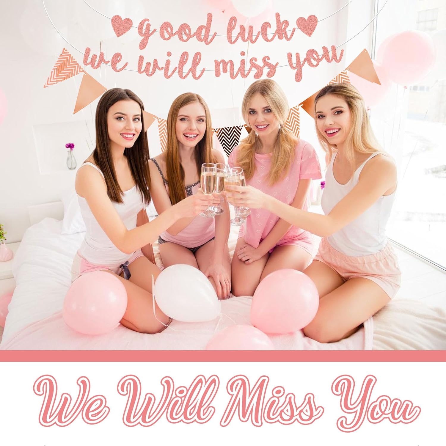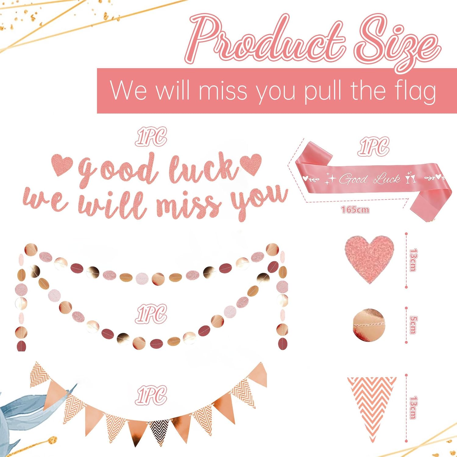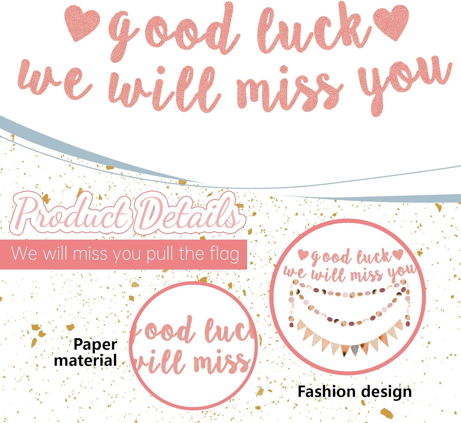 Decorazioni per il pensionamento: Riceverai 23 lettere per banner, 1 nastro di fortuna, 12 bandierine glitter e 1 ghirlanda rotonda glitterata, che daranno immediatamente vita e energia alla tua festa creando un'atmosfera calorosa di addio Design unico: Questa decorazione a tema addio include striscioni in rosa dorato con scritte "good luck" e "we will miss you", creando un effetto visivo memorabile e migliorando immediatamente l'atmosfera dell'evento Materiali di alta qualità: Il nastro di fortuna è realizzato principalmente in carta glitterata di alta qualità e utilizza una tecnologia di taglio sofisticata per garantire bordi lisci, possono essere riutilizzati per creare una decorazione sincera che esprime i tuoi migliori auguri Facile da installare: Devi solo assemblare le lettere del banner con i nastri nell'ordine corretto, così puoi appenderli rapidamente senza strumenti complicati, risparmiando tempo ed energia e godendoti la gioia dell'evento Occasioni applicabili: Che si tratti di una festa di pensionamento, festa di addio, cerimonia di laurea o promozione, questo set di decorazioni è la scelta ideale per rendere indimenticabile ogni momento speciale con auguri e calore