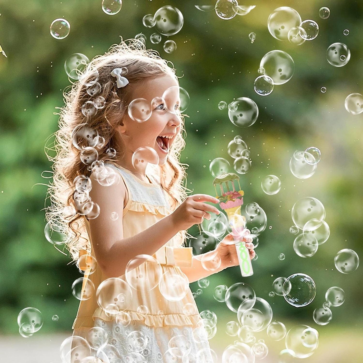 Dettagli accattivanti: giostra in miniatura in plastica resistente che incorpora un serbatoio ergonomico per una facile movimentazione. Il design unico con motivi rotanti produce spirali regolari di bolle senza spruzzi di liquido Momento magico garantito: crea facilmente nuvole di bolle giganti Illuminazione magica: scopri una giostra scintillante dotata di un generatore manuale: gira la manovella per illuminare le tue serate con una luce magica che dissipa l'oscurità all'istante. Perfetto per creare un'atmosfera magica all'aperto Felicità Infinita: Il meccanismo di erogazione controllata combinato con il tappo a spirale crea un flusso continuo di bolle perfette con una pulizia ottimale, ideale per feste all'aperto Regalo incantato: Soluzione di intrattenimento versatile per festival, spettacoli dal vivo e attività all'aperto. Leggero ed ergonomico, questo accessorio effimero crea effetti visivi poetici per cabine fotografiche e cerimonie commemorative