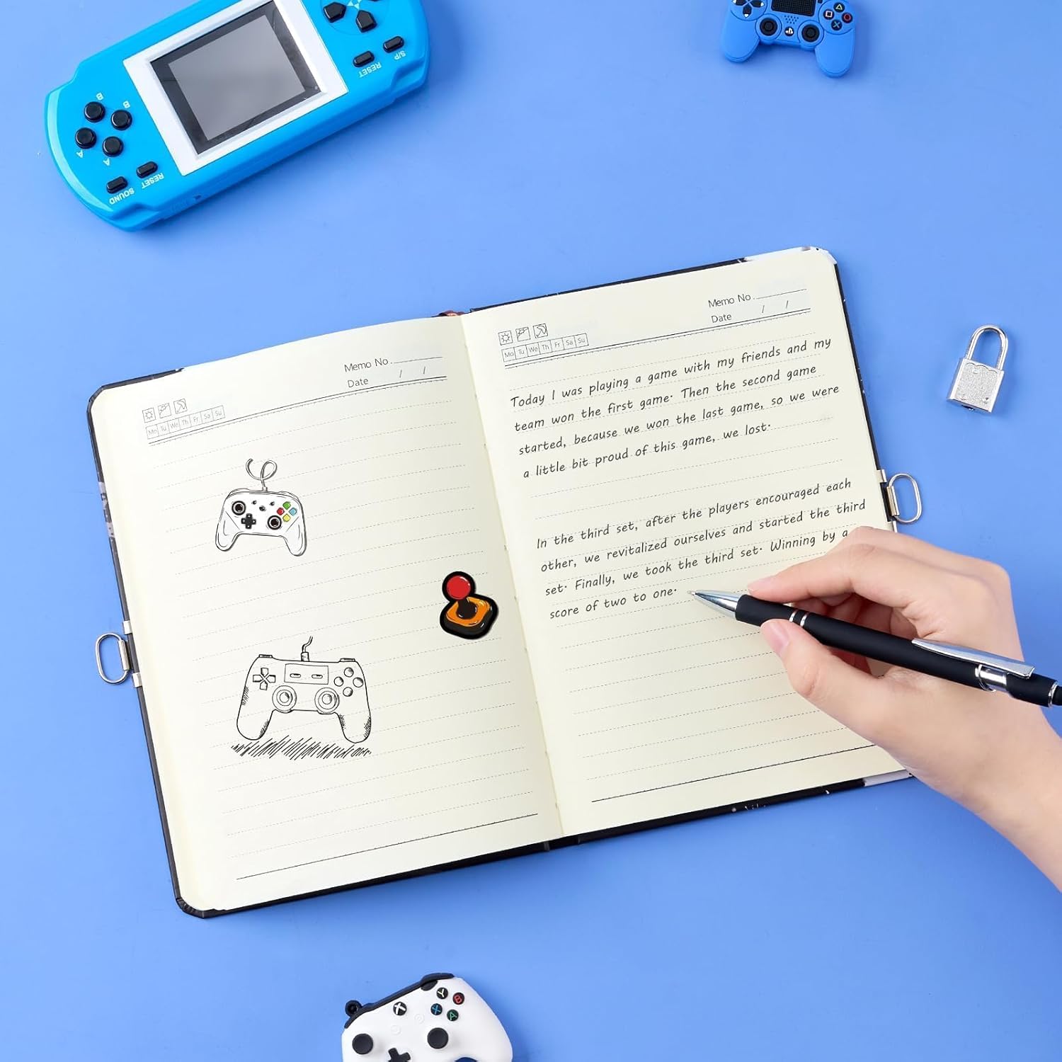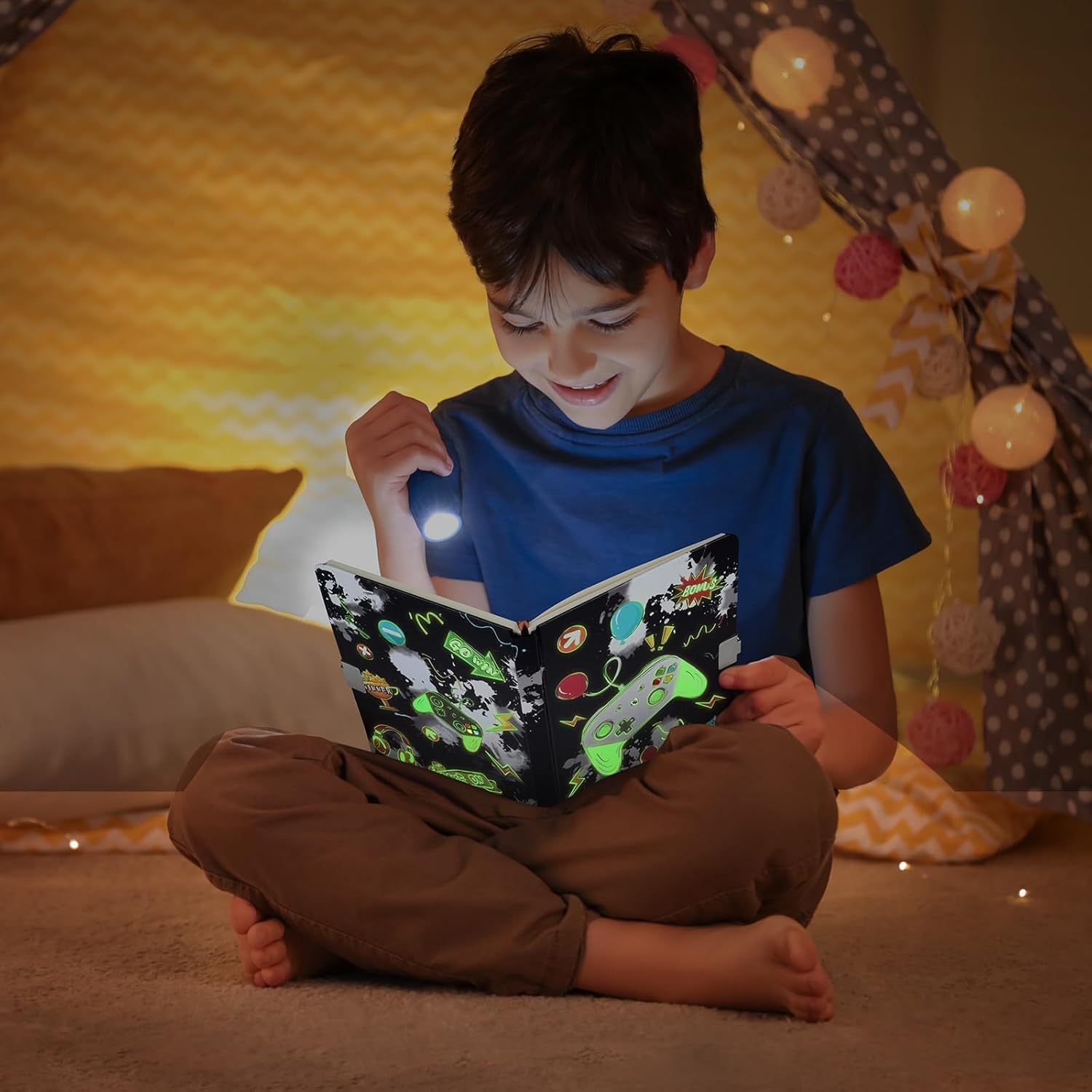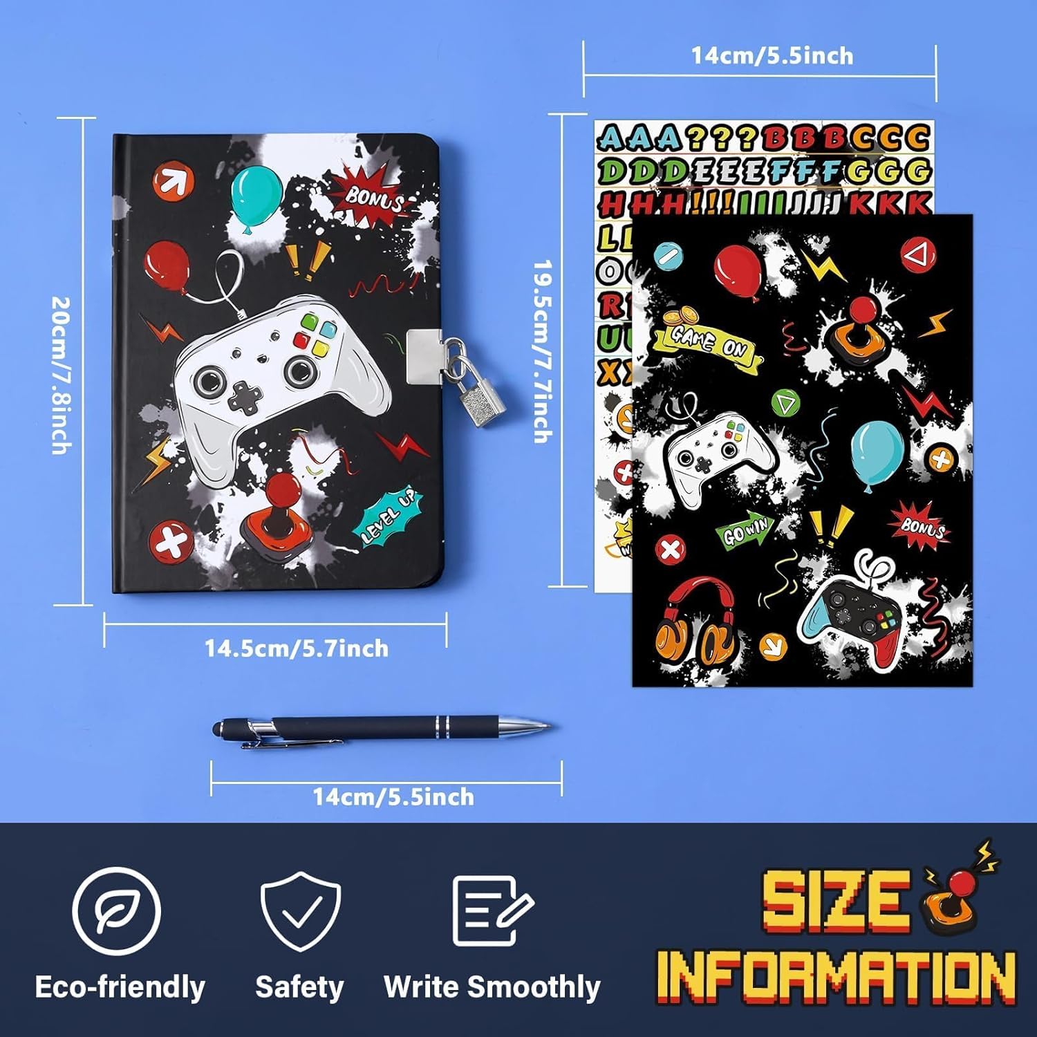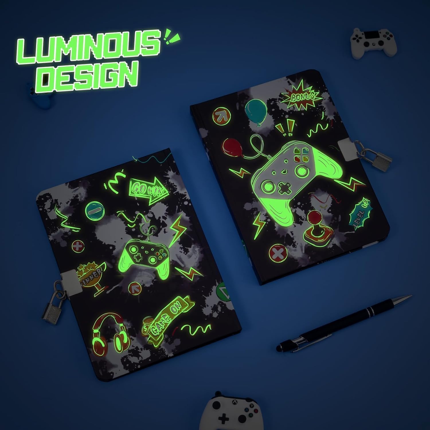 DUREVOLE E FUNZIONALE - Realizzato con materiali di alta qualità, il nostro diario in formato A5 presenta pagine a righe adatte sia per scrivere che per disegnare. Il design con copertina rigida offre resistenza e protezione per l'uso DIARIO DI GIOCO ILLUMINATO - Distinguiti con la copertina luminosa del diario dei videogiochi che si illumina al buio, rendendola una scelta accattivante e visivamente accattivante per i ragazzi. Aggiunge un elemento di eccitazione e intrigo. CONFEZIONE REGALO DI COMPLEANNO DI NATALE - Ideale per gli amanti dei videogiochi! Il set del diario per ragazzi comprende un quaderno A5, una penna e 2 adesivi. Ottimo per compleanni, vacanze o qualsiasi occasione speciale DIARIO SULLA PRIVACY DEI BAMBINI - Garantisci la privacy con il lucchetto e le chiavi inclusi, consentendo ai bambini di tenere i loro pensieri, segreti ed espressioni creative lontani da occhi indiscreti INCORAGGIA L'ESPRESSIONE CREATIVA - Ispira i ragazzi a esplorare i loro pensieri e la loro immaginazione con il nostro diario di gioco per ragazzi. Questo diario divertente e coinvolgente è progettato per incoraggiare la creatività attraverso la scrittura
