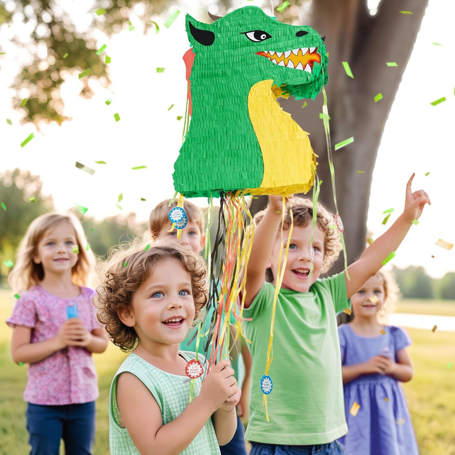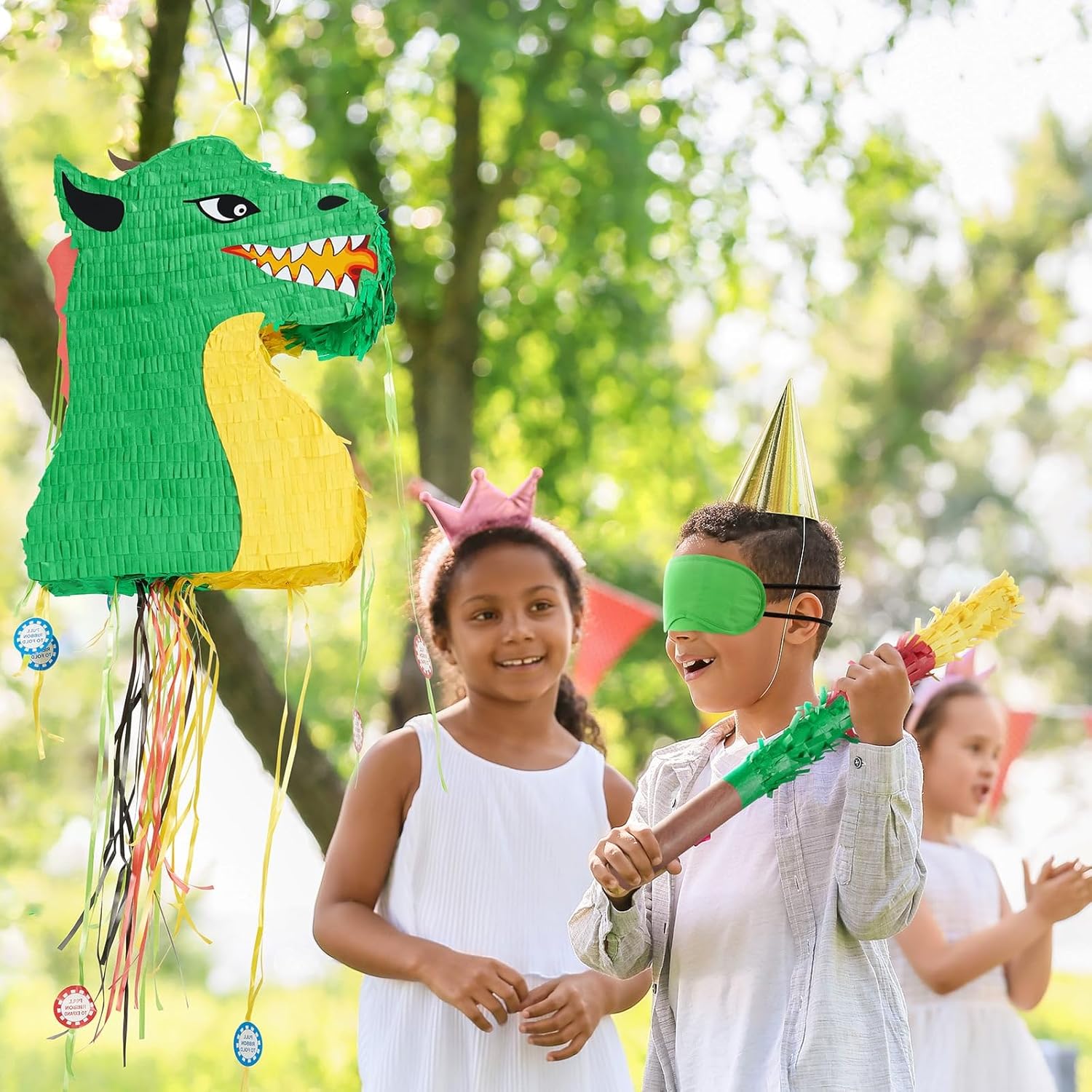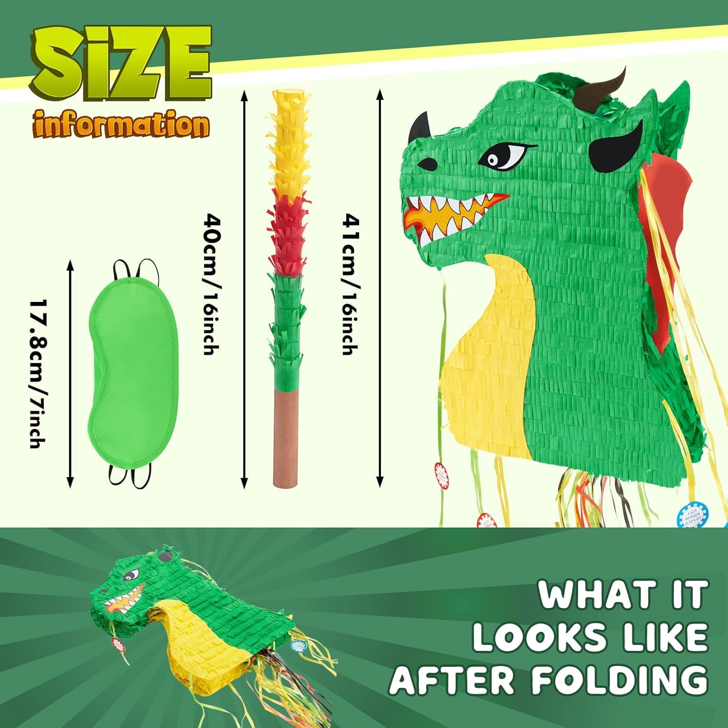 Pignata a forma di drago: organizziamo una festa fantastica. La nostra pignatta a forma di drago è un modo divertente per interagire con gli ospiti a una festa. Decora la tua festa di dinosauro con questa graziosa pignatta e crea ricordi indimenticabili per i tuoi ospiti Facile da riempire: la pignatta pieghevole a forma di drago misura 41 cm di altezza x 31,9 cm di larghezza. È possibile riempire fino a 1,4 kg di riempitivi per pignatta, caramelle o giocattoli. C'è un foro prefabbricato e un anello per appendere nella parte superiore della pignatta, si può facilmente appendere ovunque tu voglia Qualità premium: questa pignatta per ragazzi è realizzata in cartone ondulato di alta qualità, impreziosita da adesivi dai colori vivaci e nastri colorati. Il materiale leggero assicura anche che la pignatta possa essere piegata per riporla e trasportarla Combinazione delicata: questo gioco da festa per bambini contiene una pignatta a forma di drago, una maschera per gli occhi verde abbinata e 1 bastone. Con le nostre forniture per feste pignatta, preparati per un gioco divertente senza preparazione aggiuntiva Decorazione versatile: perfetta per feste di bambini e riunioni festive, la nostra pignatta di compleanno per ragazzi è una decorazione versatile che rende la tua festa indimenticabile. Inoltre è possibile utilizzarlo come decorazione per la casa o come accessorio fotografico per renderlo un'aggiunta che eleverà istantaneamente l'atmosfera