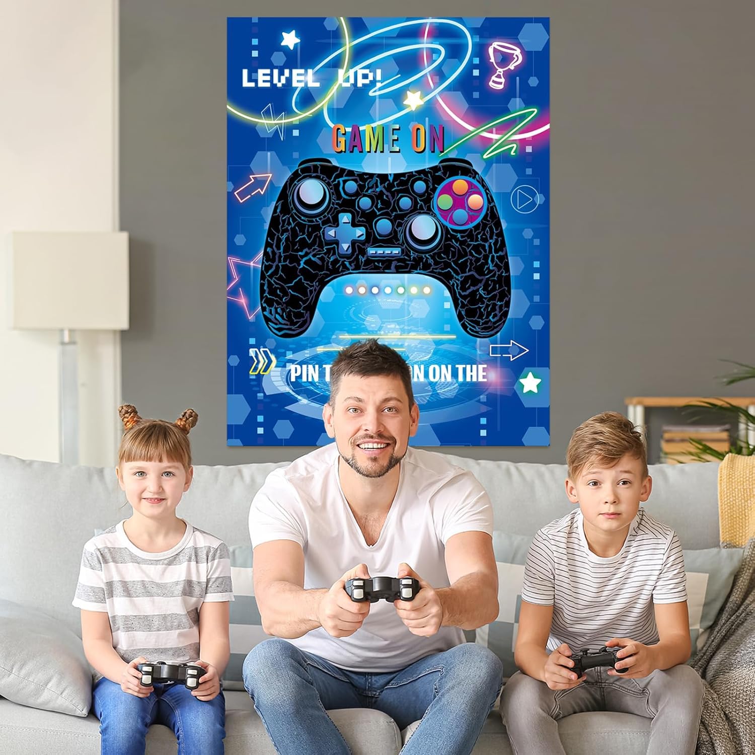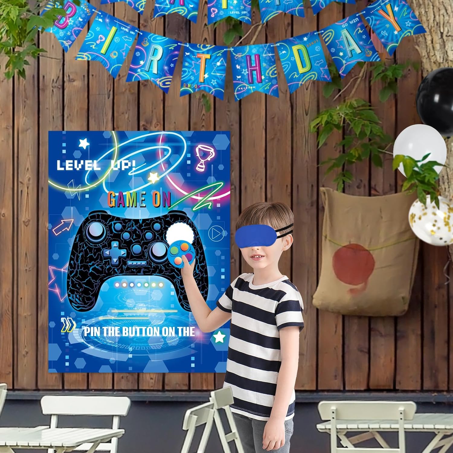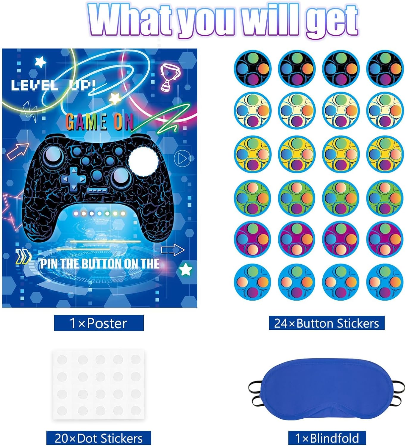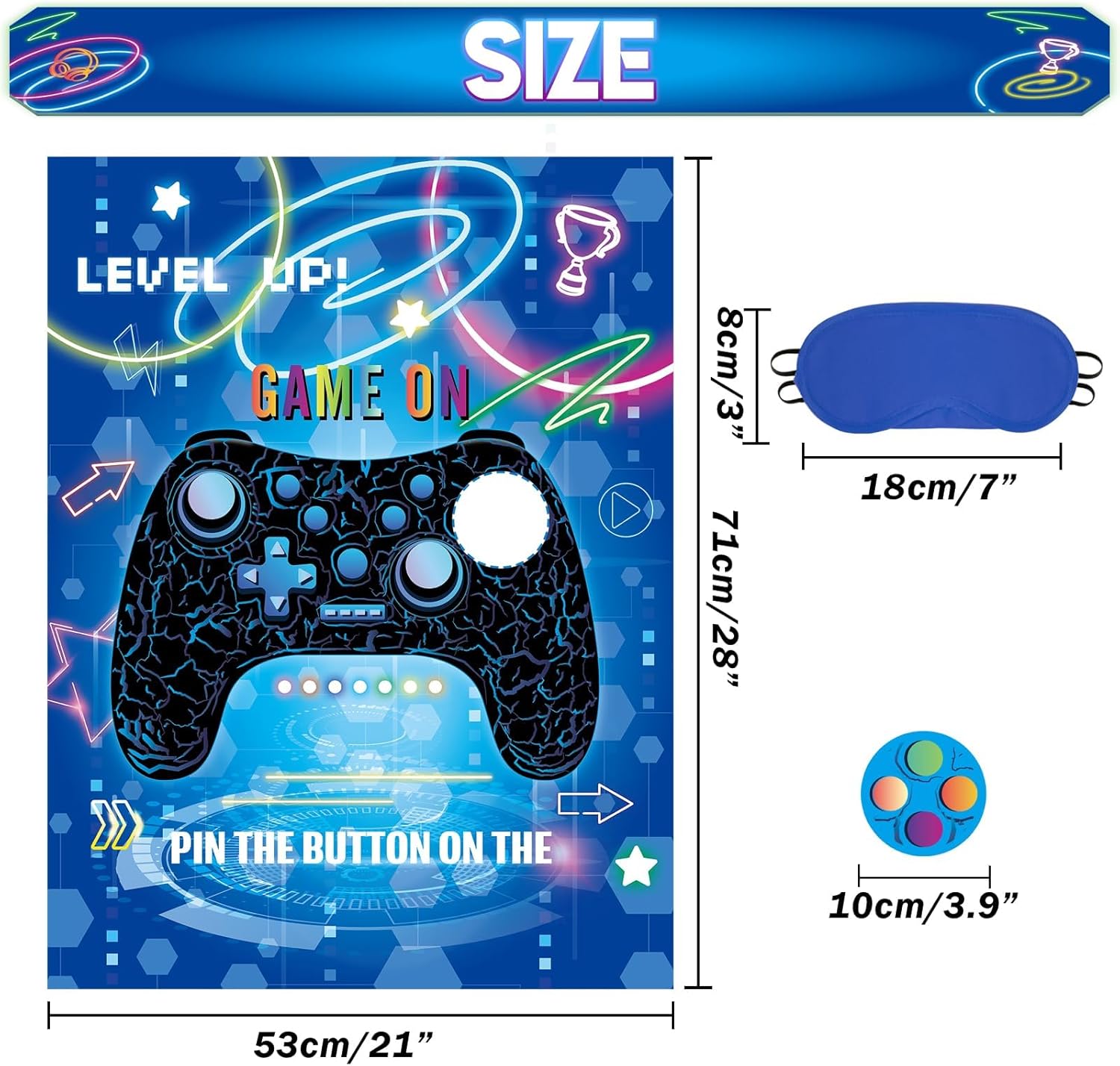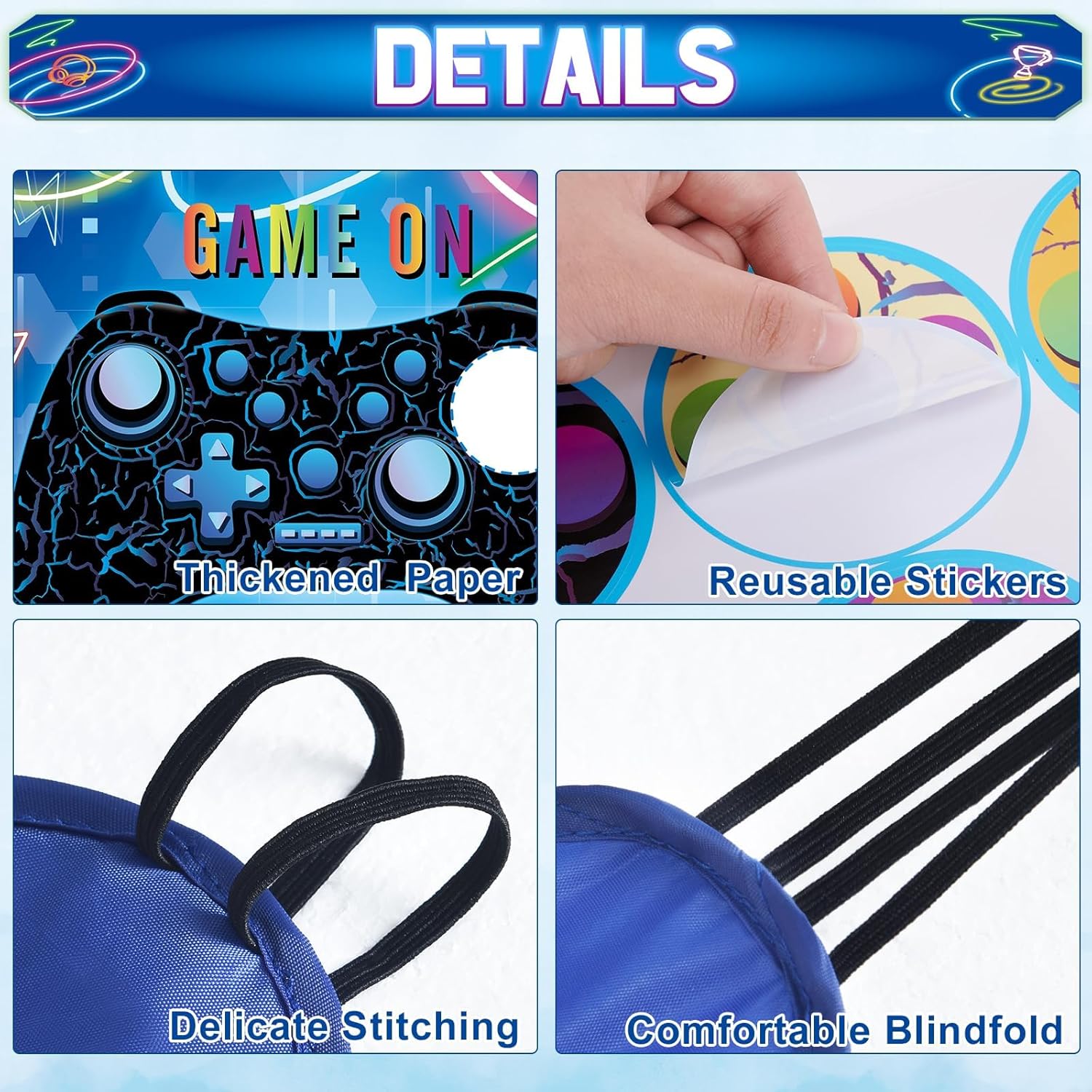 TEMA VIDEO GIOCO: il nostro gioco per feste per bambini progettato con controller di gioco fresco e classico. Trasforma la festa del tuo ragazzo in una celebrazione di gioco con il set di videogiochi per feste! Contenuto della confezione: include 1 poster decorativo da gioco, 24 adesivi con simboli della pace con simpatici disegni a bottone, una benda e 20 adesivi a punti di colla. Materiali: il poster, realizzato in carta patinata di alta qualità, è spesso e abbastanza robusto per un uso ripetuto. Le 24 corna sono anche riutilizzabili, facili da attaccare e staccare. Come giocare: incollare il poster del videogioco sulla parete con punti di colla, quindi indossare la benda, prendere un adesivo pulsante giocatore e fissarlo sul controller di gioco, chi è più vicino di chi è il vincitore. Decorazione versatile per feste: non solo un divertente gioco per feste per bambini, questo gioco di coda può anche essere colorato decorazione per feste per bambini, oggetti di scena decorativi da parete per aggiungere un tocco di atmosfera eccitante e fresca a qualsiasi spazio.