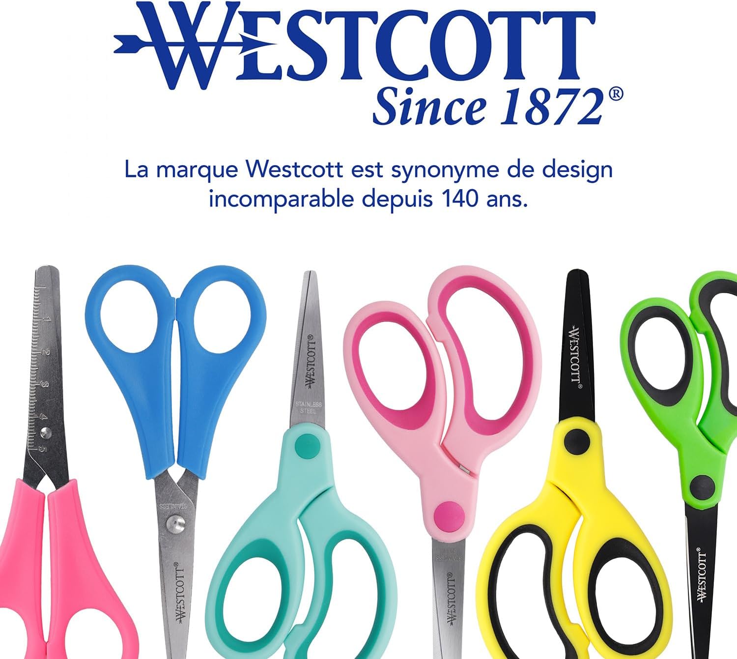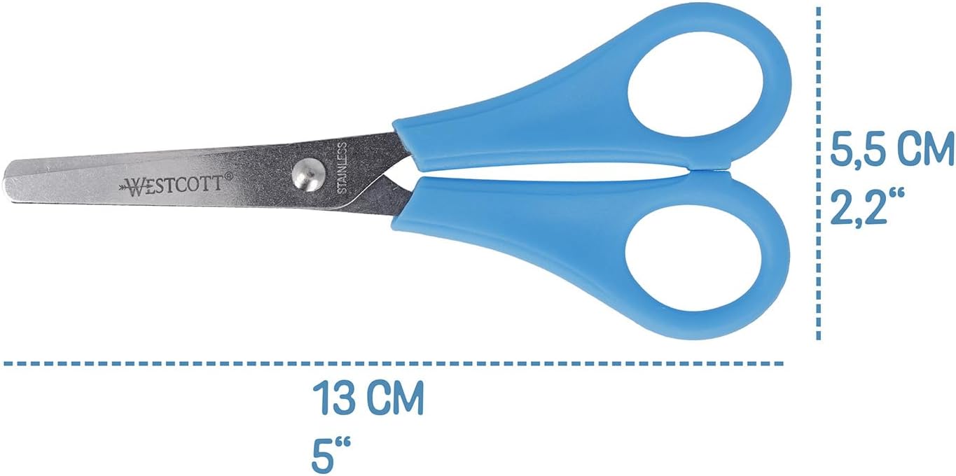 Scala incorporata da 5 cm: la lama delle forbici ha una pratica scala che può essere utilizzata come righello. Punta arrotondata - La punta arrotondata delle forbici garantisce la massima sicurezza e protegge da infortuni, rendendole ideali per i primi tentativi di taglio dei bambini. Dimensioni compatte - Con una lunghezza di 13 cm (5"), le forbici si adattano perfettamente alle dimensioni delle mani dei bambini e facilitano un taglio preciso. Materiali durevoli - La lama in acciaio inossidabile di alta qualità garantisce una lunga durata e un taglio preciso e duraturo. Qualità dal 1872 - Da oltre 140 anni il marchio Westcott è sinonimo di prodotti per la casa e l'ufficio con un design unico e un rapporto qualità-prezzo incomparabile.